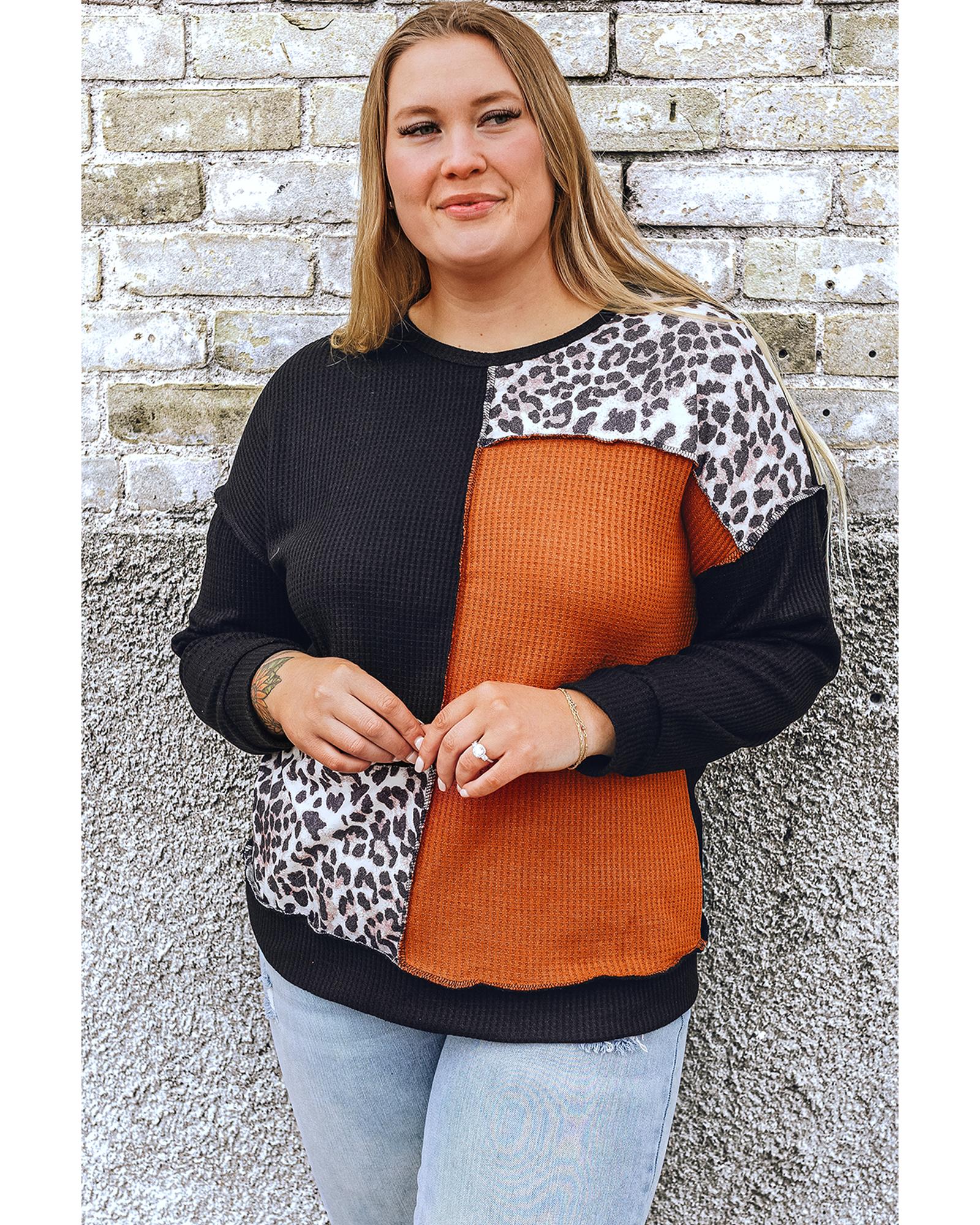 Black Orange Colorblock Leopard Patchwork Waffle Knit Plus Size Top – 1X