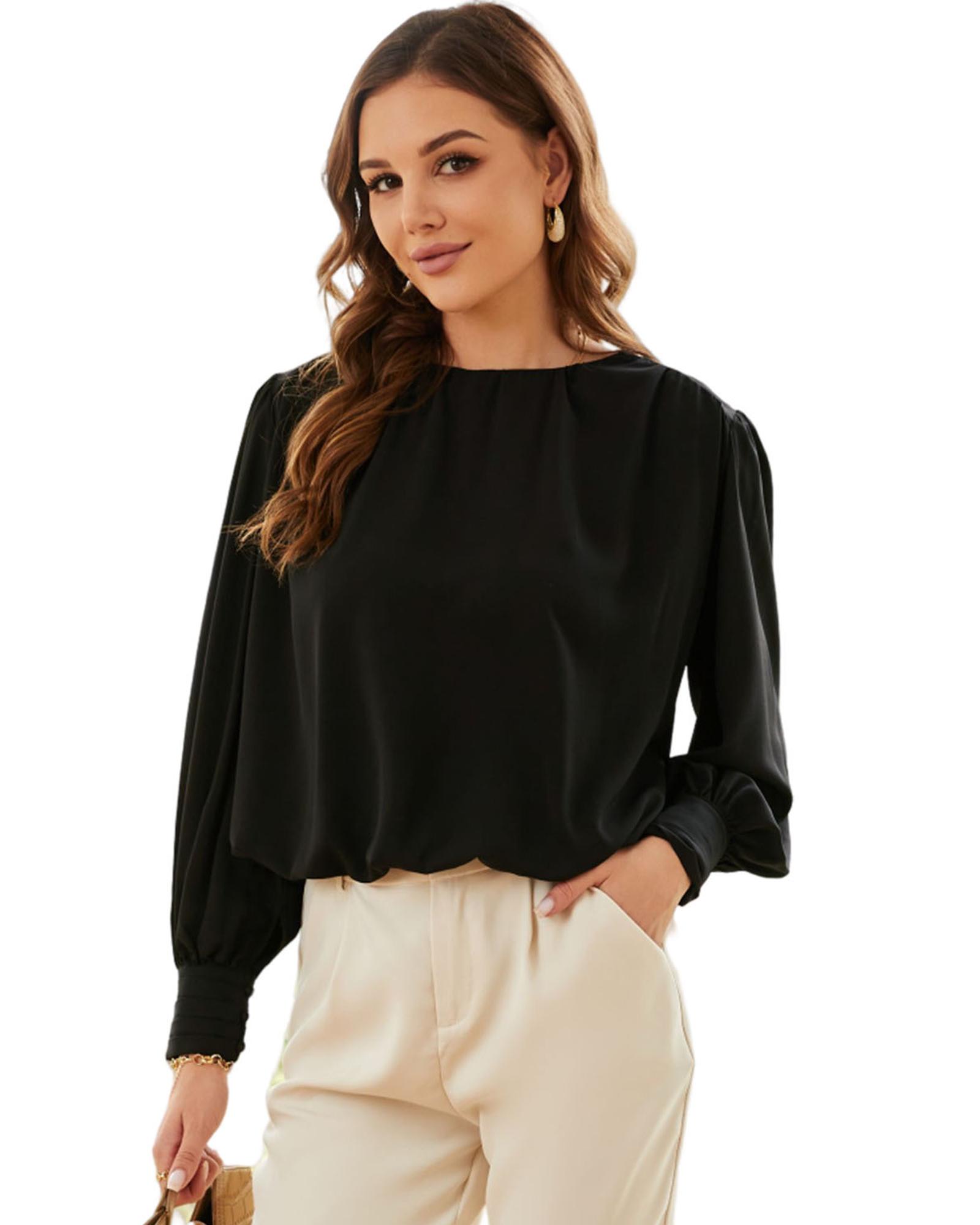 Black Padded Shoulder Buttoned Cuffs Pleated Loose Blouse – L
