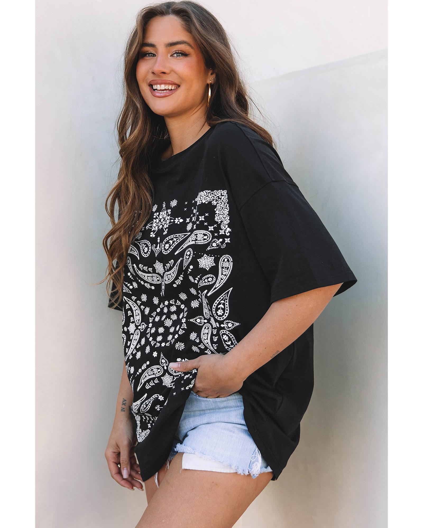 - Black Paisley Print Crew Neck Loose Fit Tunic Tee