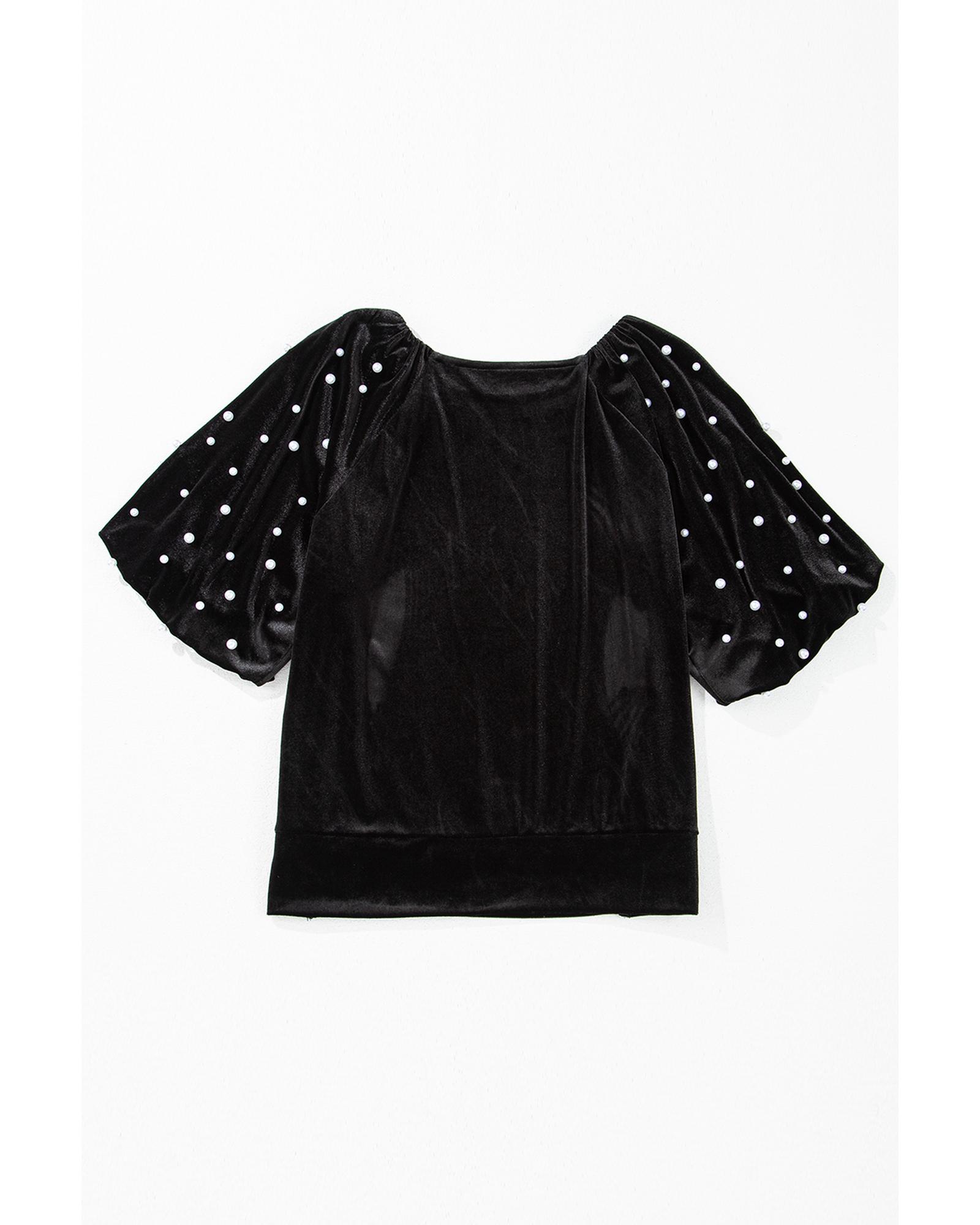 Black Pearl Beaded Half Sleeve Velvet Top – S