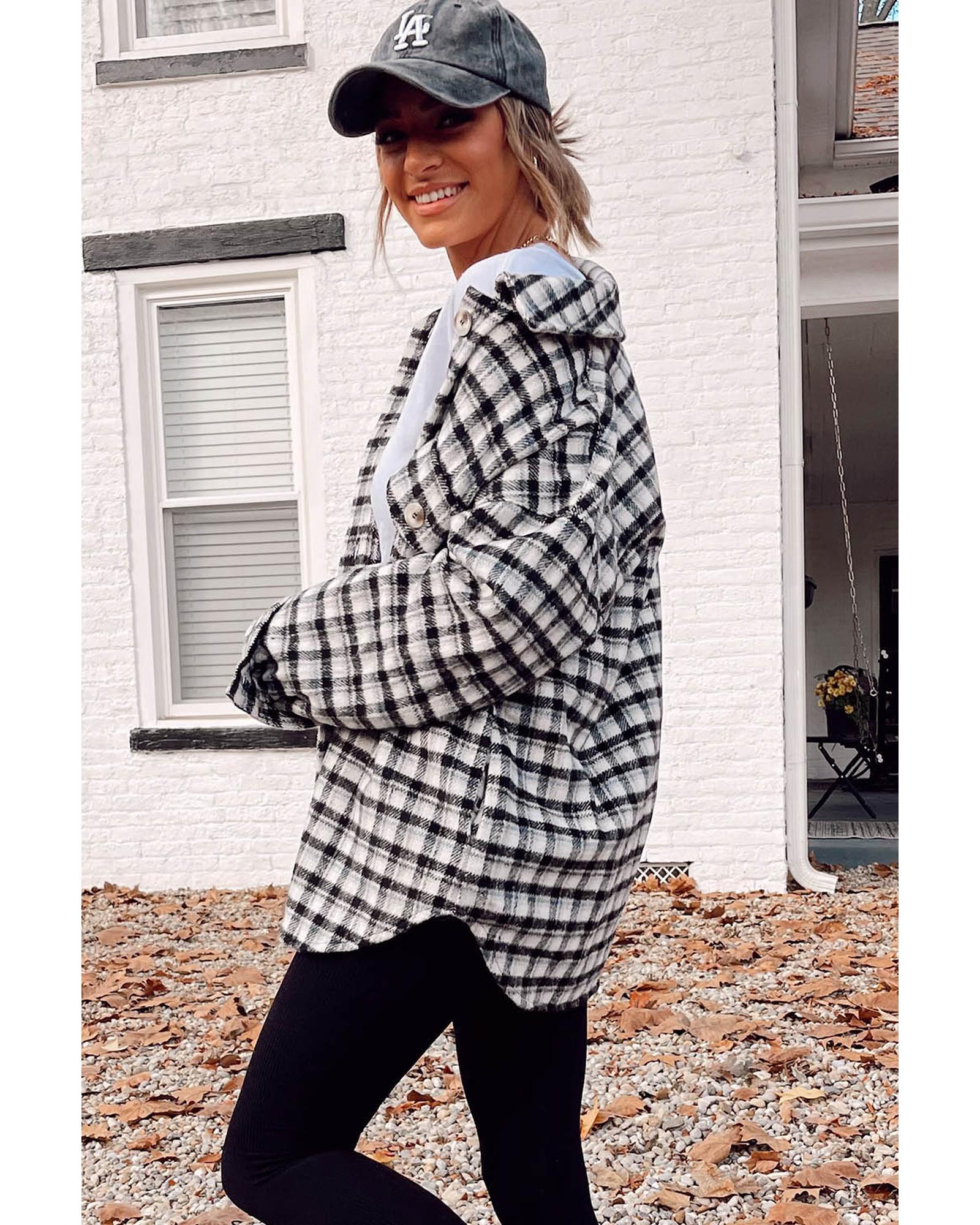 Black Plaid Print Chest Pockets Buttoned Tunic Shacket – L