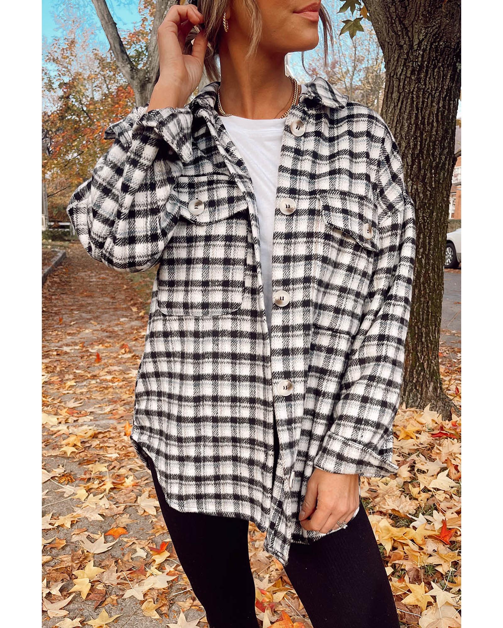 Black Plaid Print Chest Pockets Buttoned Tunic Shacket - L