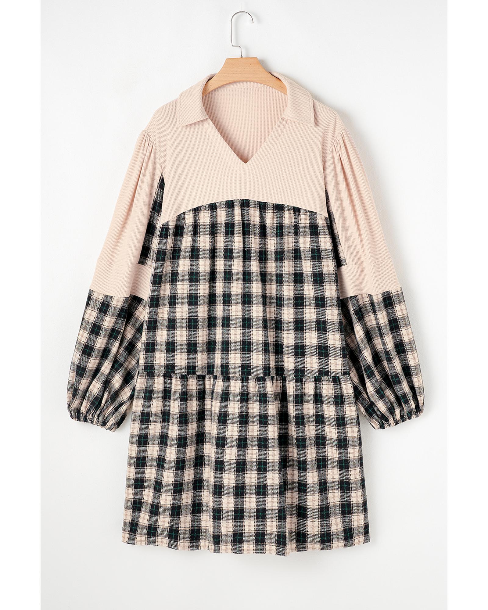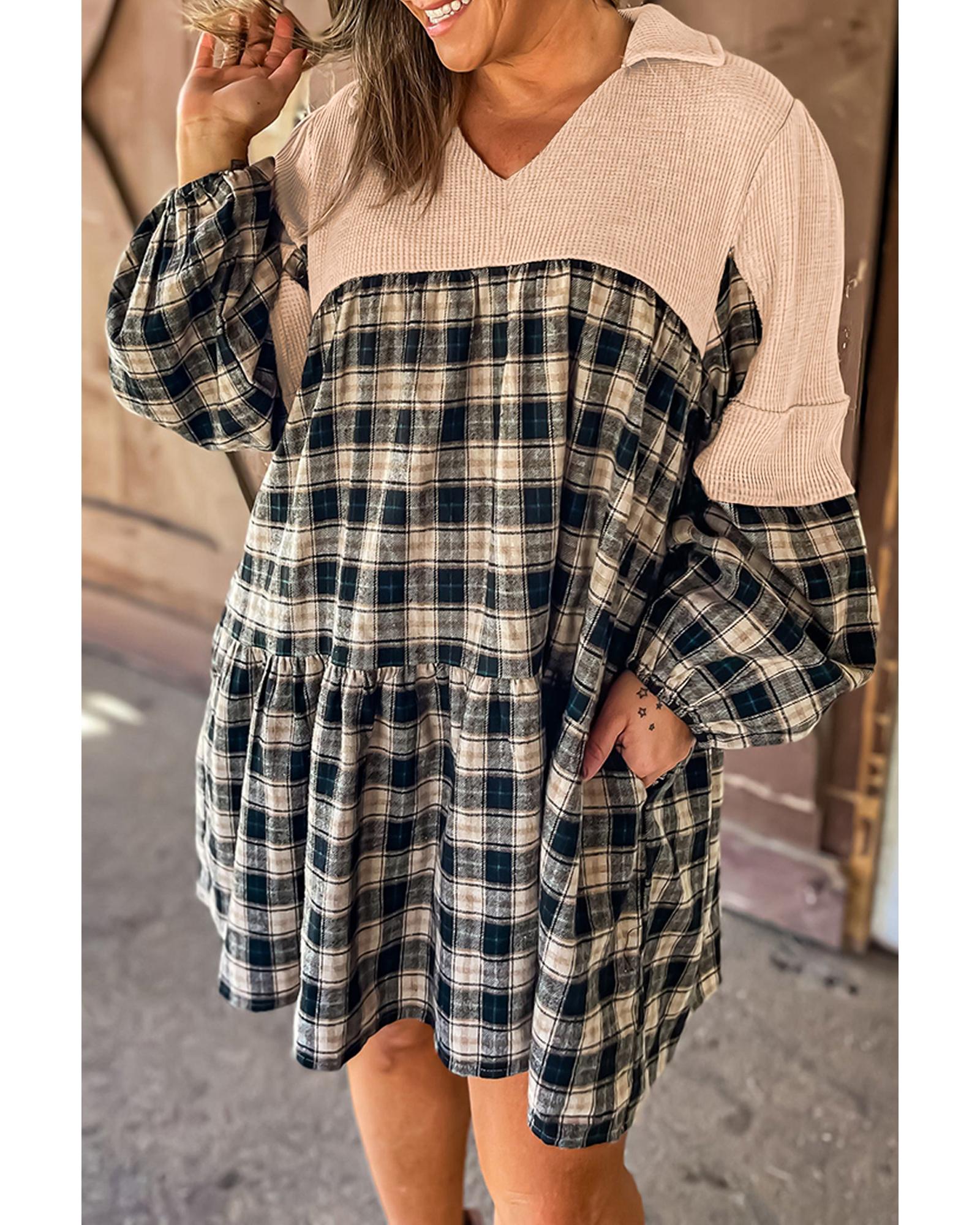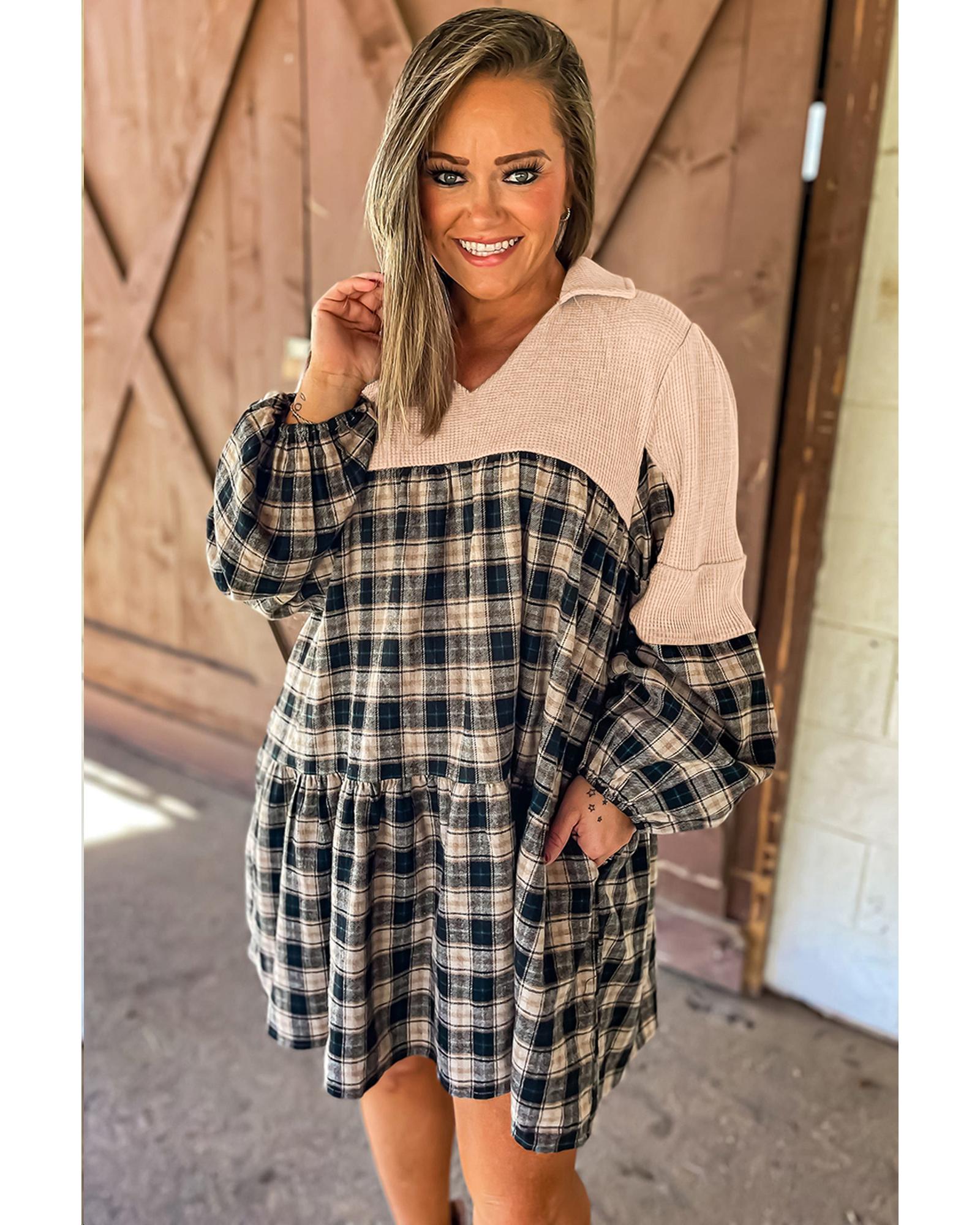 Black Plaid Waffle Knit Patchwork Collared V Neck Plus Size Mini Dress – 3X