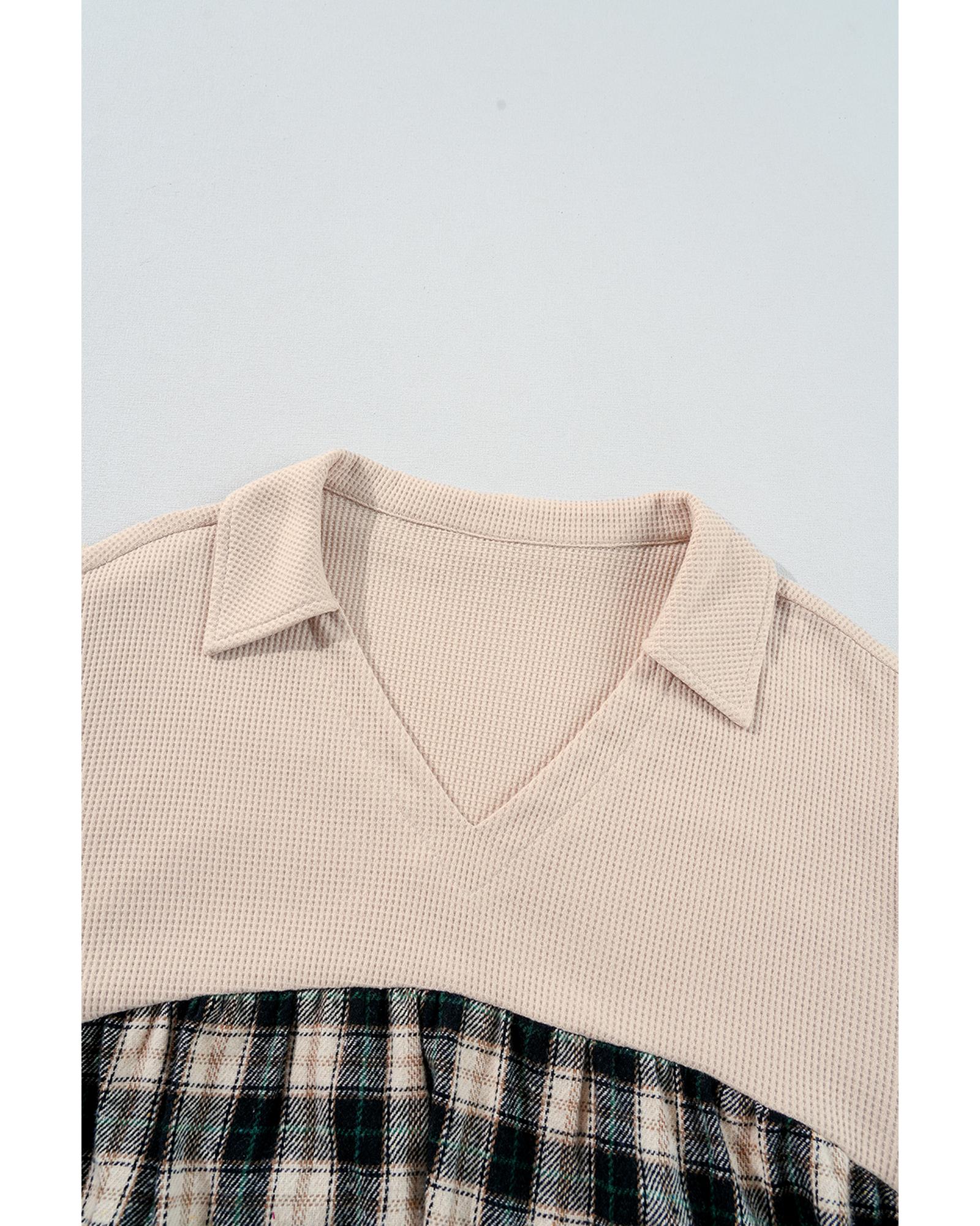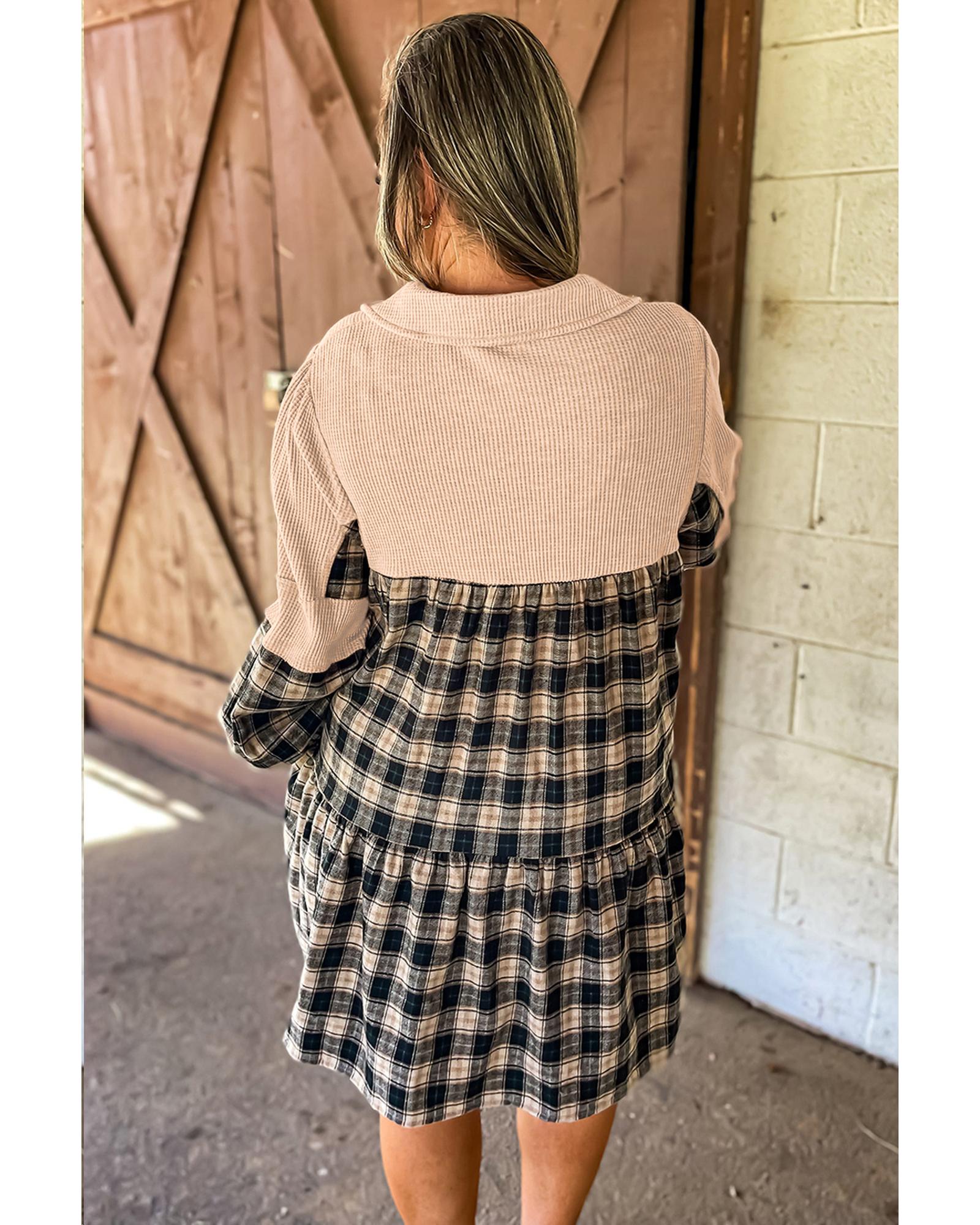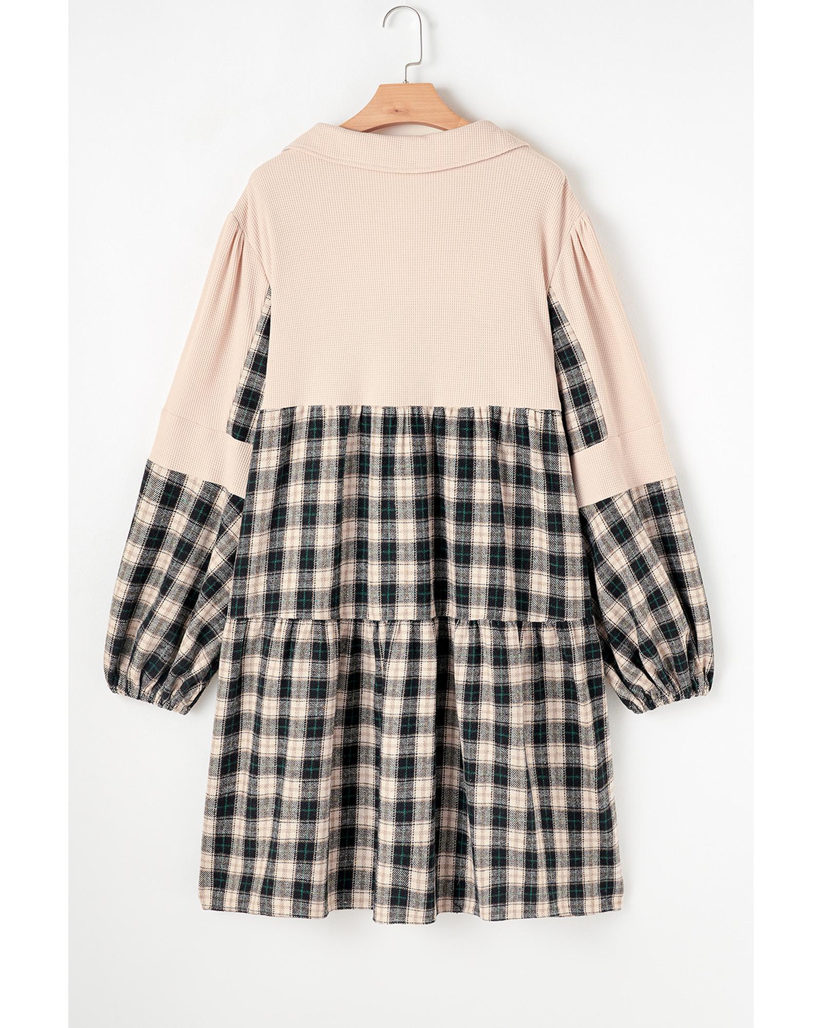 Black Plaid Waffle Knit Patchwork Collared V Neck Plus Size Mini Dress – 3X