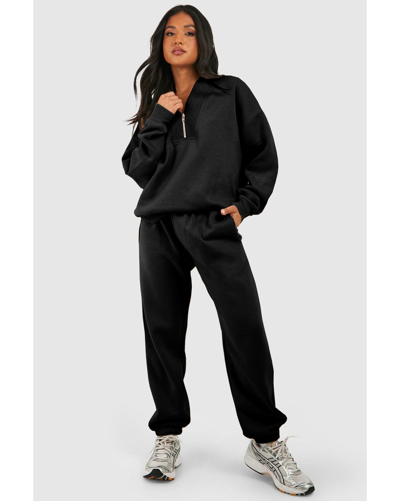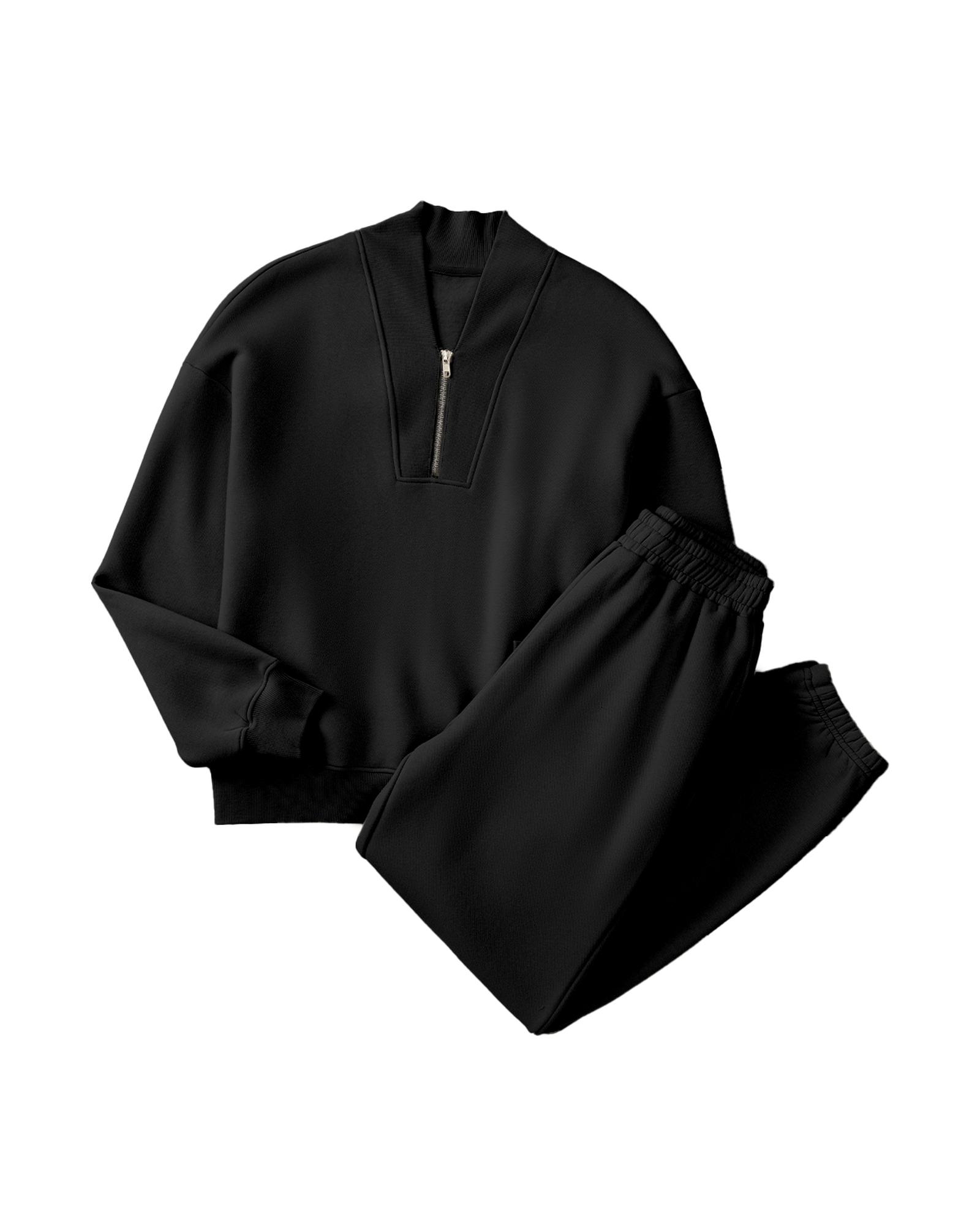 Black Plain Half Zip V Neck Ribbed Edge Loose Tracksuit – XL