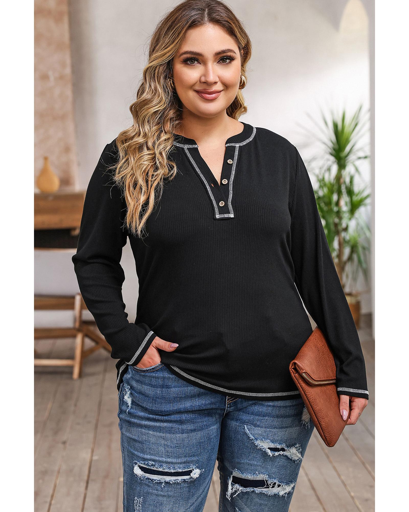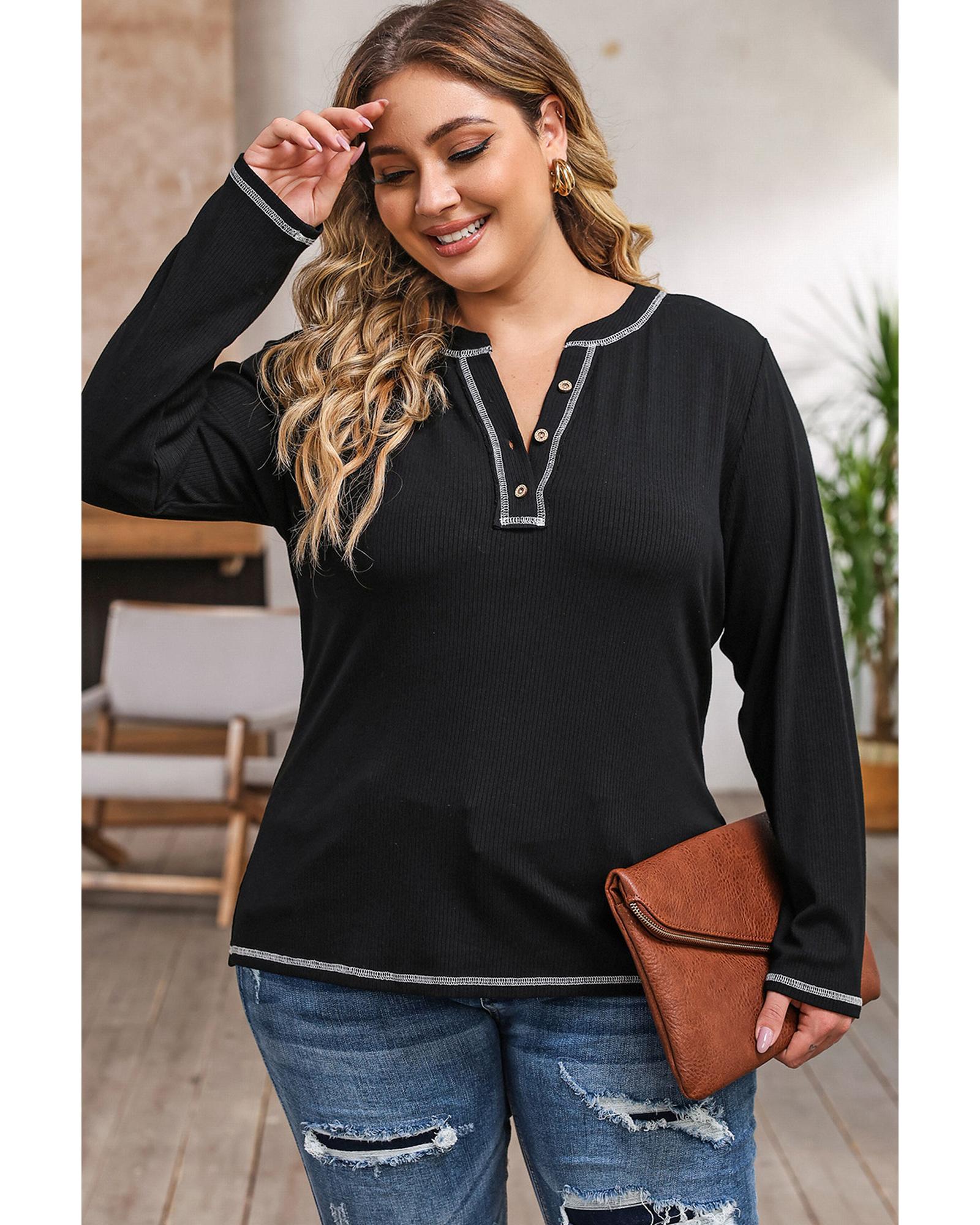 Black Plus Size Contrasting Topstitch Ribbed Henley Top – 2X