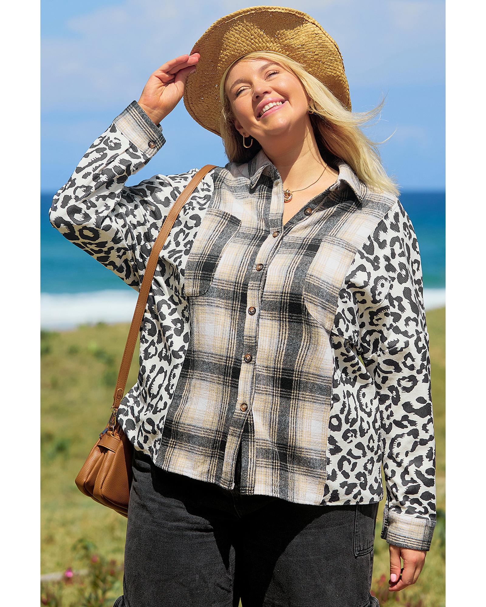 Black Plus Size Plaid Leopard Printed Patchwork Button Up Shacket – 2X
