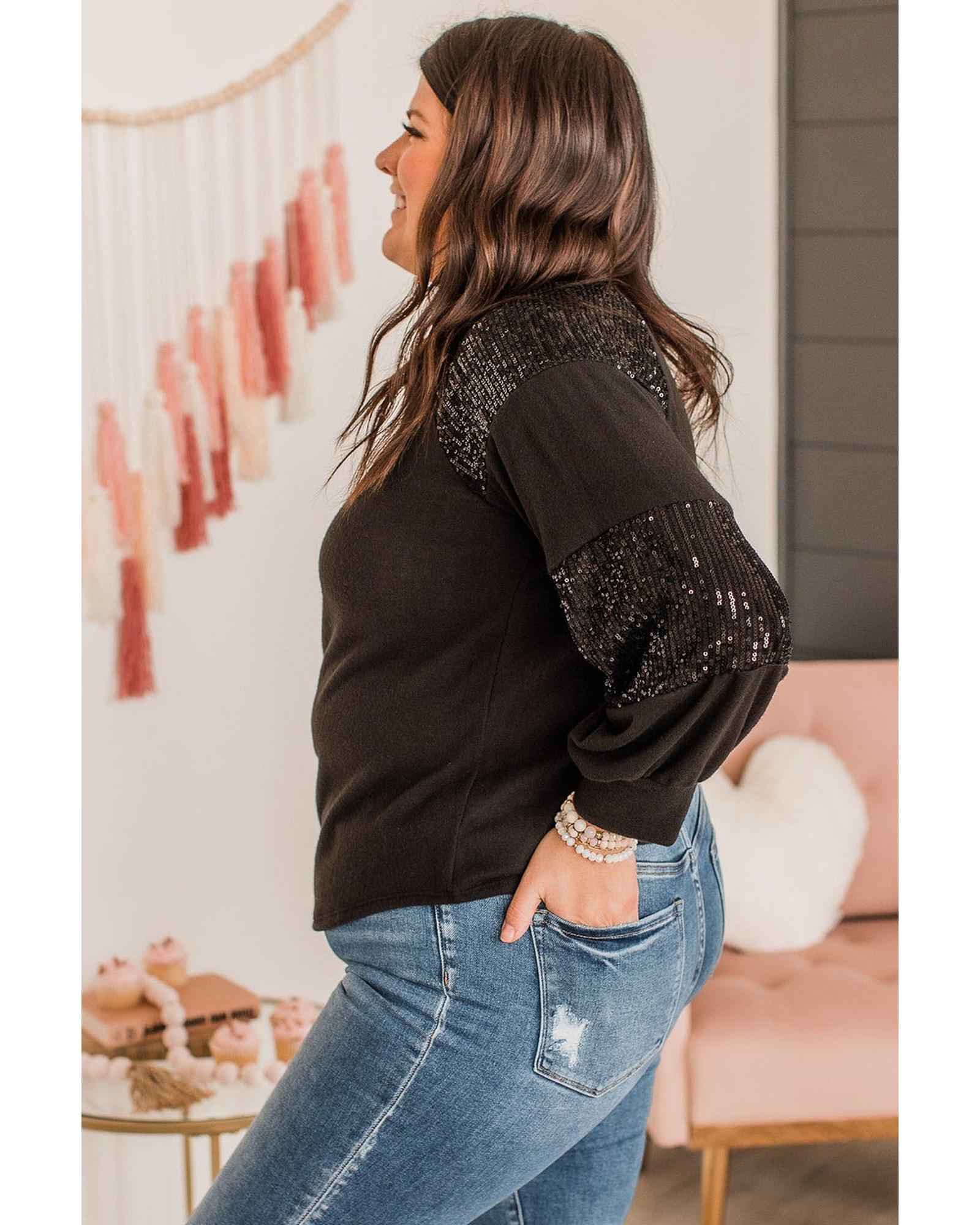 Black Plus Size Sequin Patchwork Crew Neck Long Sleeve Top – 2X