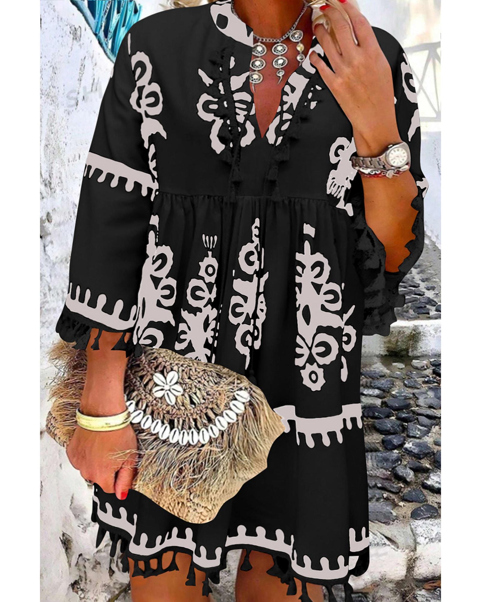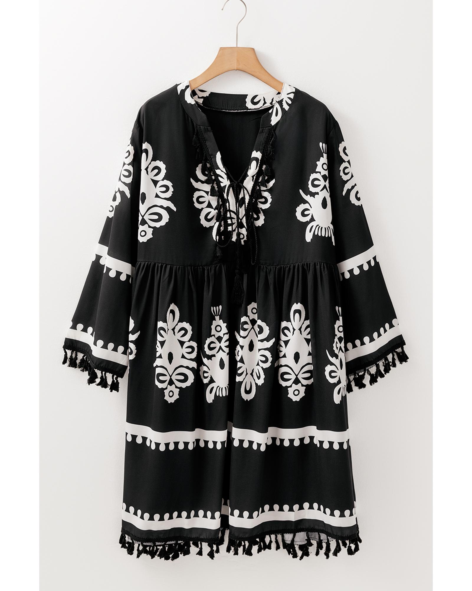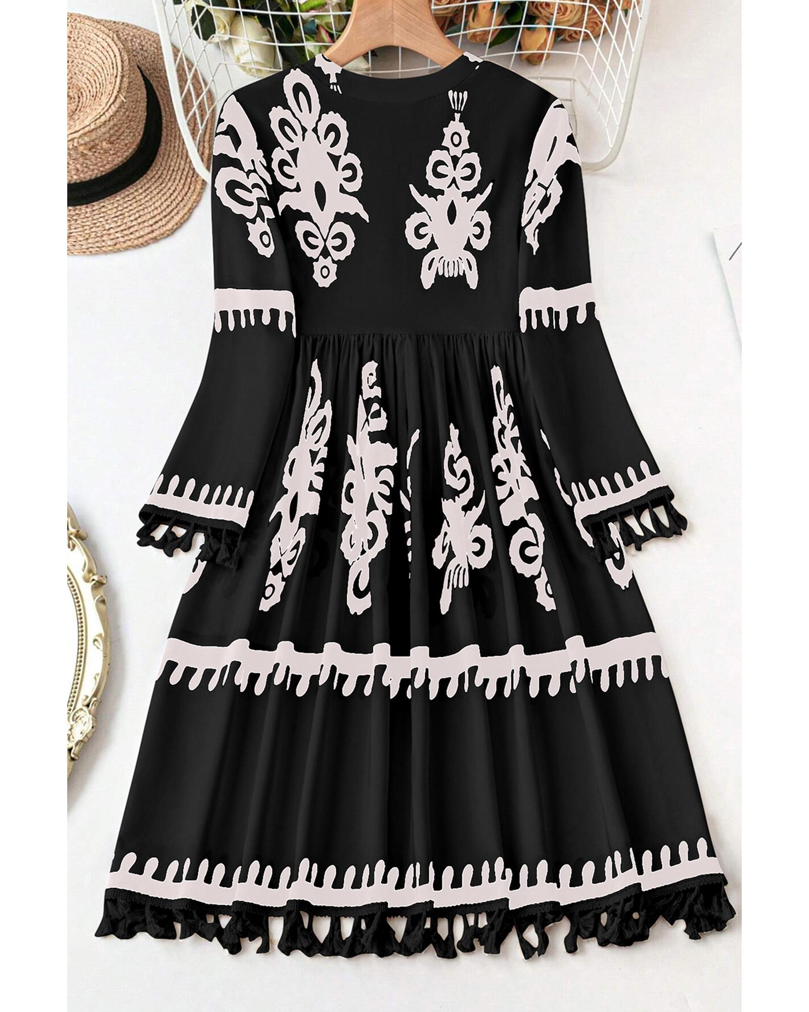 - Black Plus Size Western Floral Print Fringed V Neck Dress