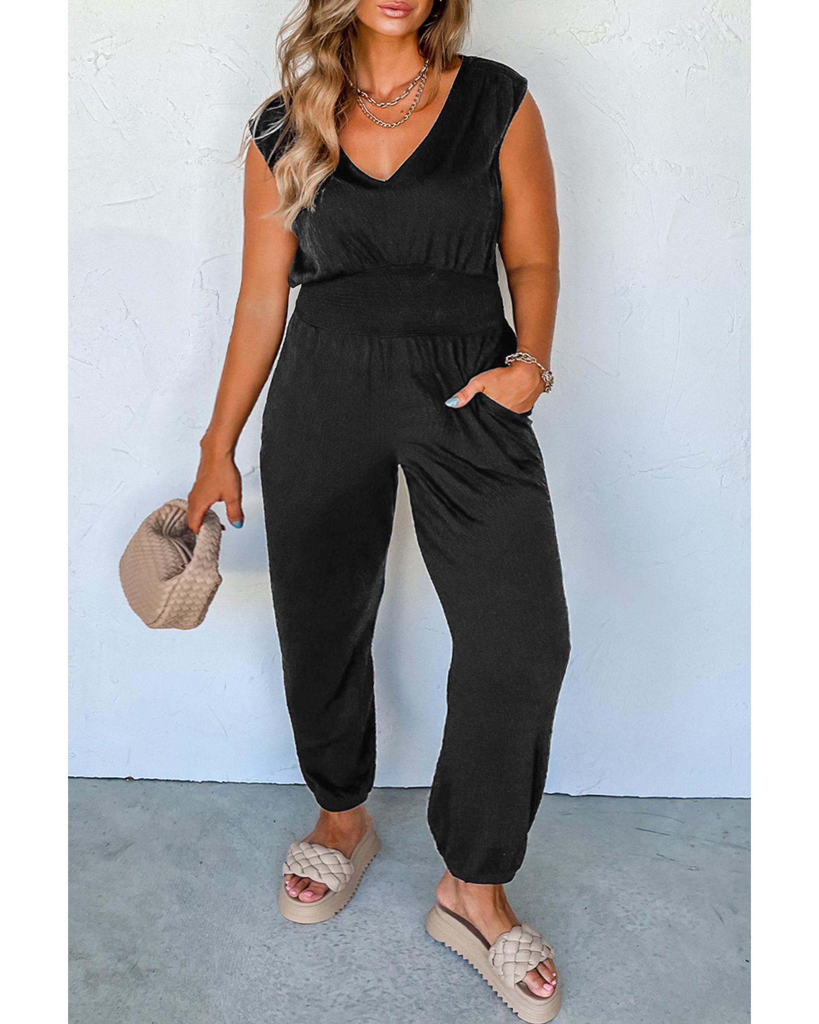 Black Plus Smocked High Waist Sleeveless V Neck Jumpsuit – 3X