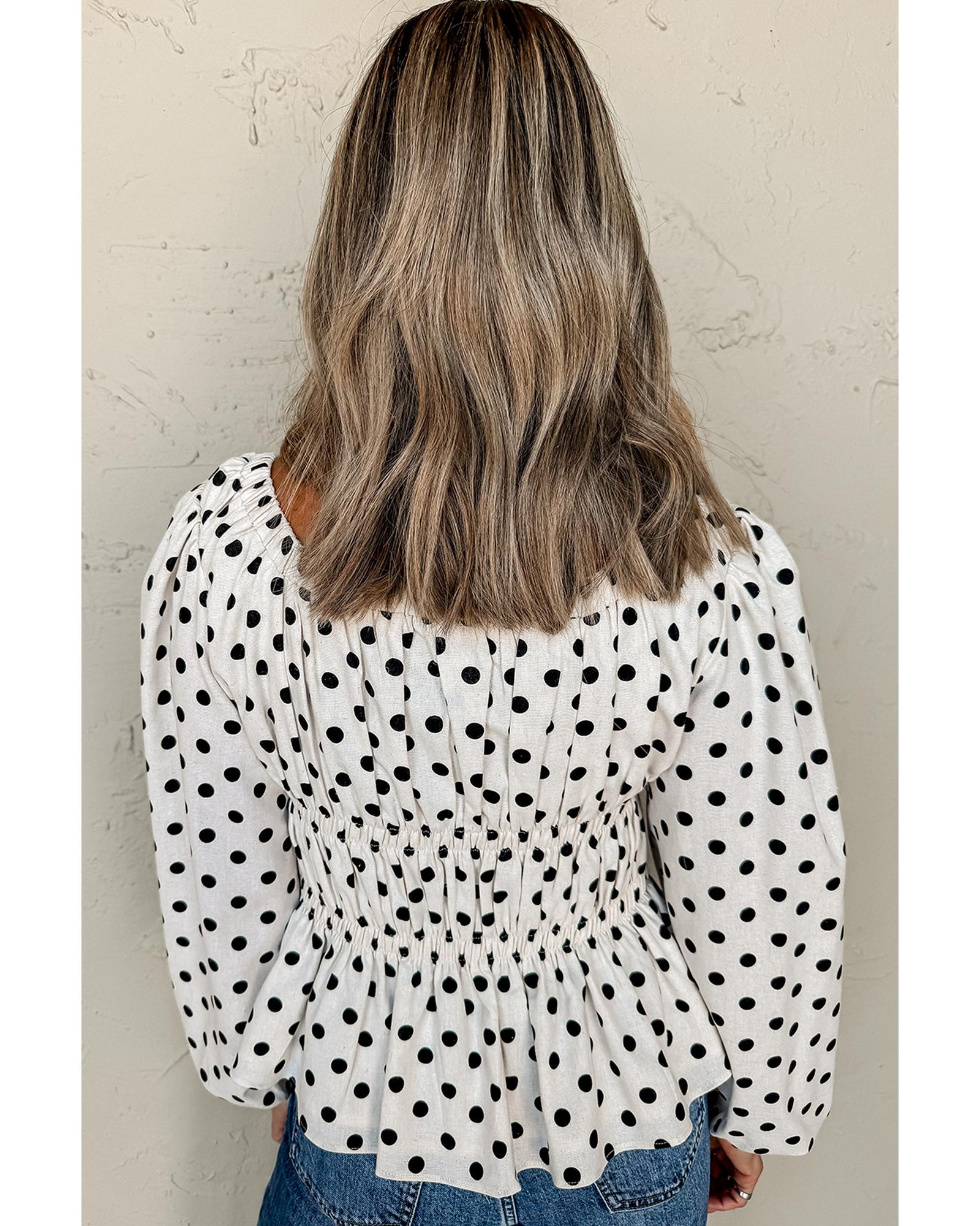 Black Polka Dot Puff Sleeve Bow Square Neck Peplum Top – M