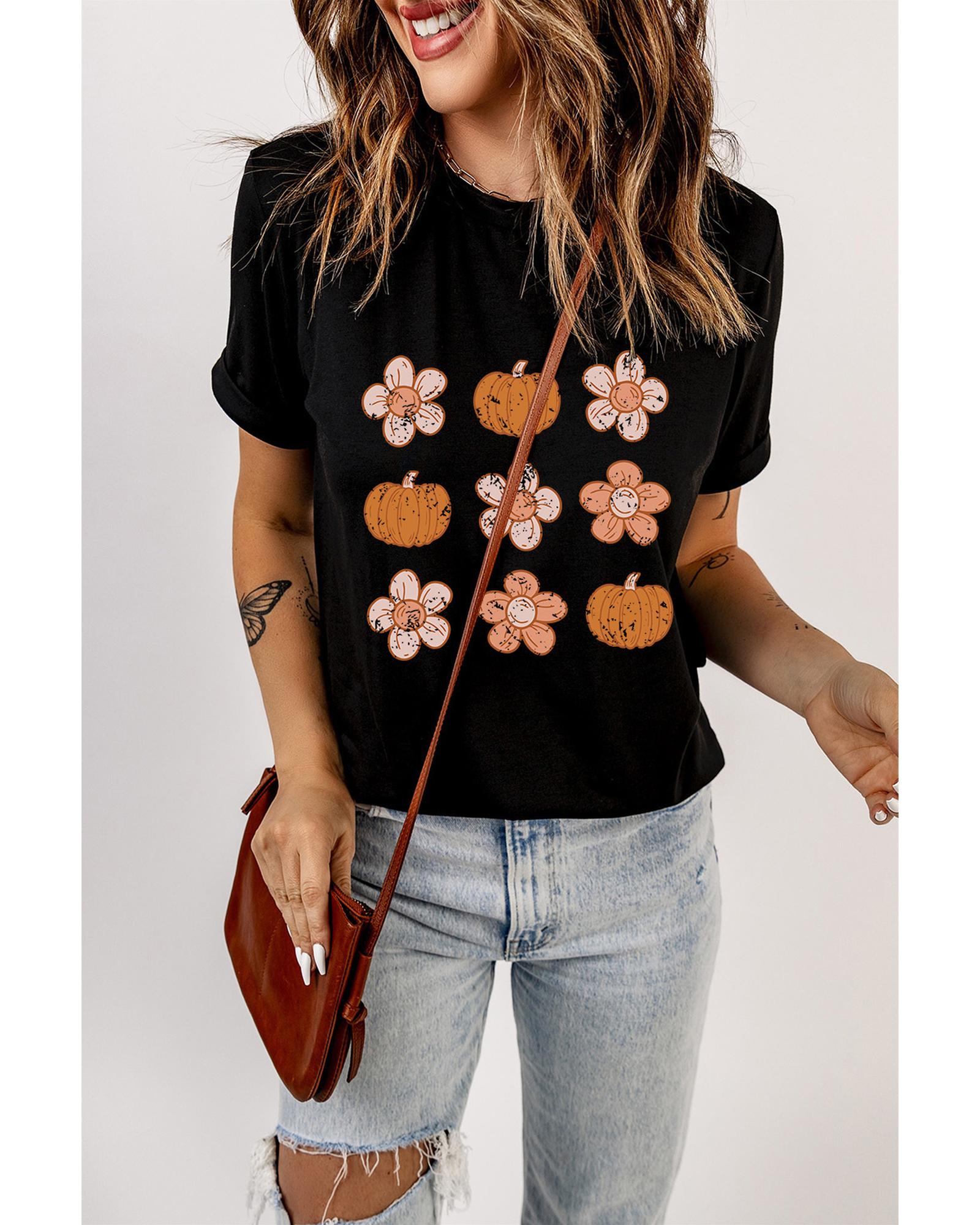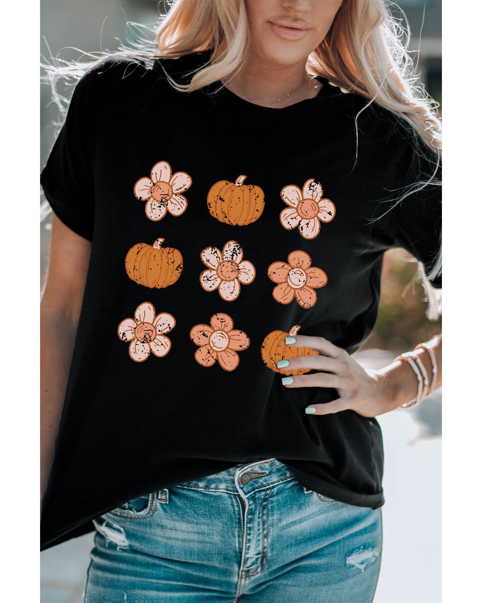 Stylish and trendy Black Pumpkin Flower Print Short Sleeve Graphic Top Made with high - quality materials for a comfortable fit Flattering silhouette enhances your figure Unique pumpkin flower print adds a touch of femininity Versatile and easy to style for casual or dressier occasions Available in various sizes for the perfect fit