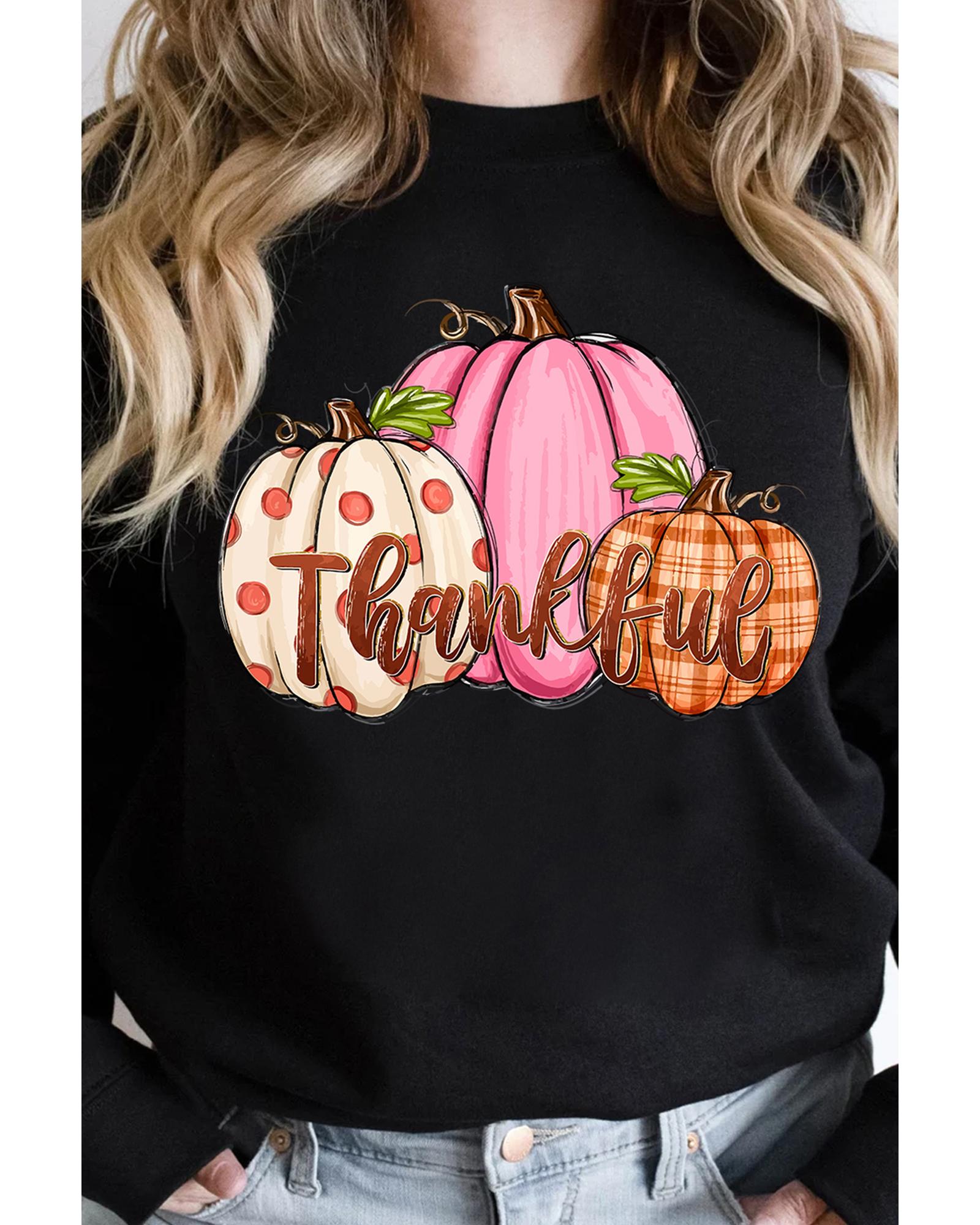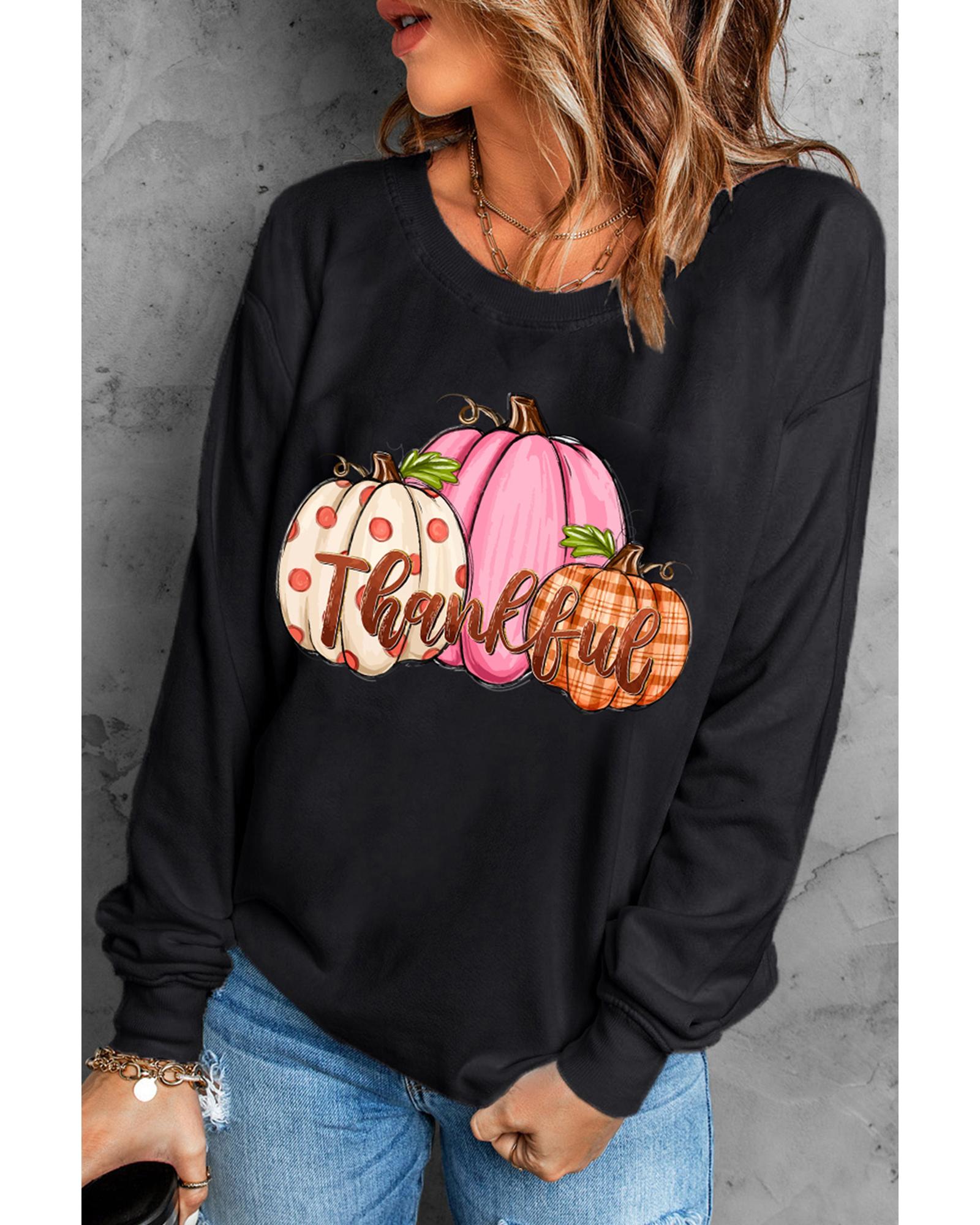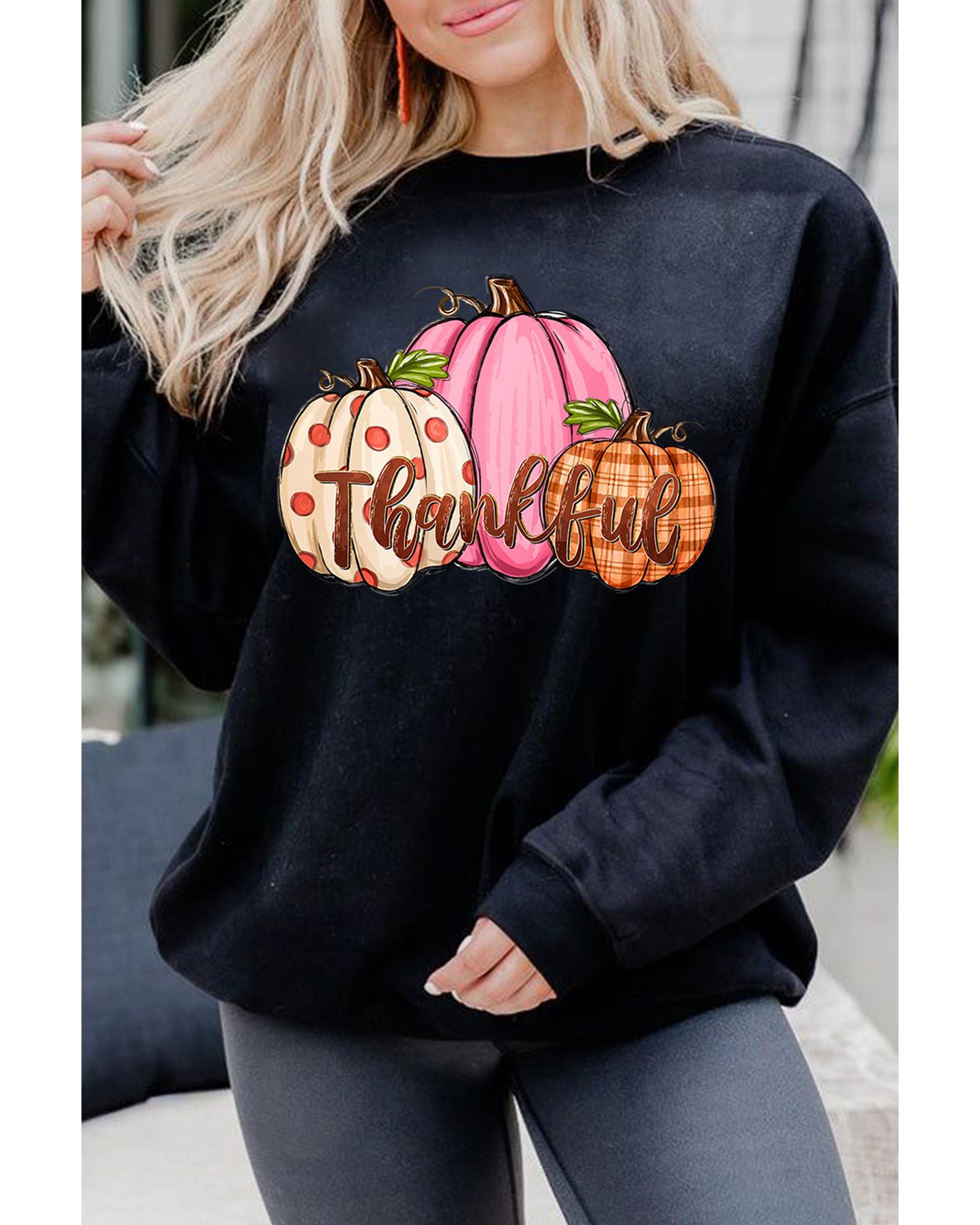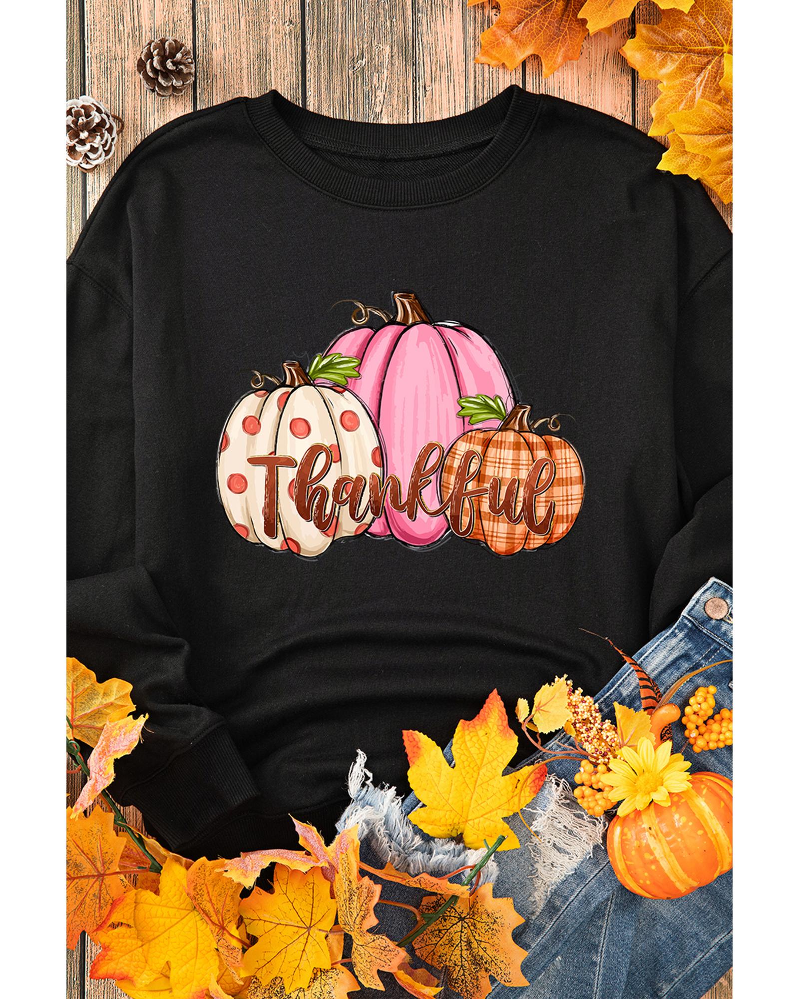 Black Pumpkin Thankful Drop Shoulder Thanksgiving Pullover Sweatshirt – S