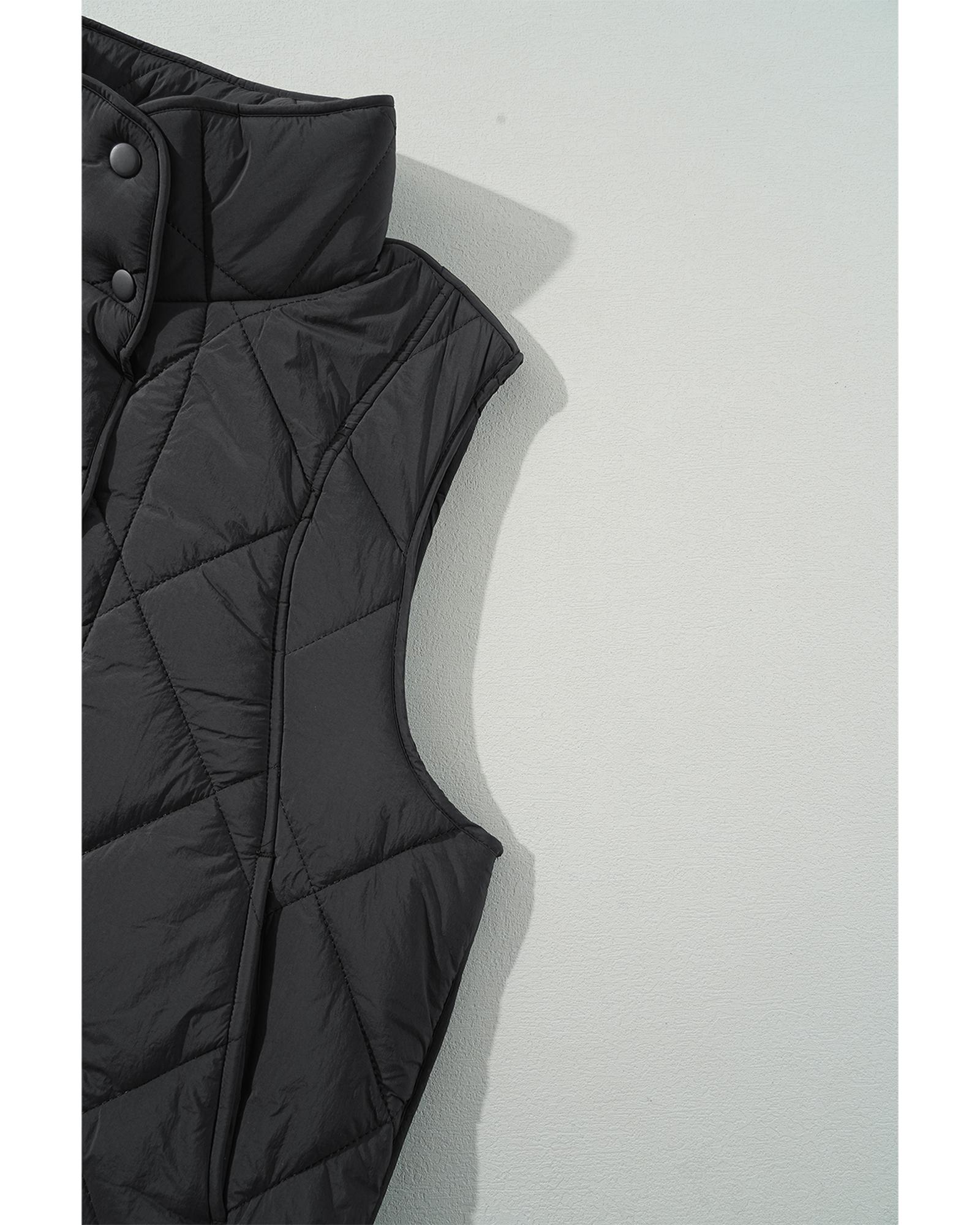 - Black quilted high neck button up pocket vest coat