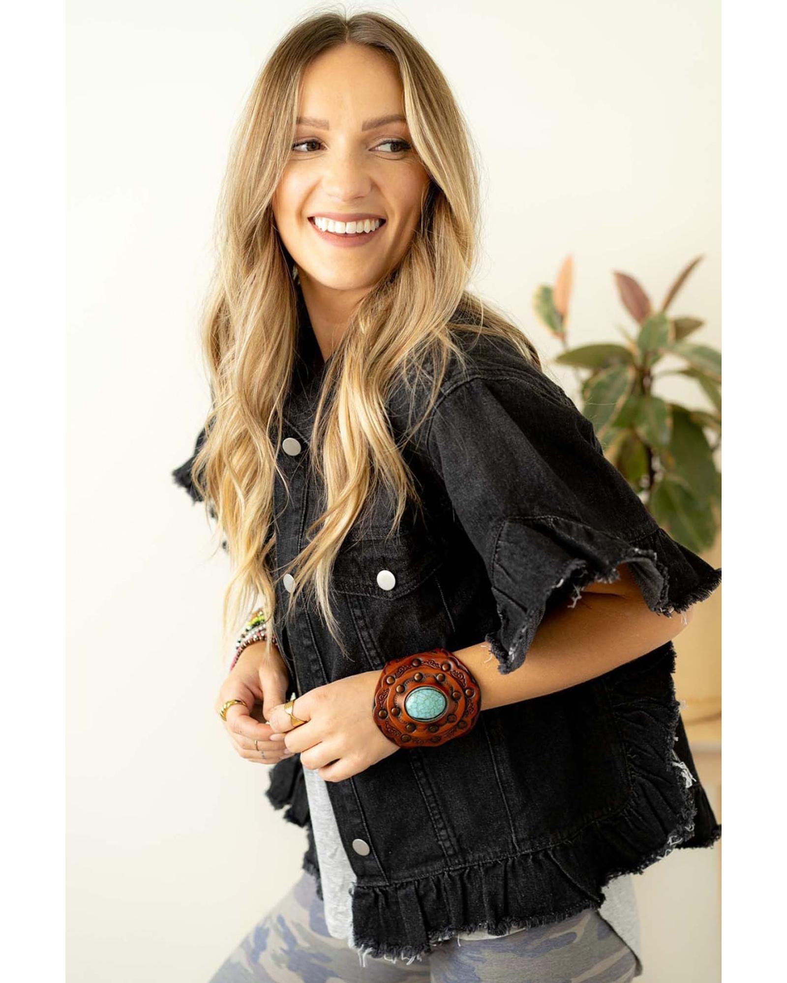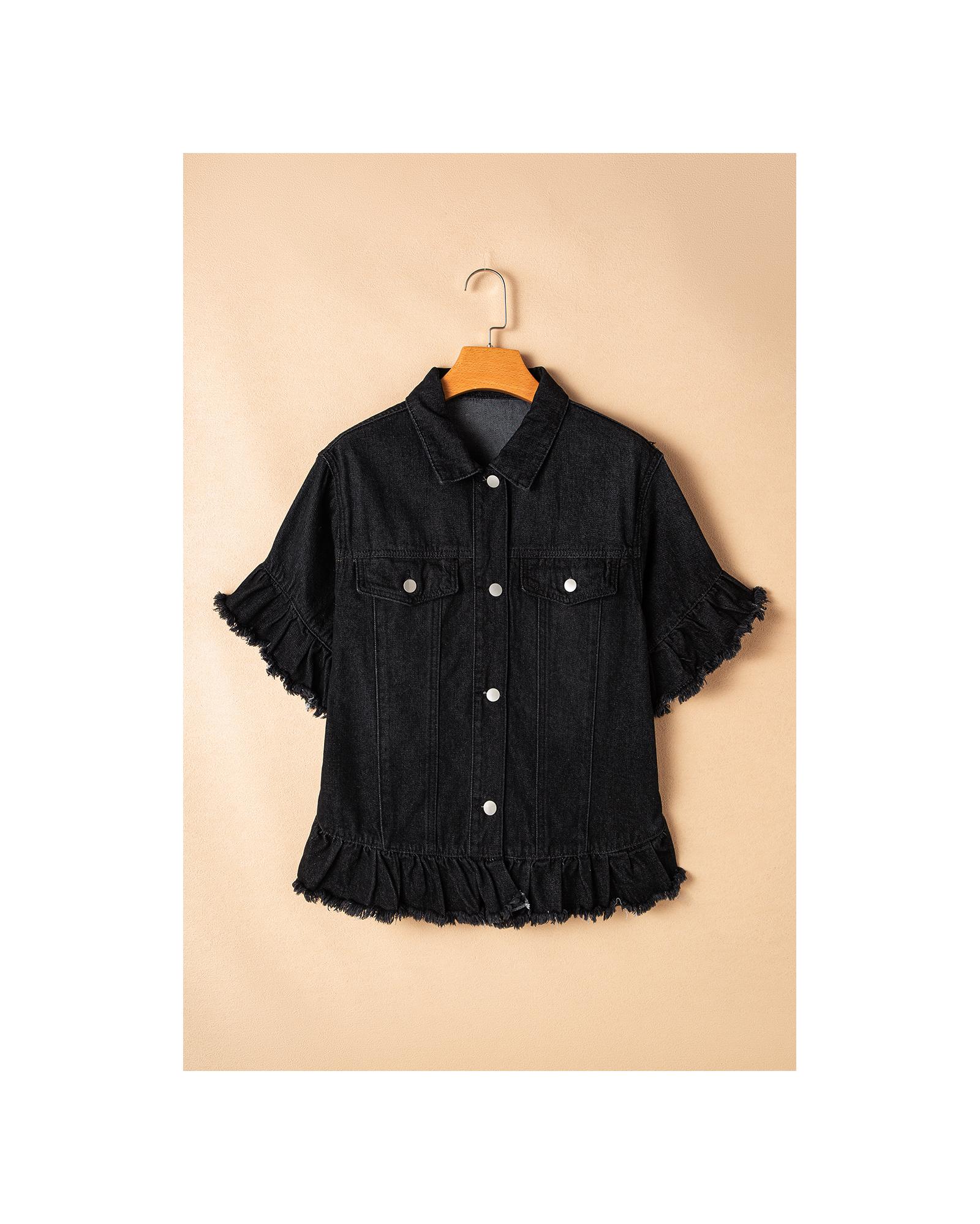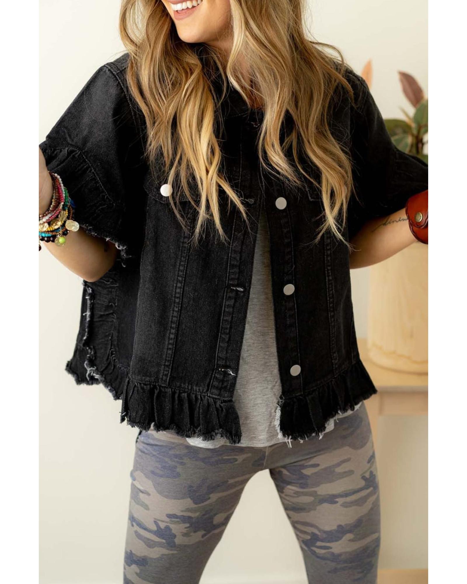 Black Raw Edge Ruffled Short Sleeve Denim Jacket – XL