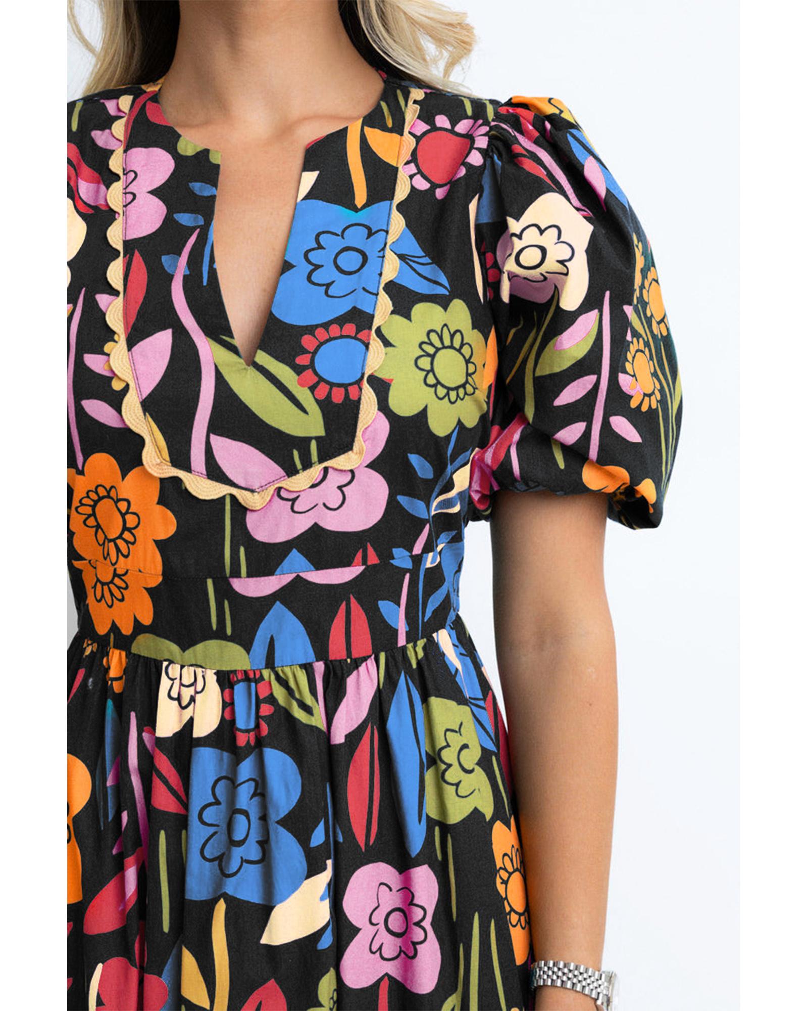 Black Retro Floral Printed Split Neck Maxi Dress – S