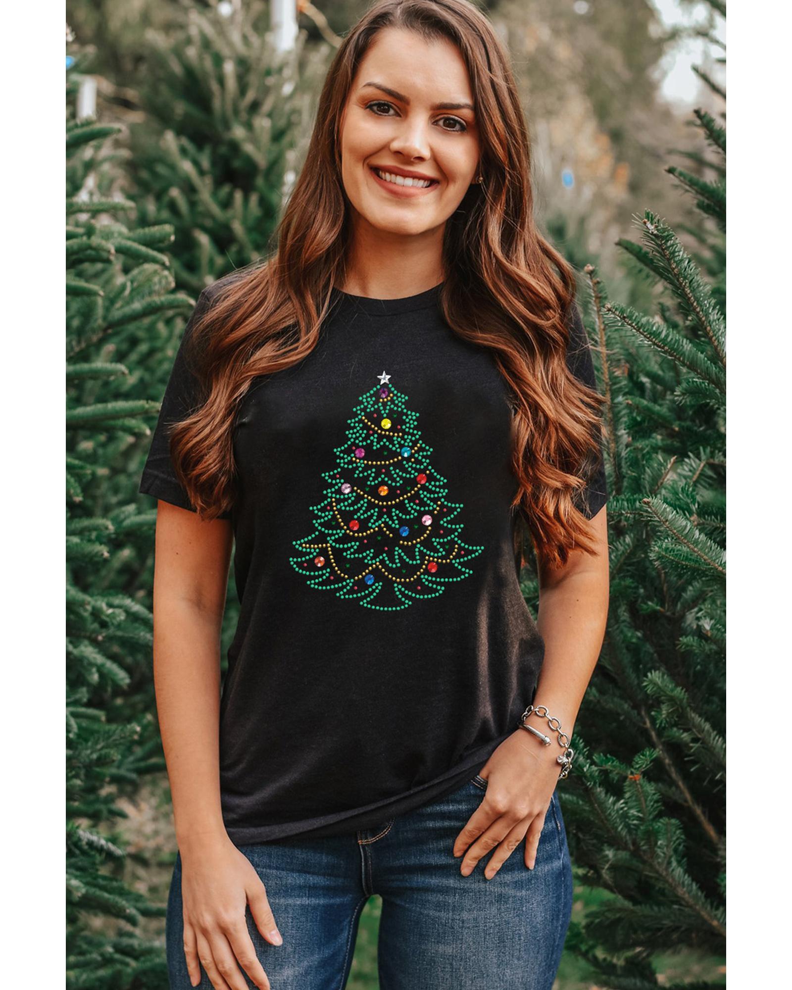 - Black Rhinestone Christmas Tree Round Neck Graphic Tee