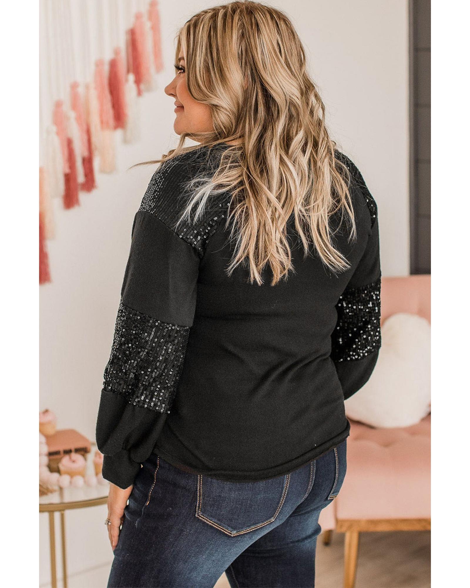 Black Rhinestone Heart Rugby Football Pattern Sequin Patched Sleeve Plus Size Top – 3X