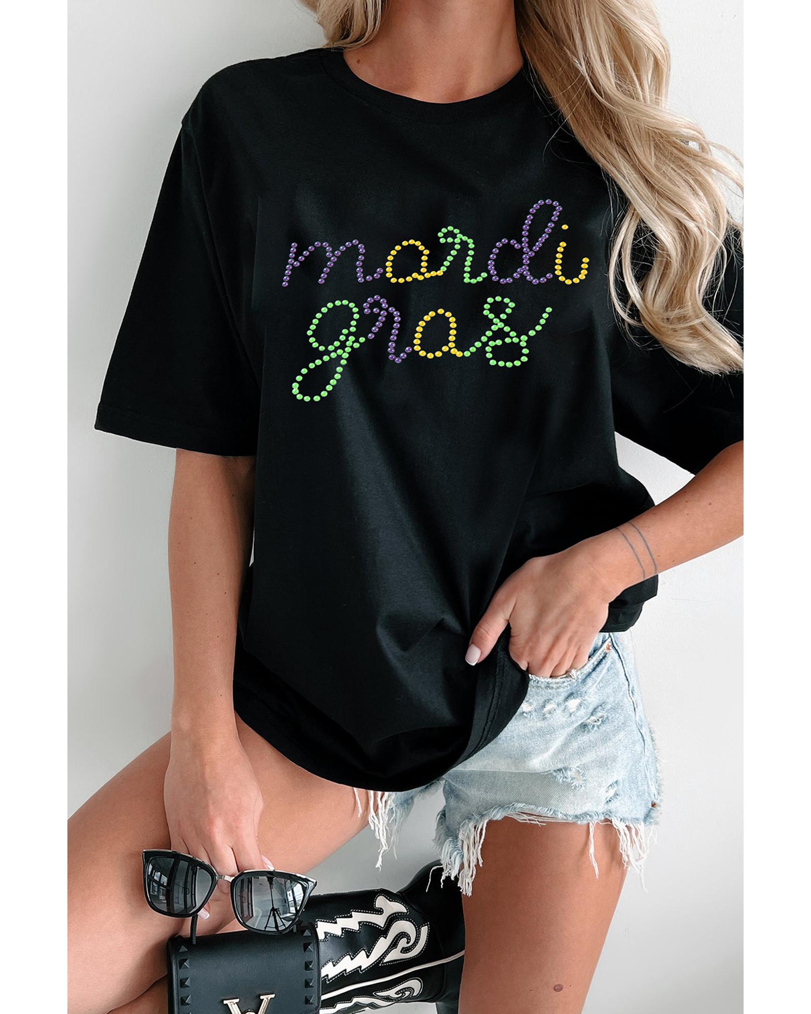 Black Rhinestone Mardi Gras Letter Graphic T Shirt – M