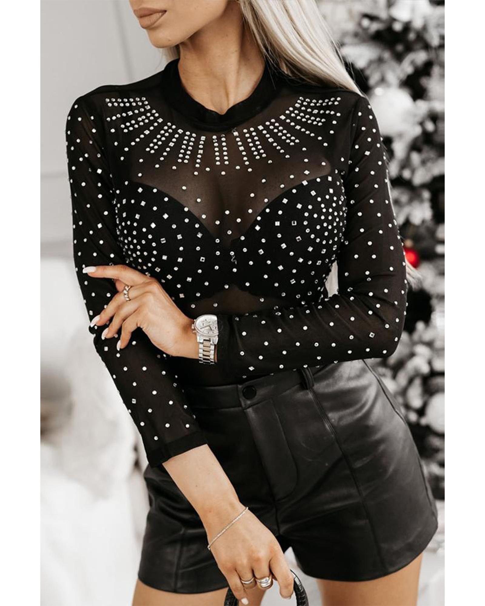 Black Rhinestone Sheer Mesh Long Sleeve Bodysuit – L