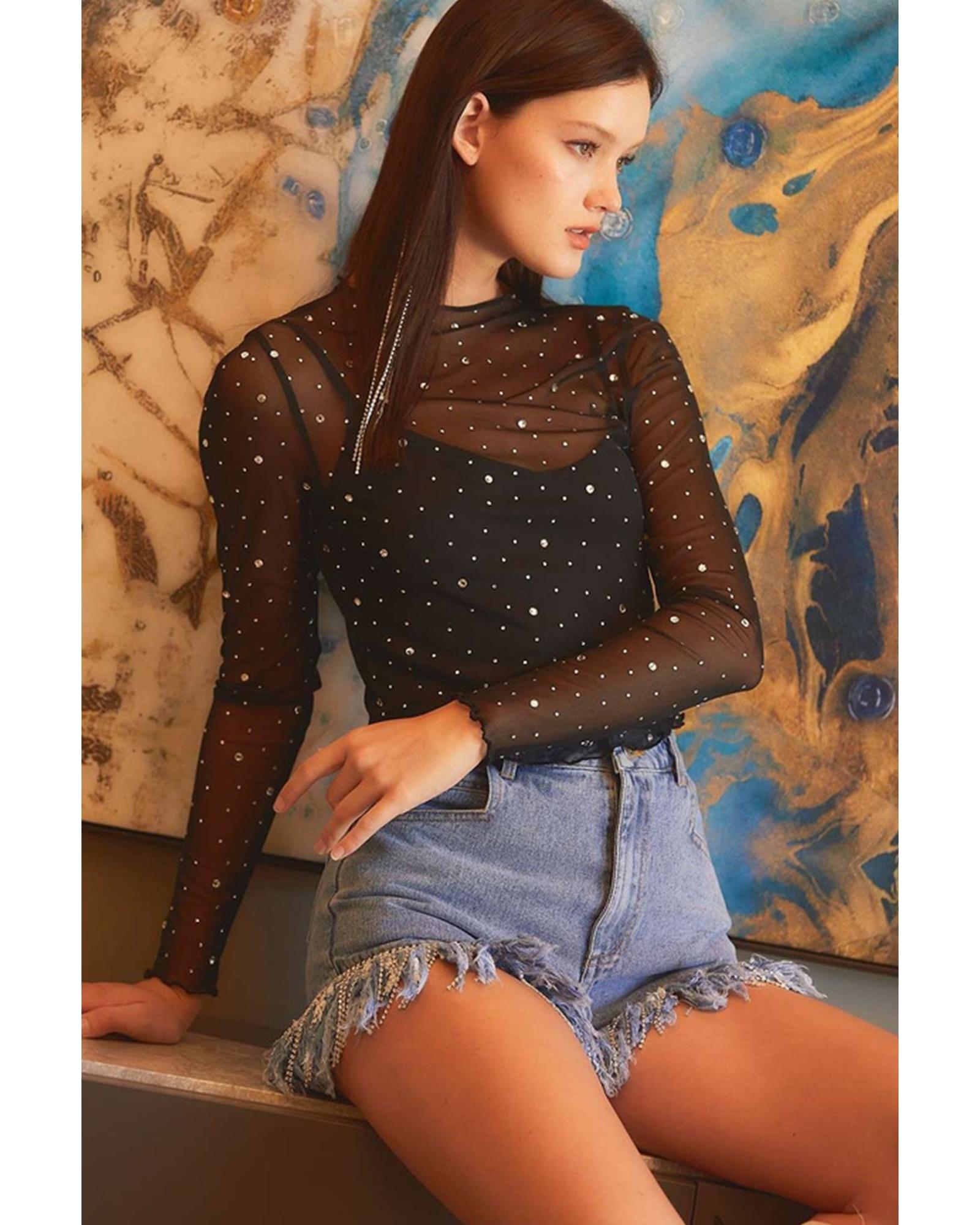 Black Rhinestone Sheer Mesh Slim Fit Long Sleeve Top – S