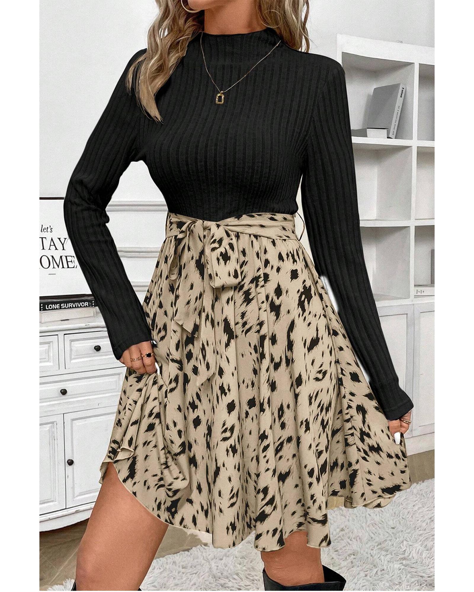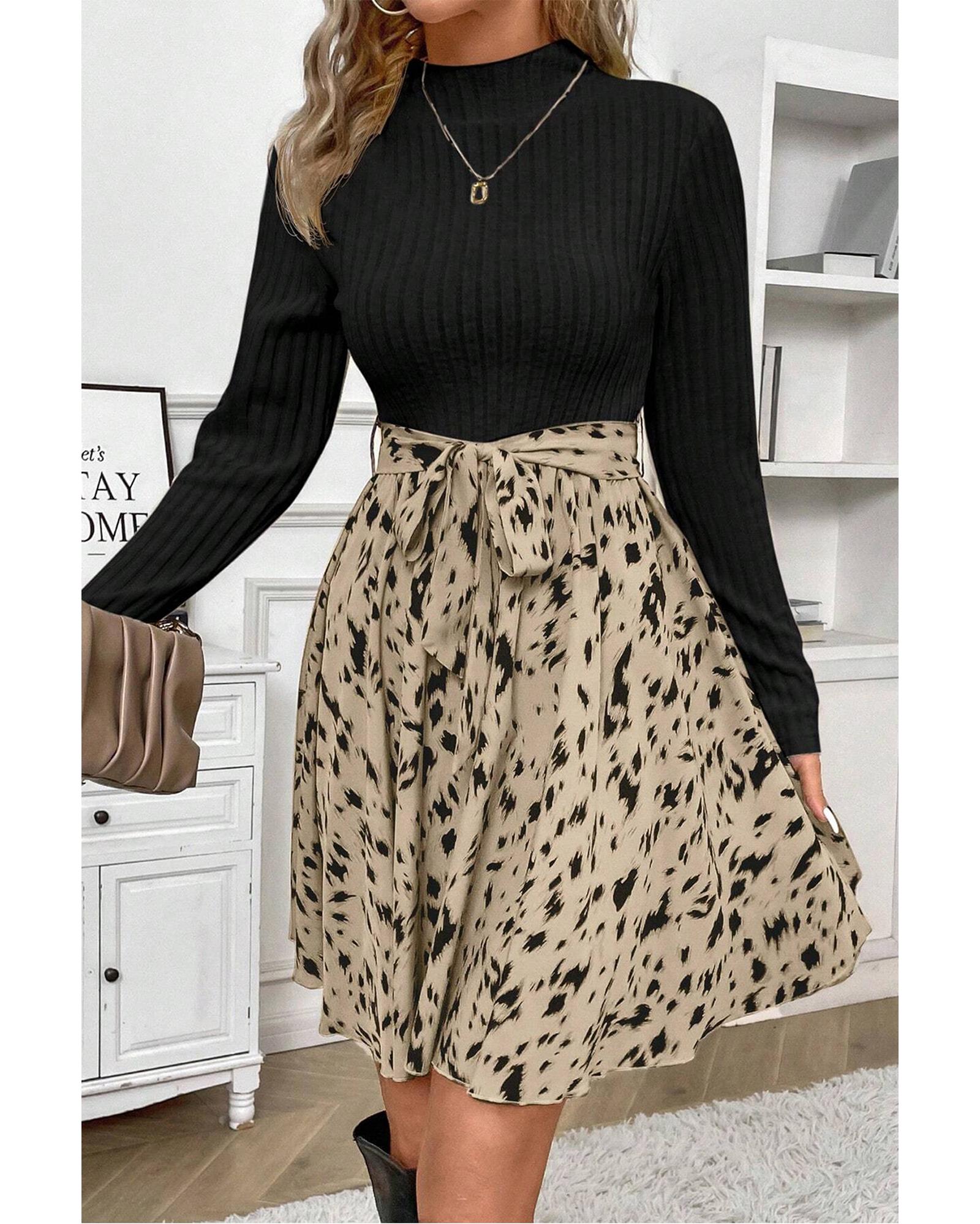 Black Ribbed Knit Patchwork Printed Belted A-line Dress – M