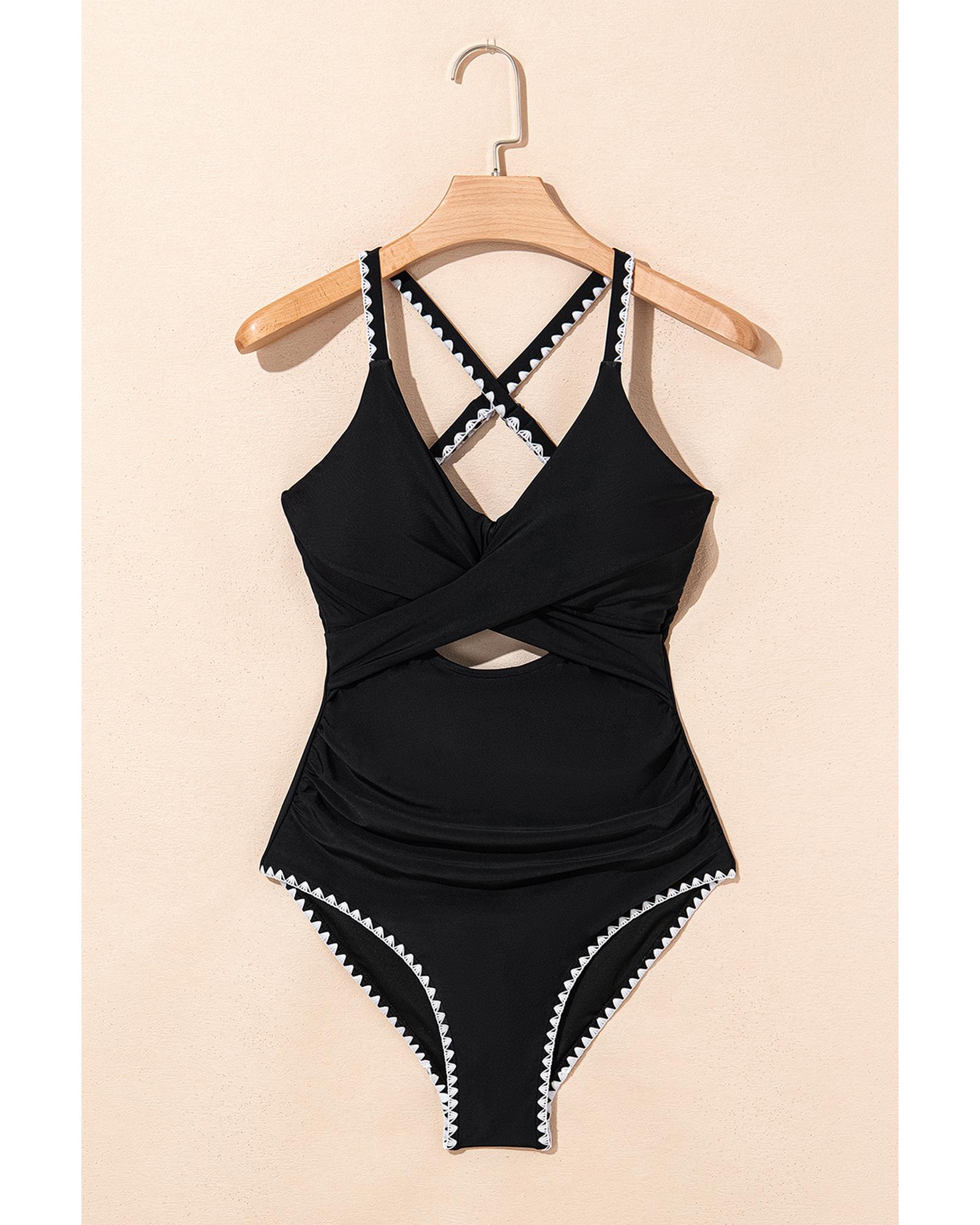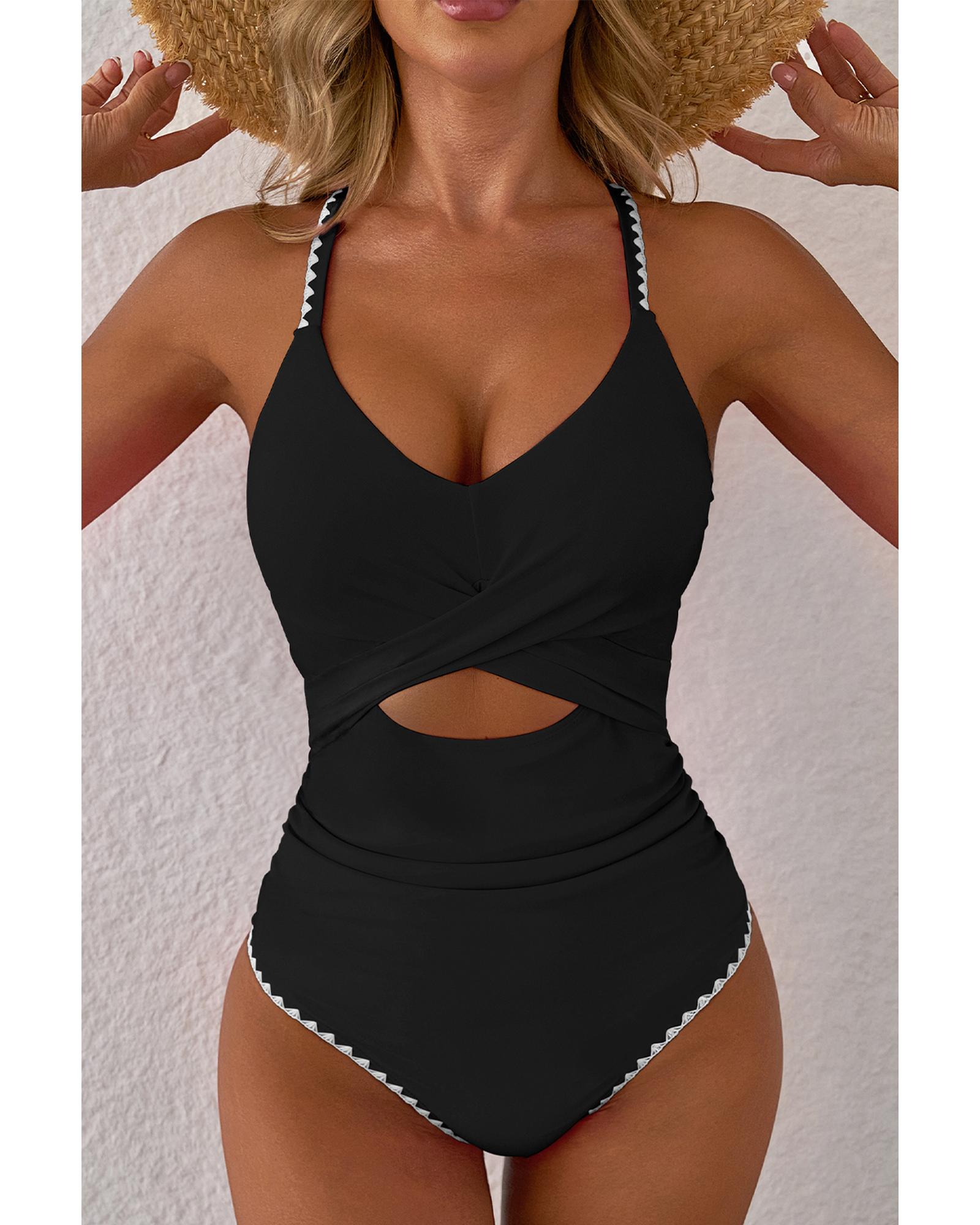 Black Ric Rac Trim Contrasted Patchwork Cutout One Piece Swimsuit – M