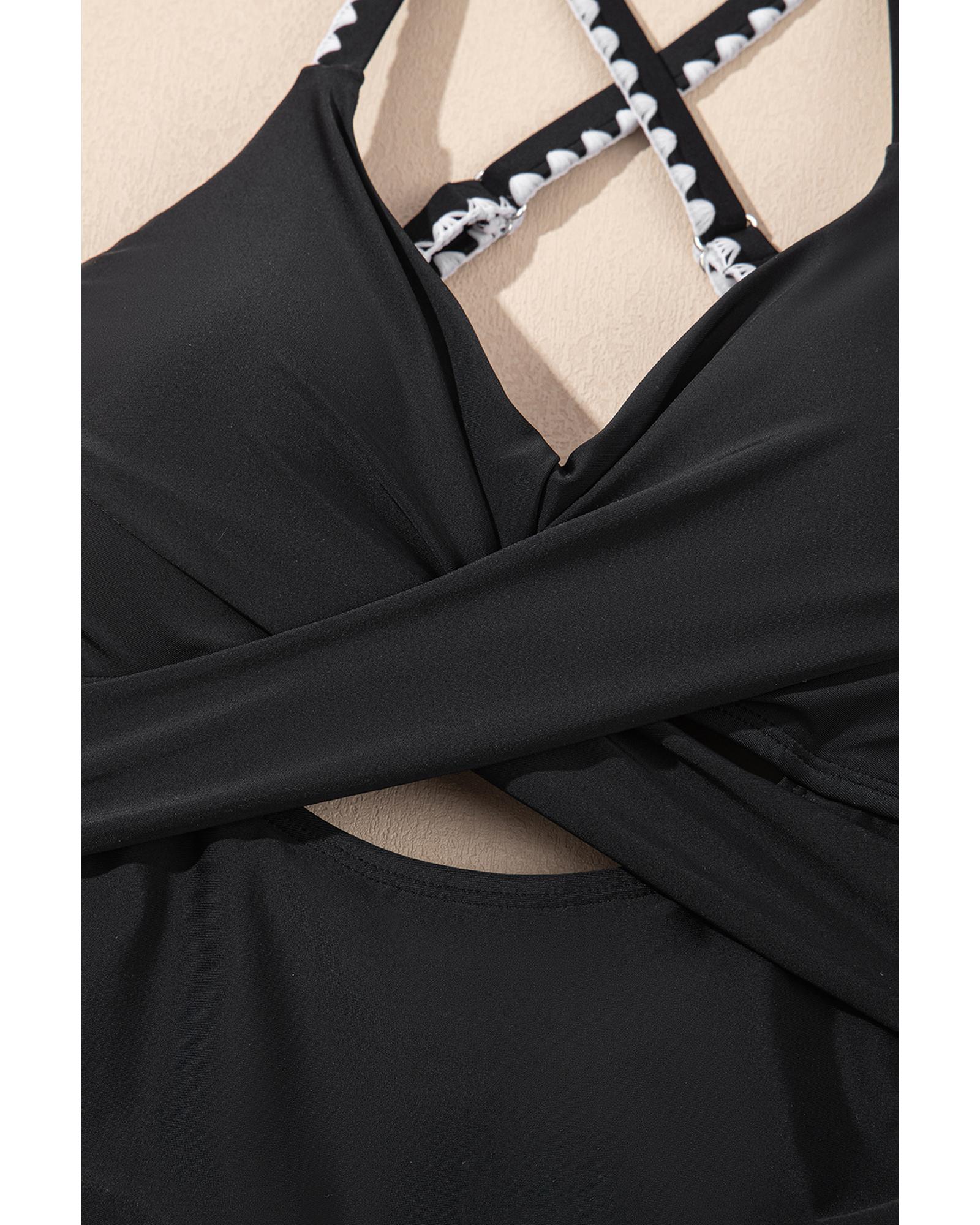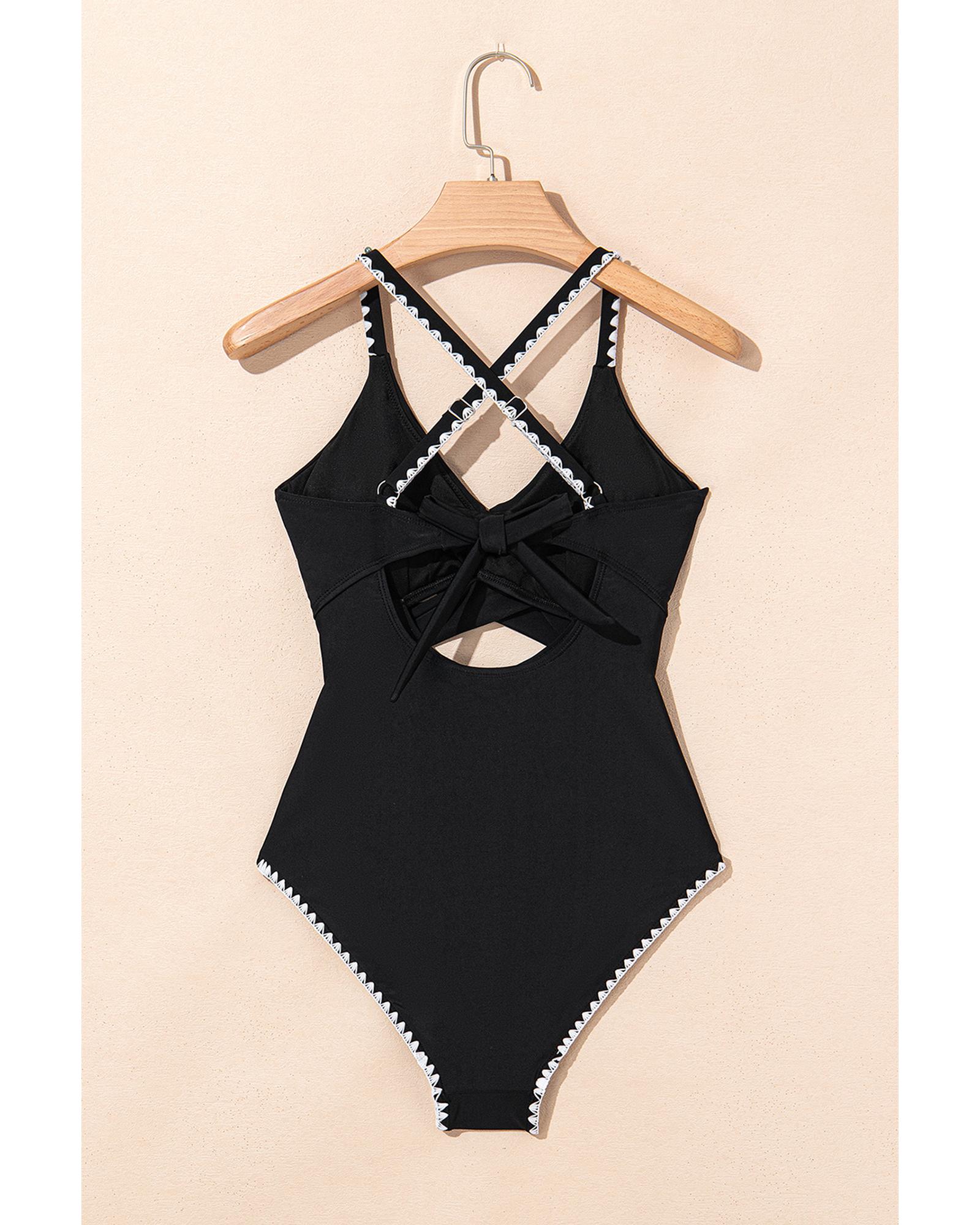 Black Ric Rac Trim Contrasted Patchwork Cutout One Piece Swimsuit – S
