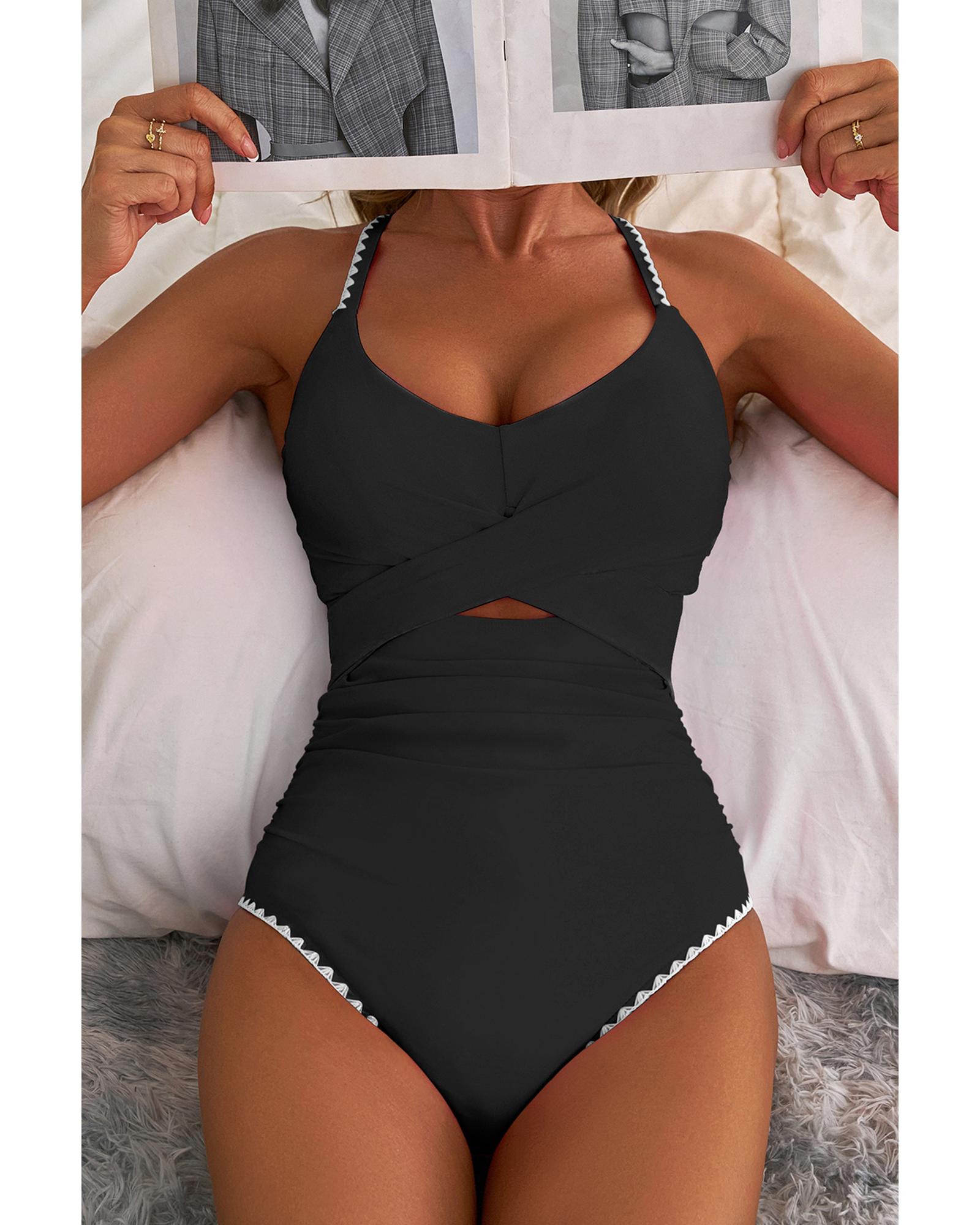 Black Ric Rac Trim Contrasted Patchwork Cutout One Piece Swimsuit – XL
