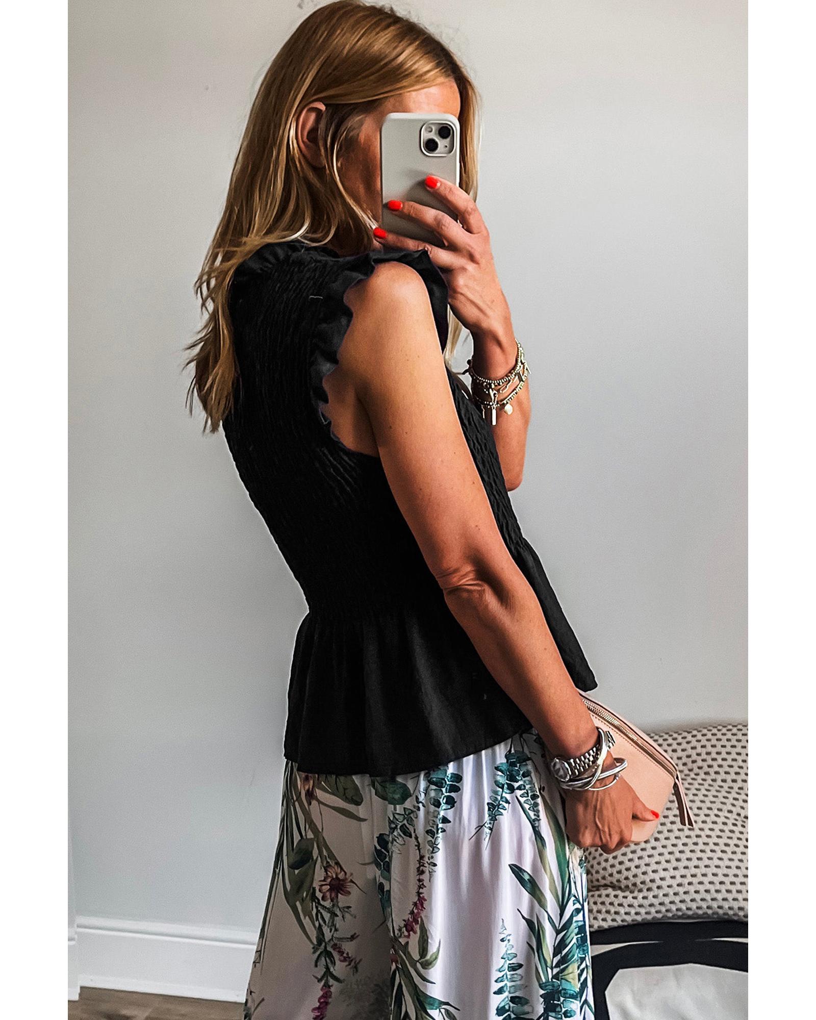 Black Ruffle Short Sleeve Shirred Peplum Top – XL