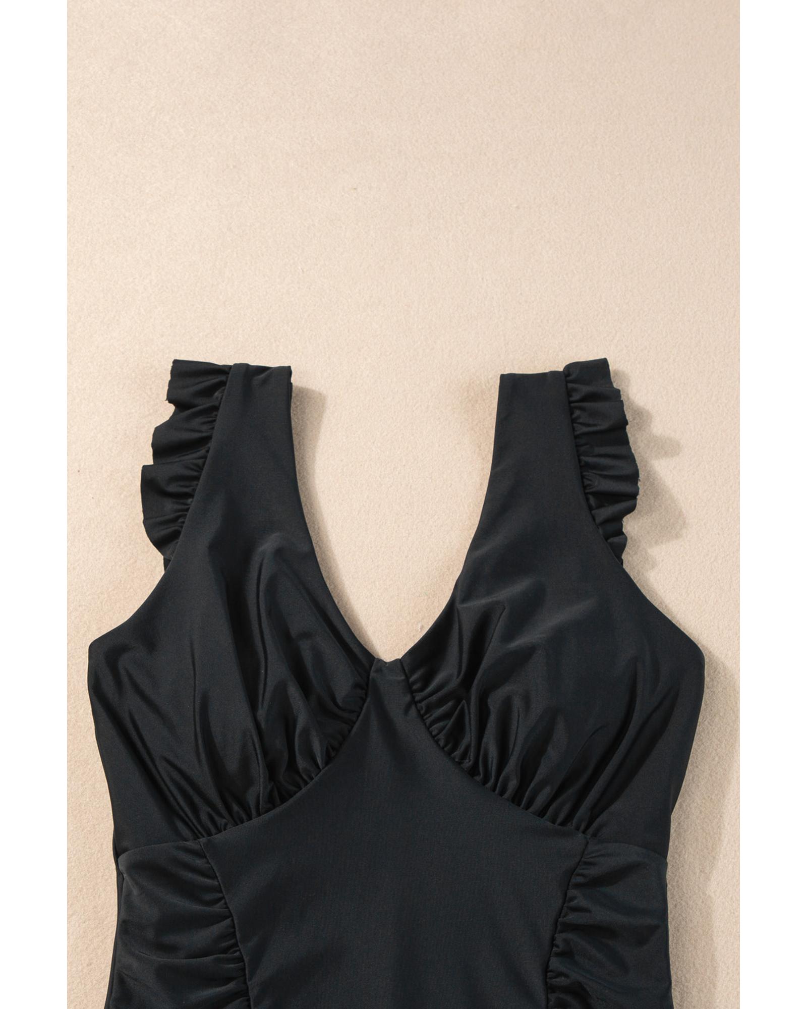 Black Ruffled Trim Ruched One Piece Bathing Suit – M