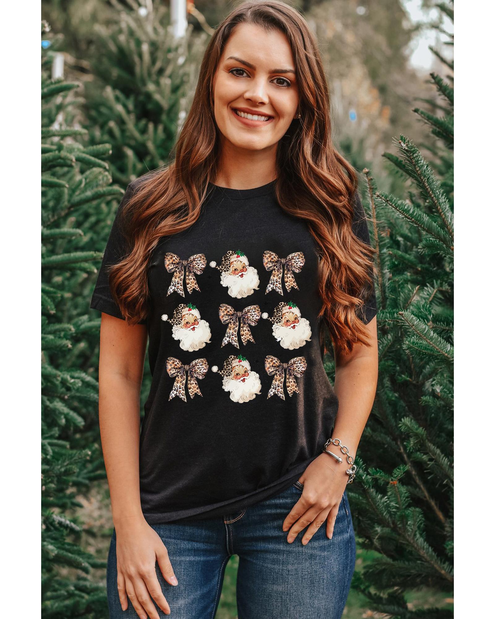 Black Santa Claus Leopard Bow Print Crew Neck Casual T Shirt – M