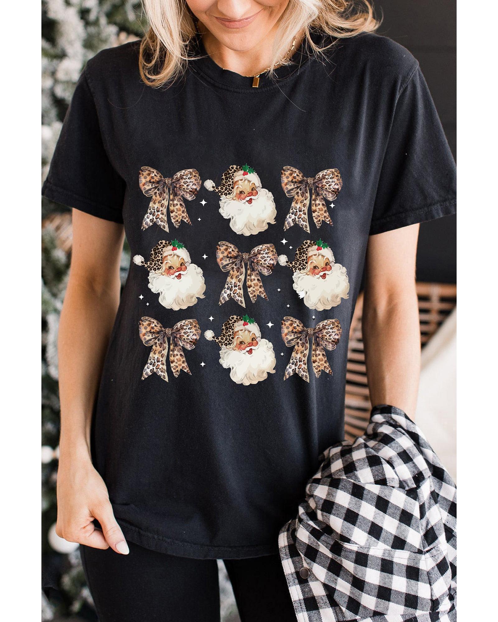 Black Santa Claus Leopard Bow Print Crew Neck Casual T Shirt – XL