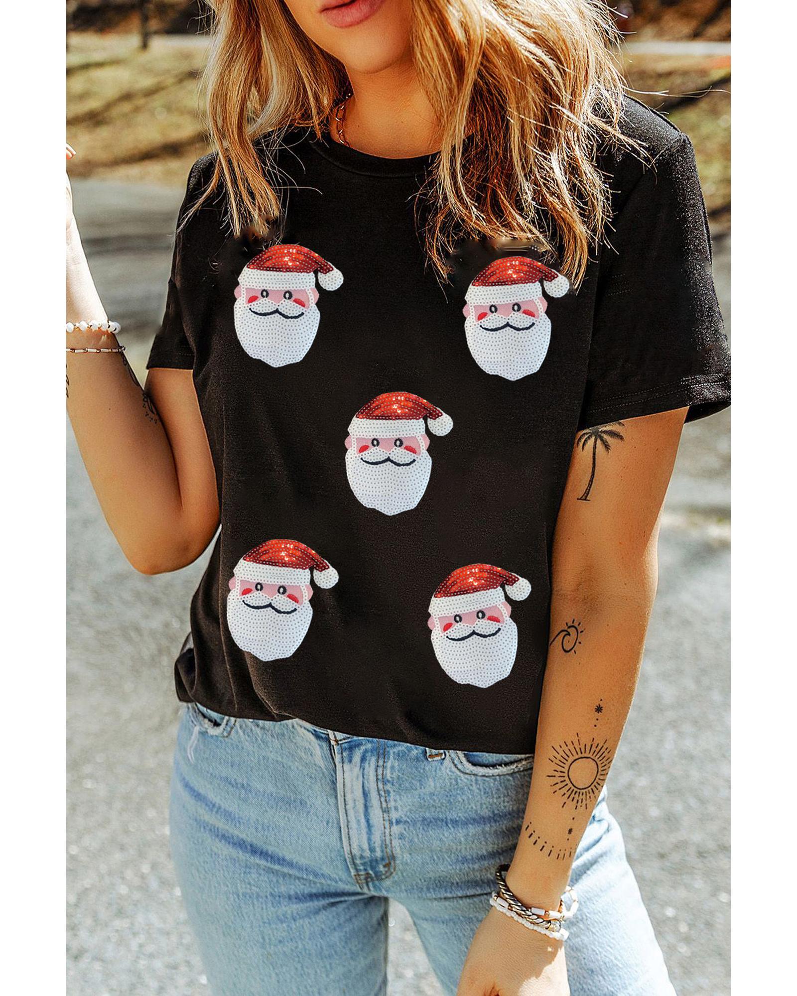 - Festive Black Sequin Christmas Claus Pattern Crewneck T Shirt