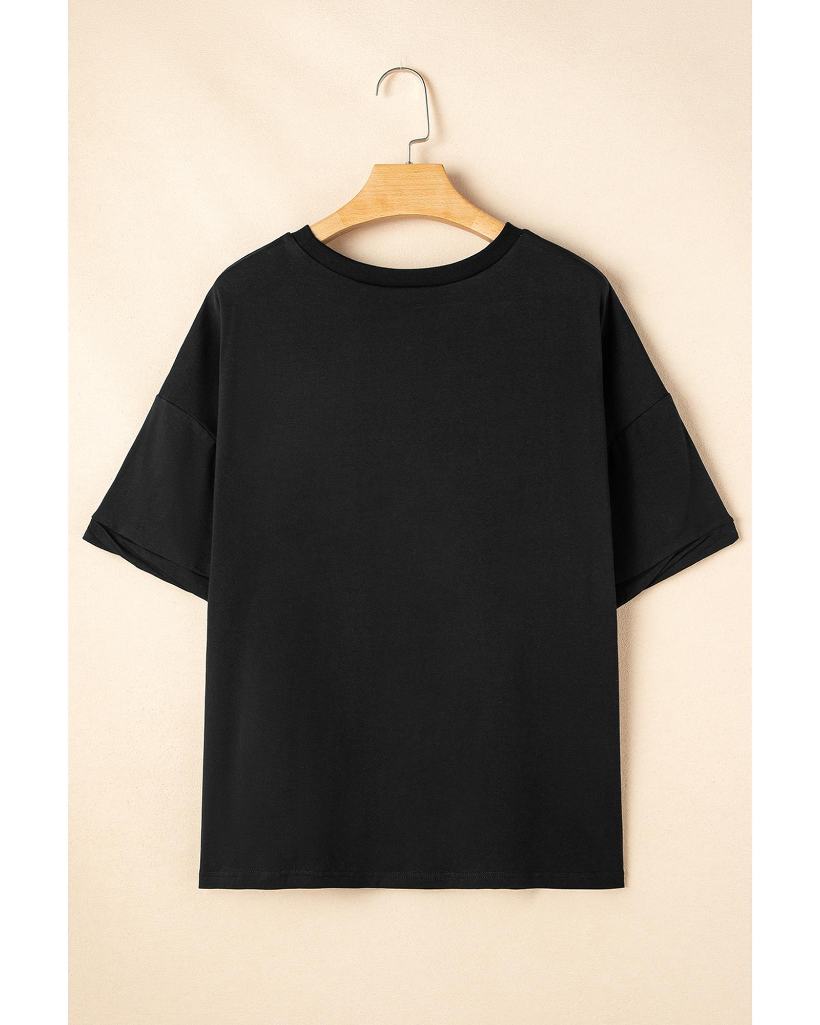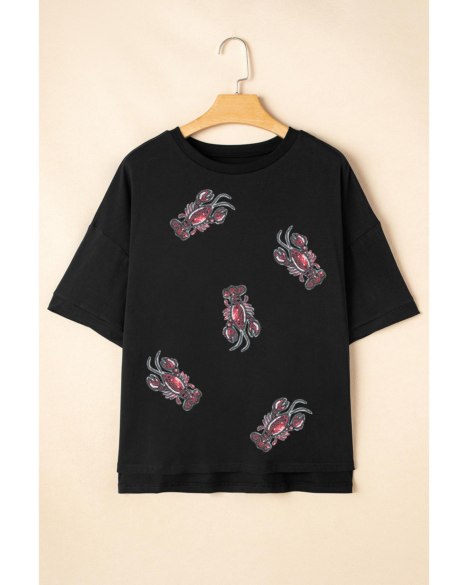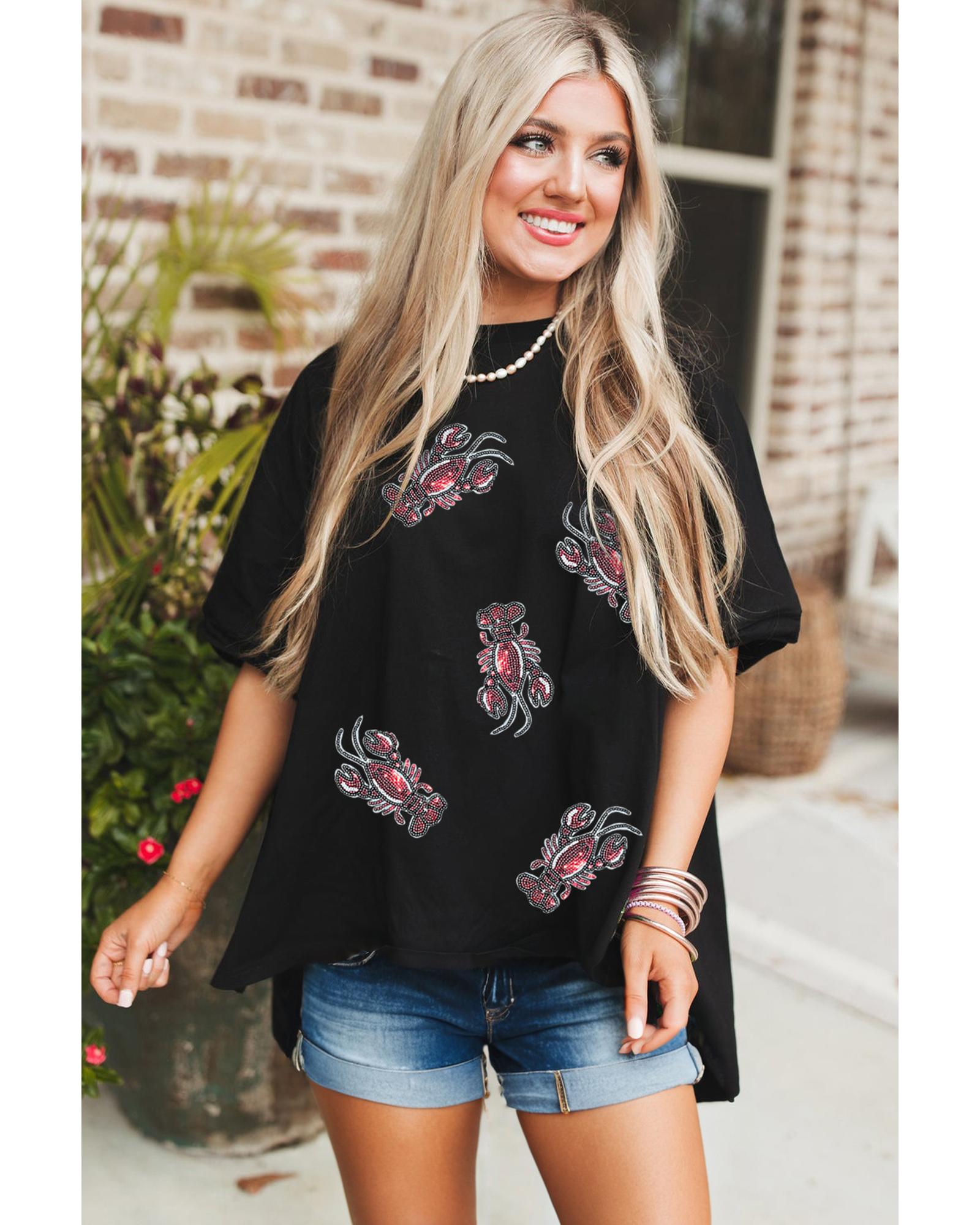 Black Sequin Crawfish Graphic High Low Loose T Shirt – L