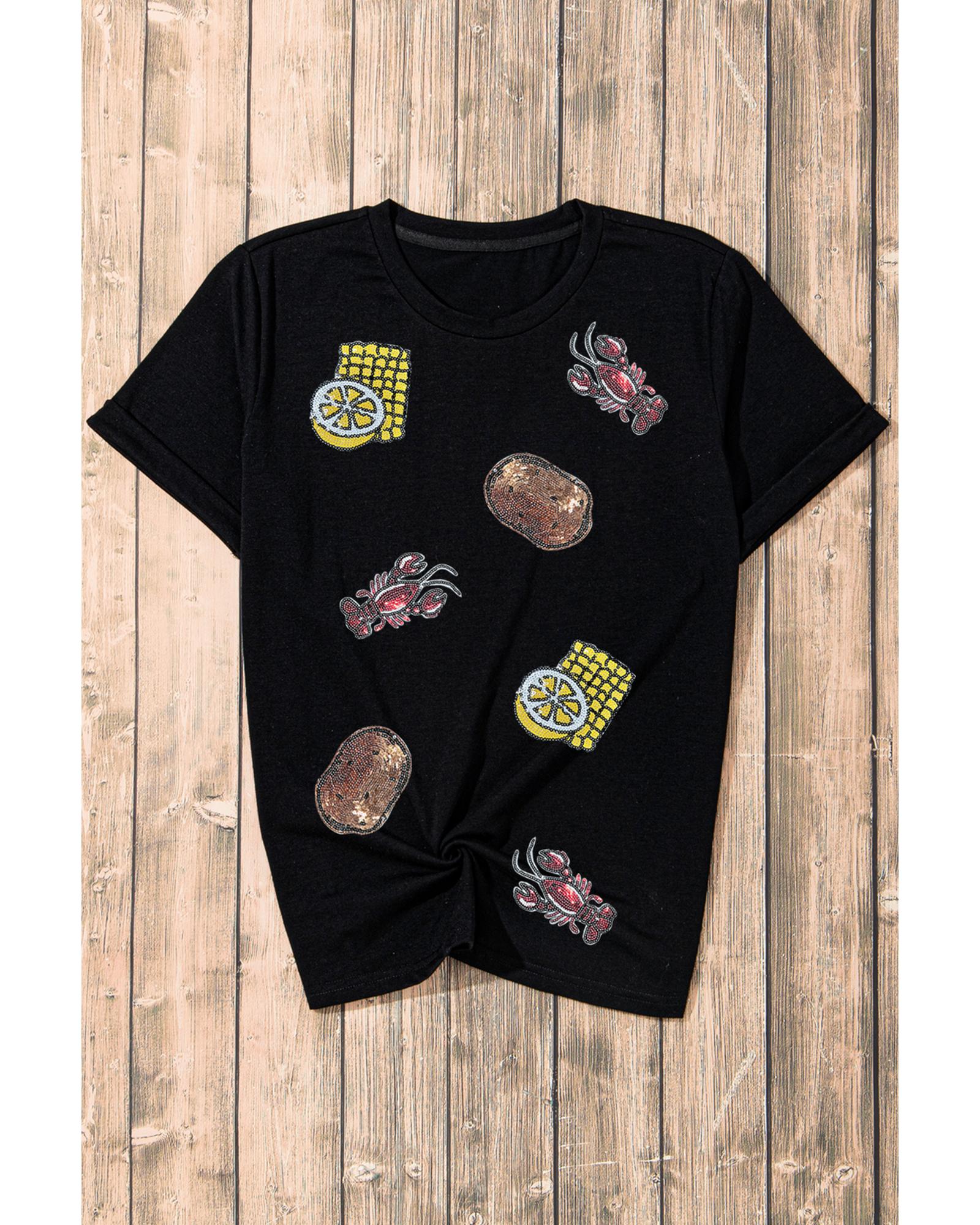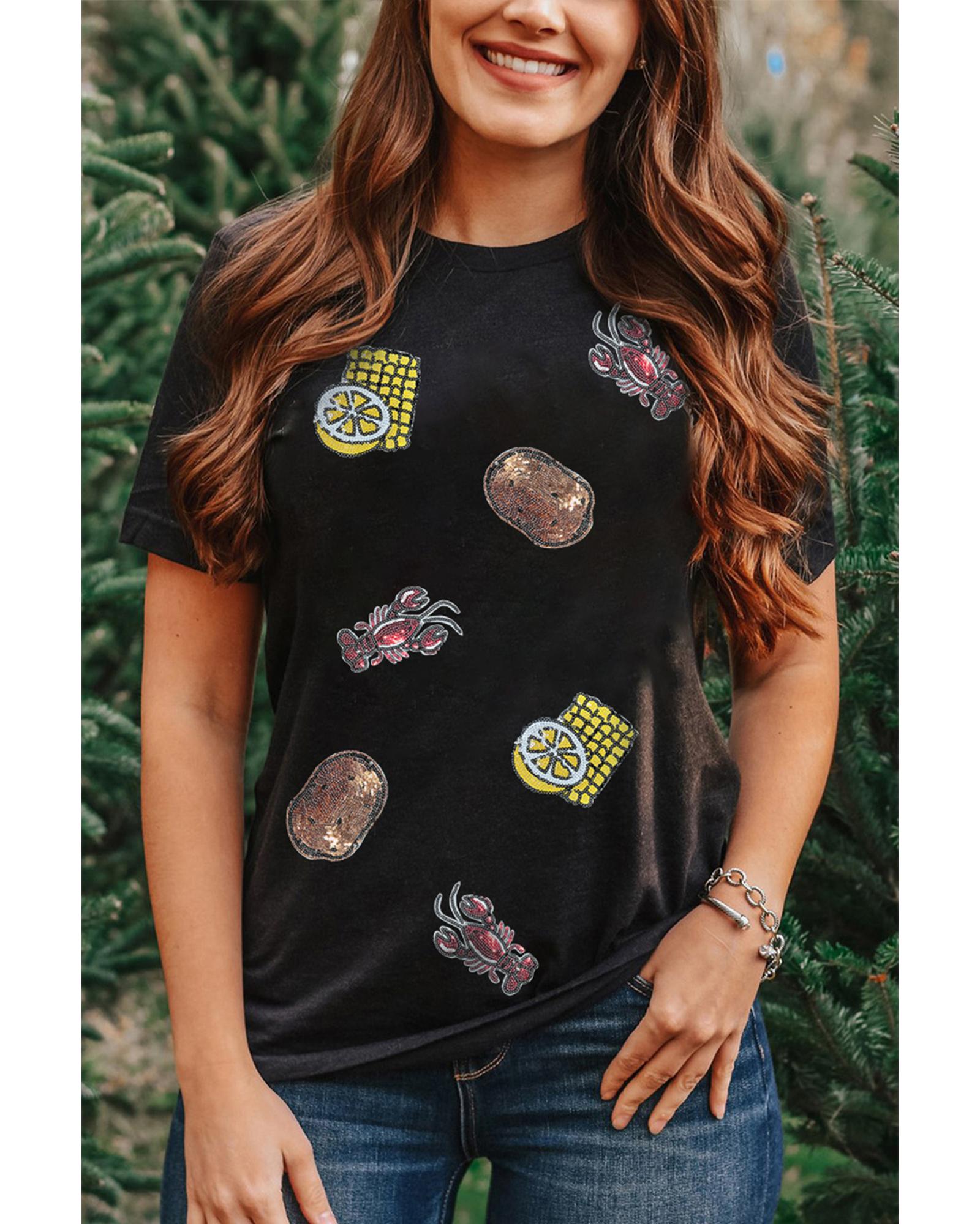 Black Sequin Crawfish Potato Lemon Corn Graphic Crewneck T Shirt – XL