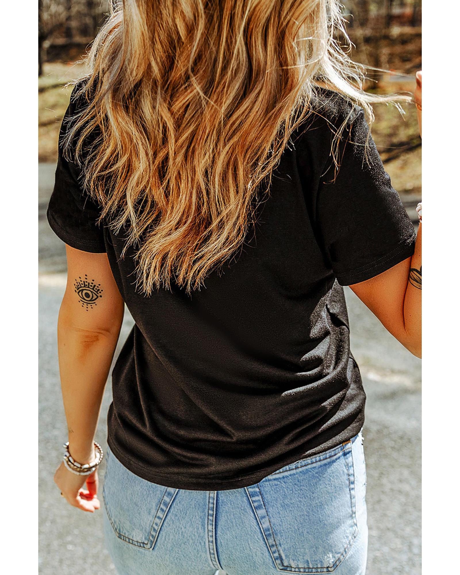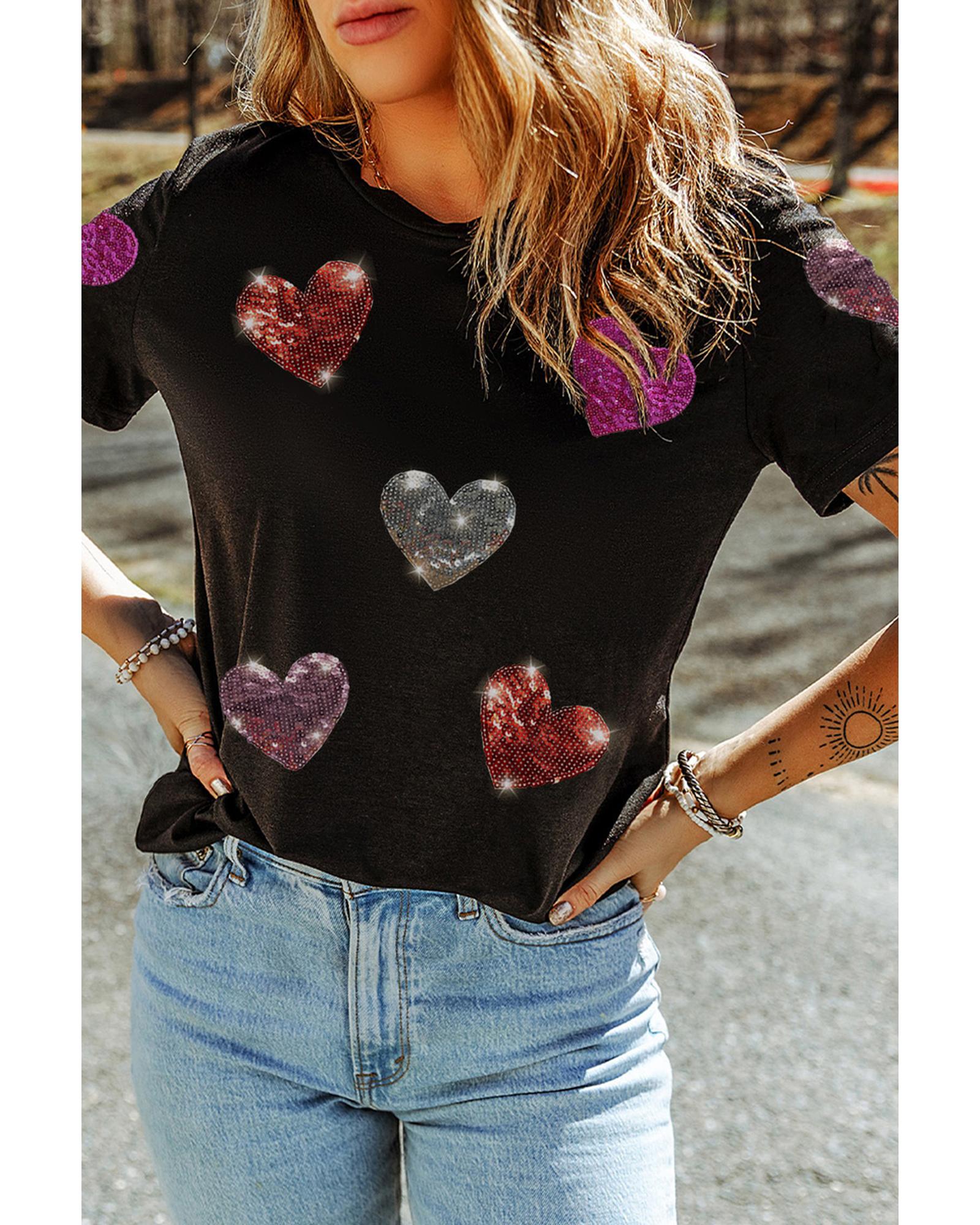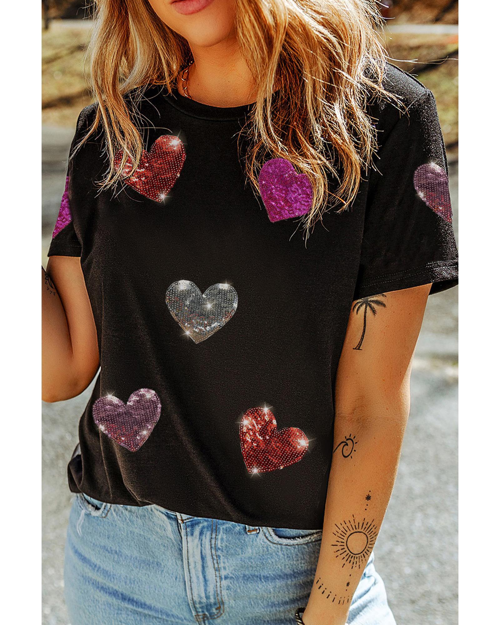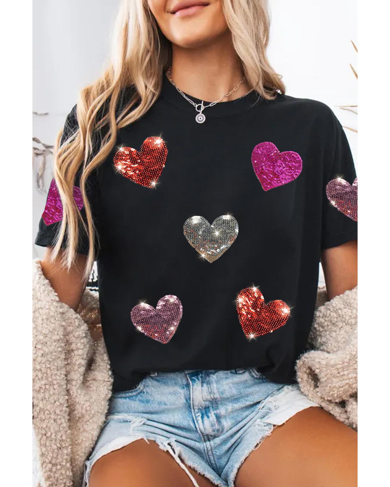 - Black Sequin Heart Patched Pattern Crewneck Valentines Tee