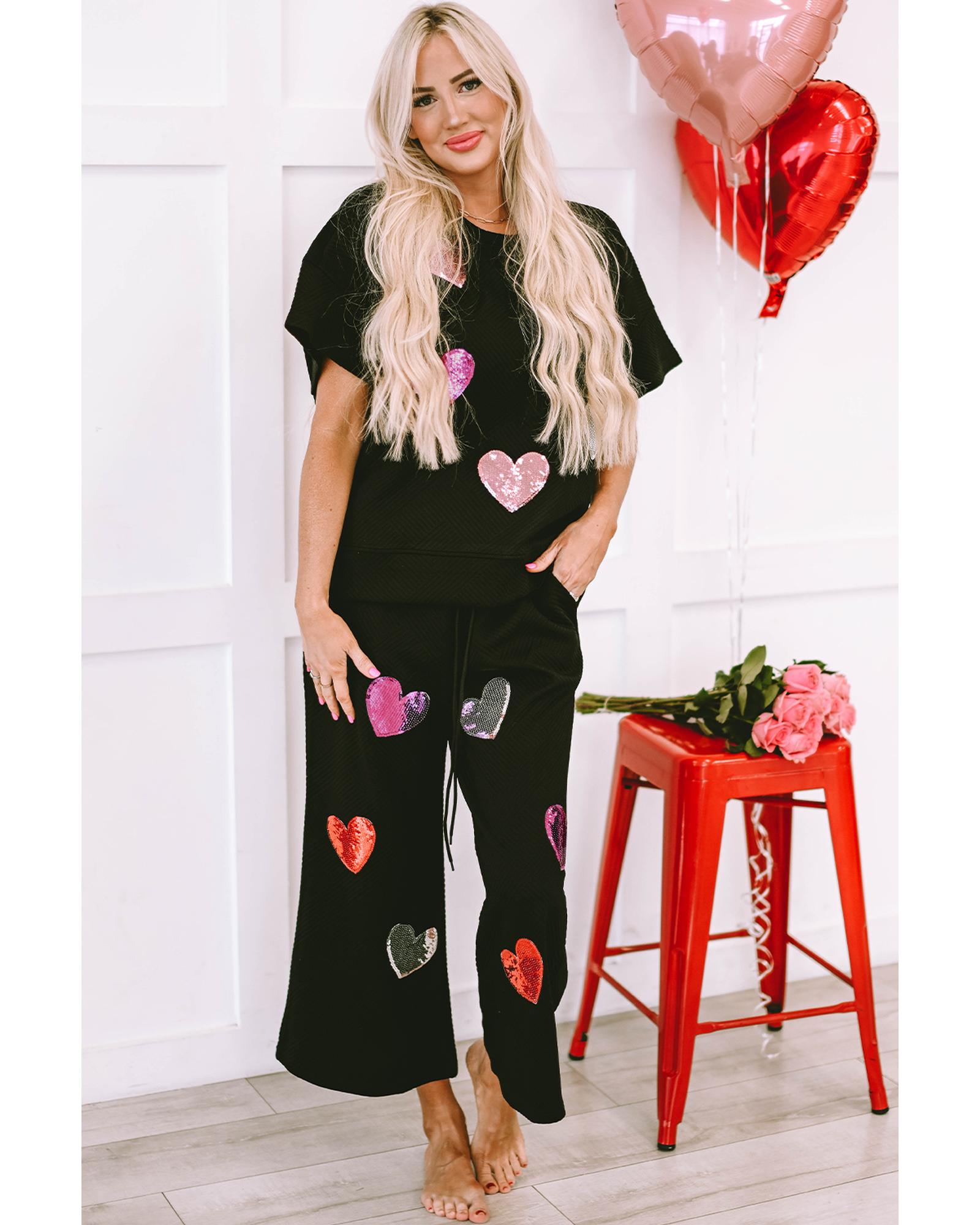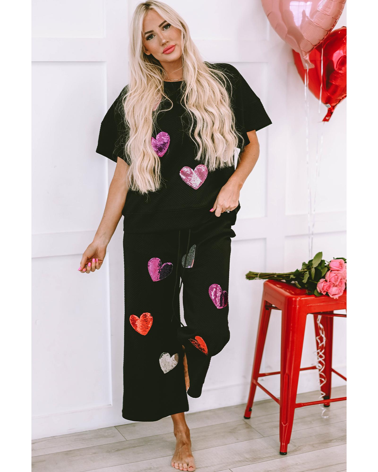 - Black Sequin Heart Popping Graphic Textured 2pcs Outfit