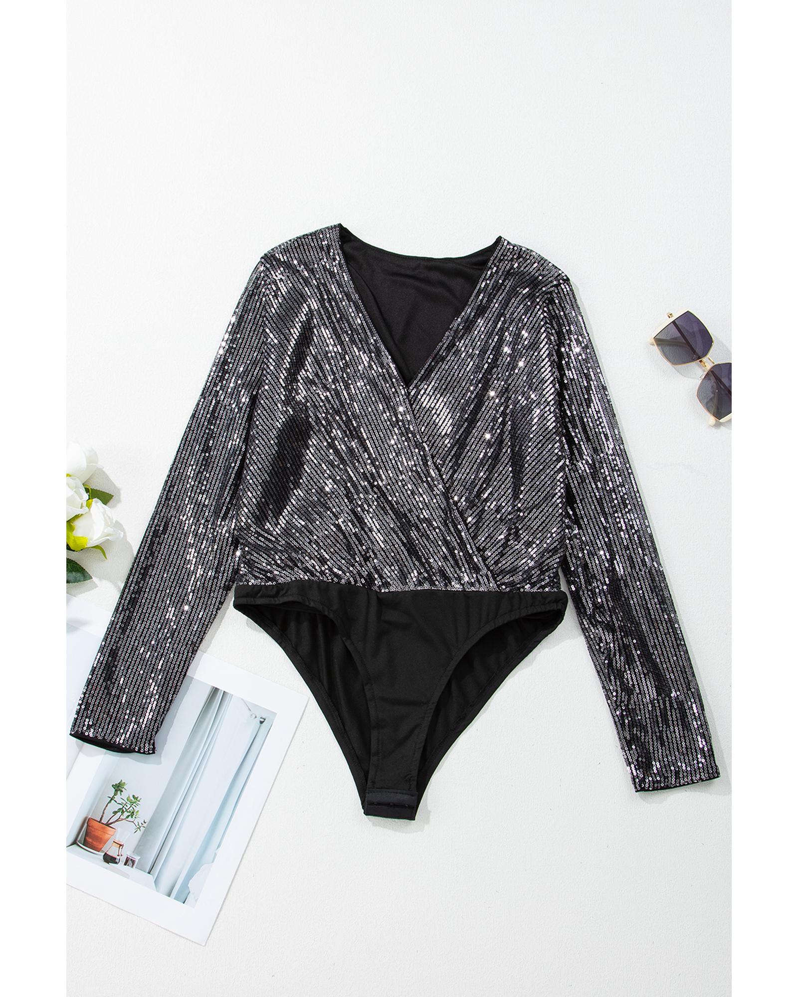 - Black Sequin Mesh Long Sleeve Surplice Neck Bodysuit