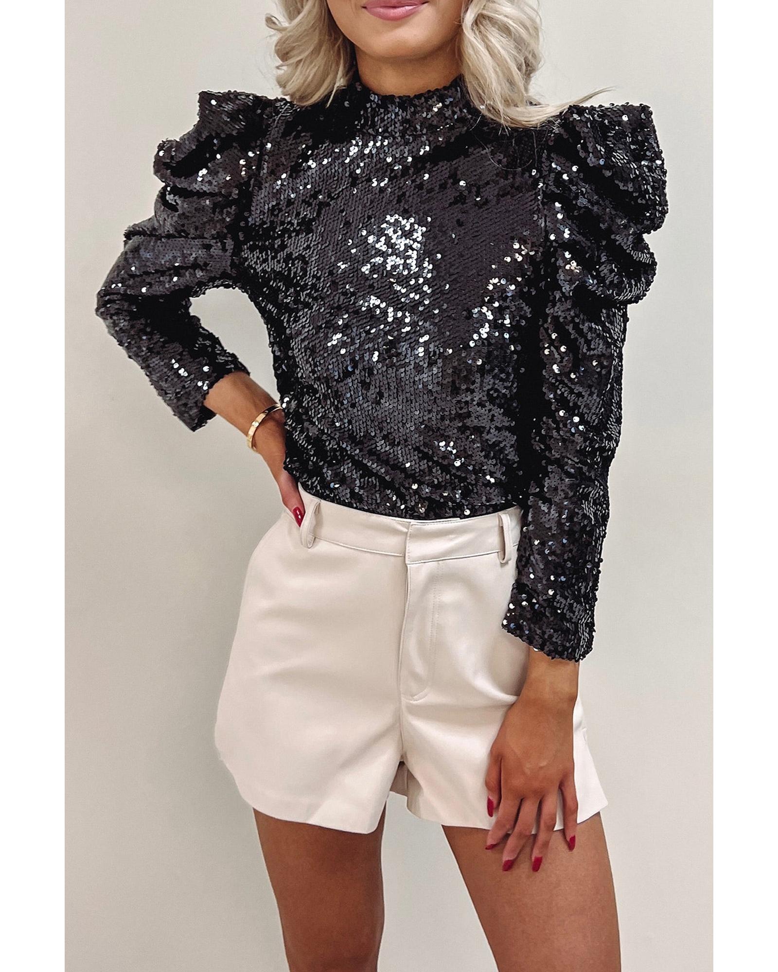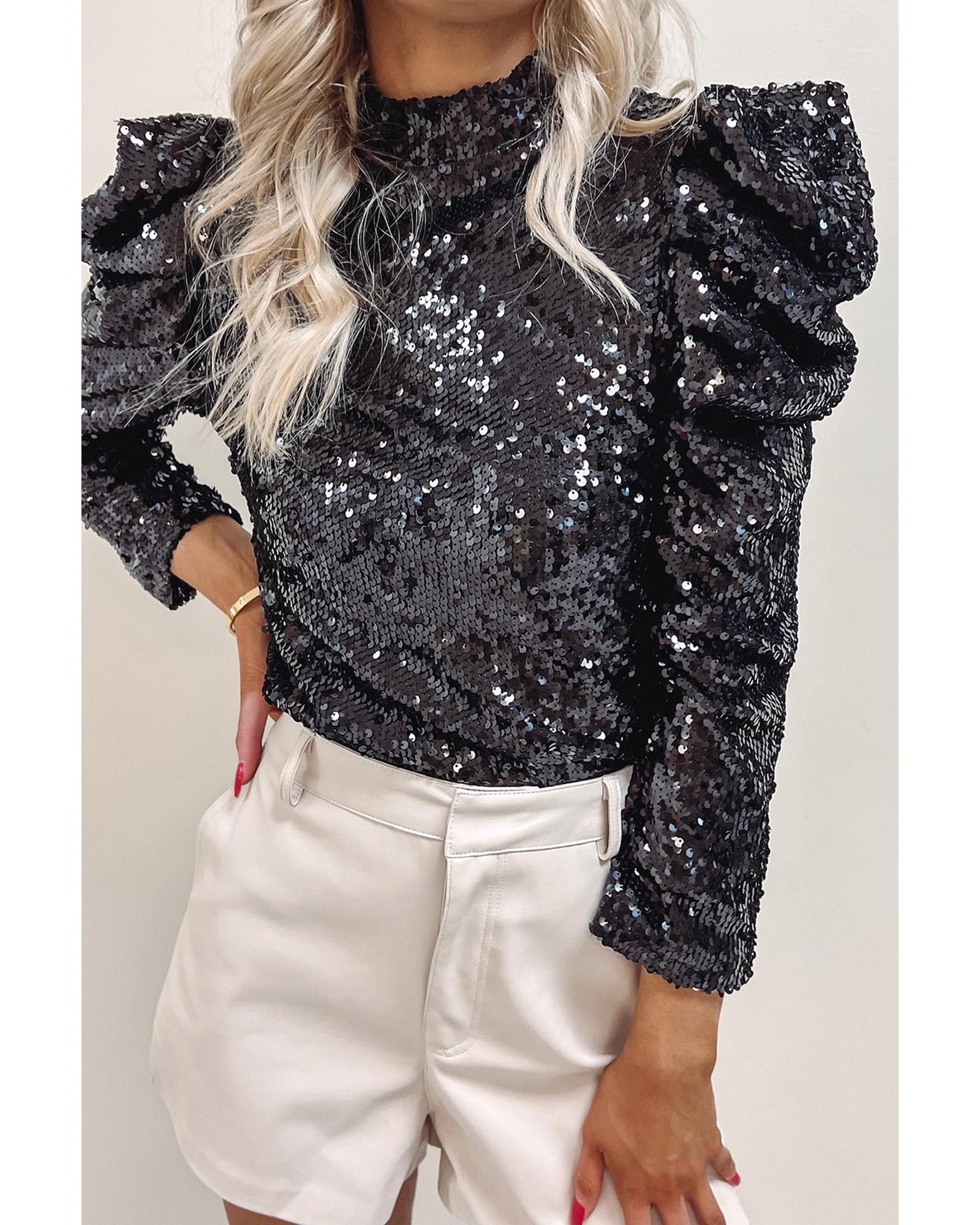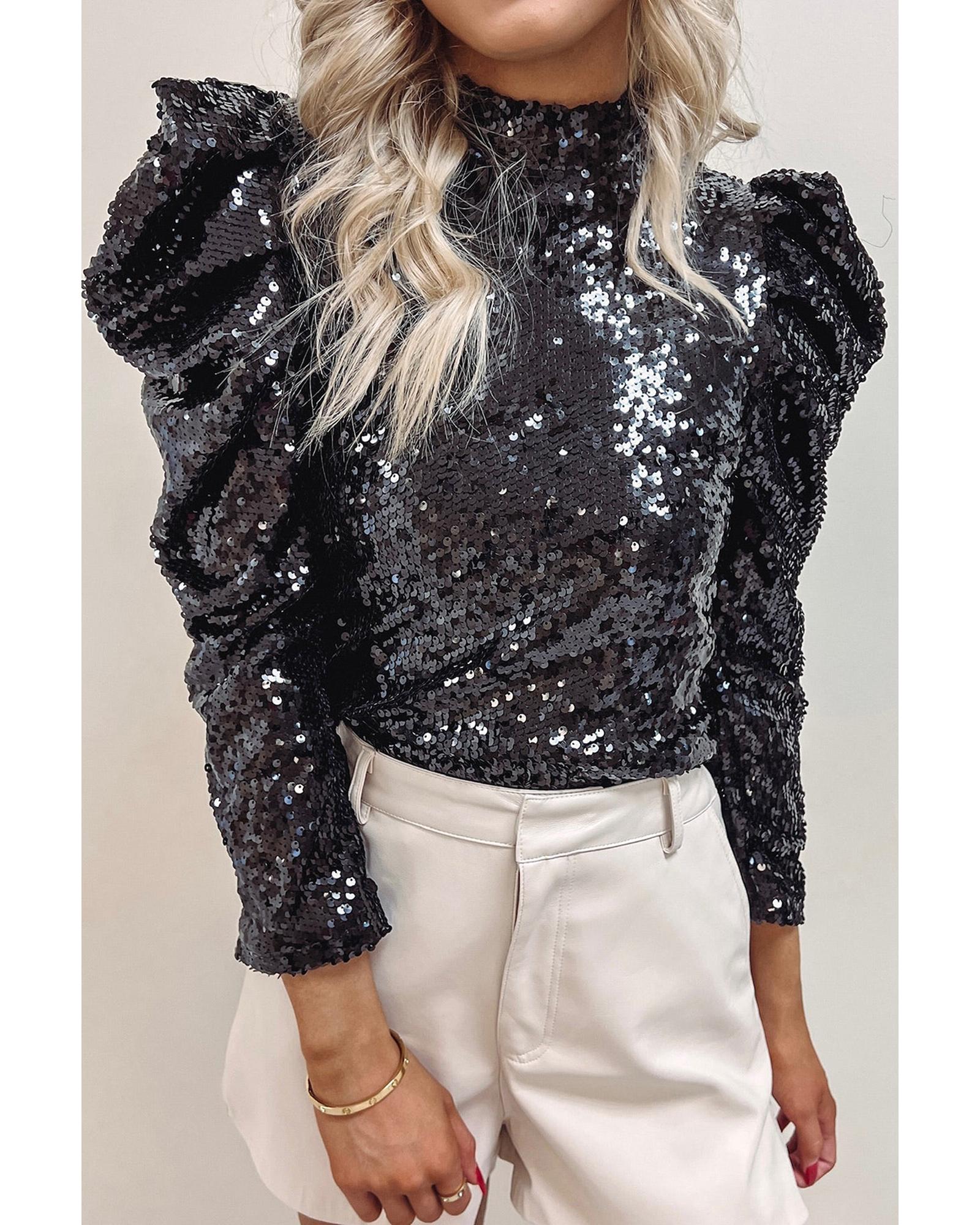 • Black Sequin Mock Neck Bubble Sleeve Top