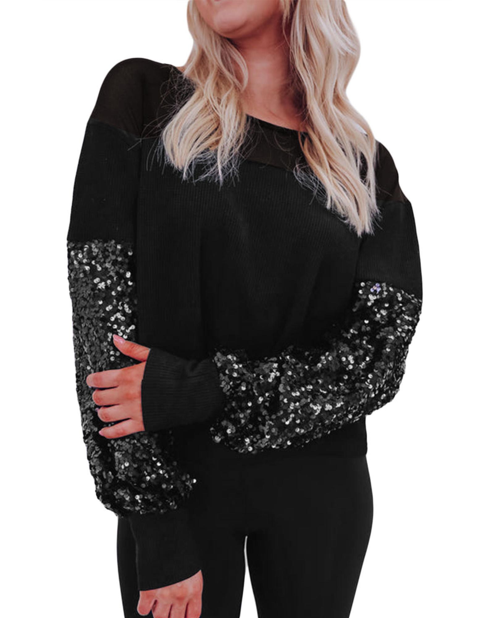 Black Sequin Patchwork Lantern Sleeve Blouse – M