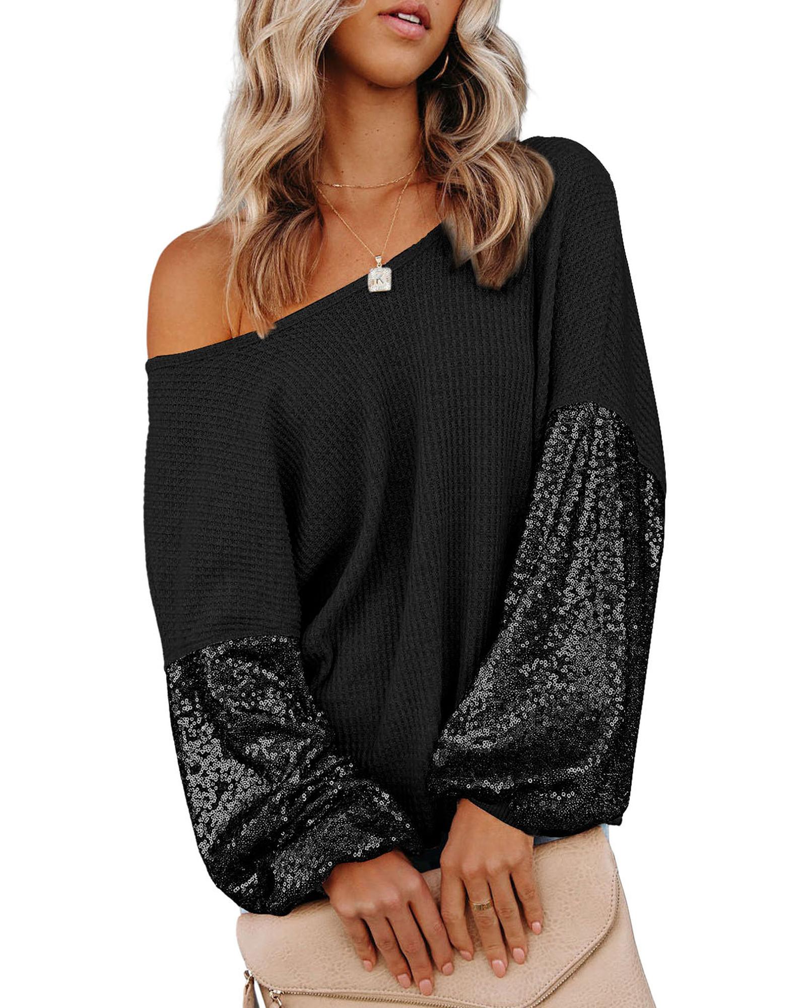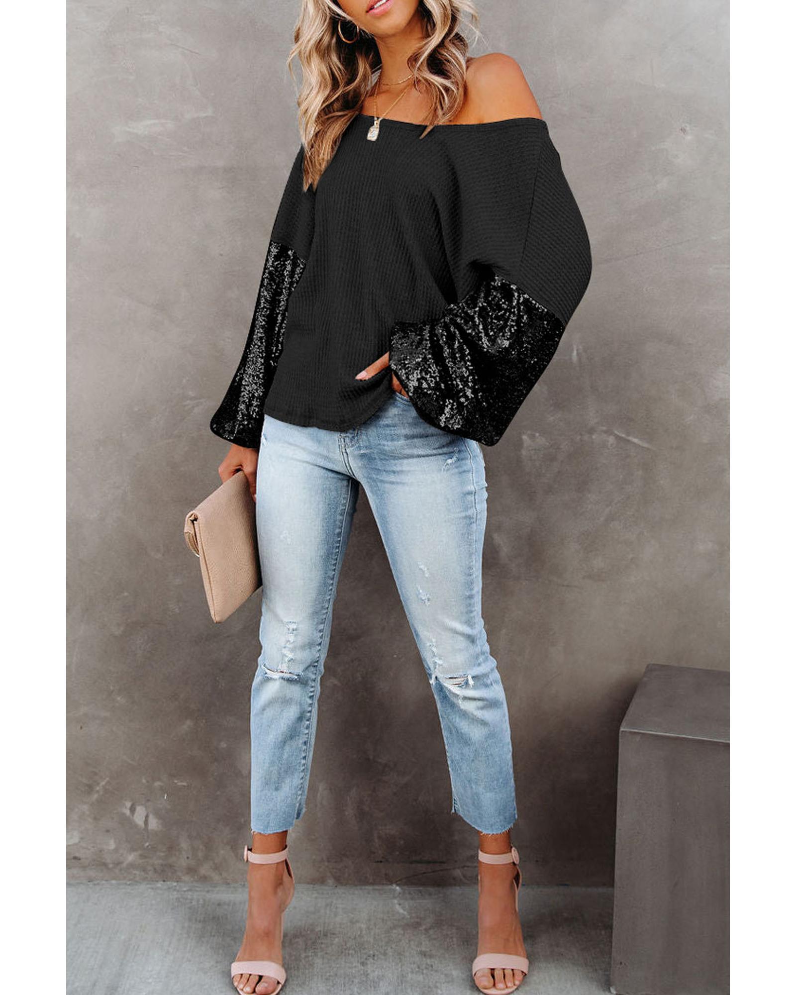 Black Sequin Patchwork Sleeve Open Back Waffle Knit Top – L