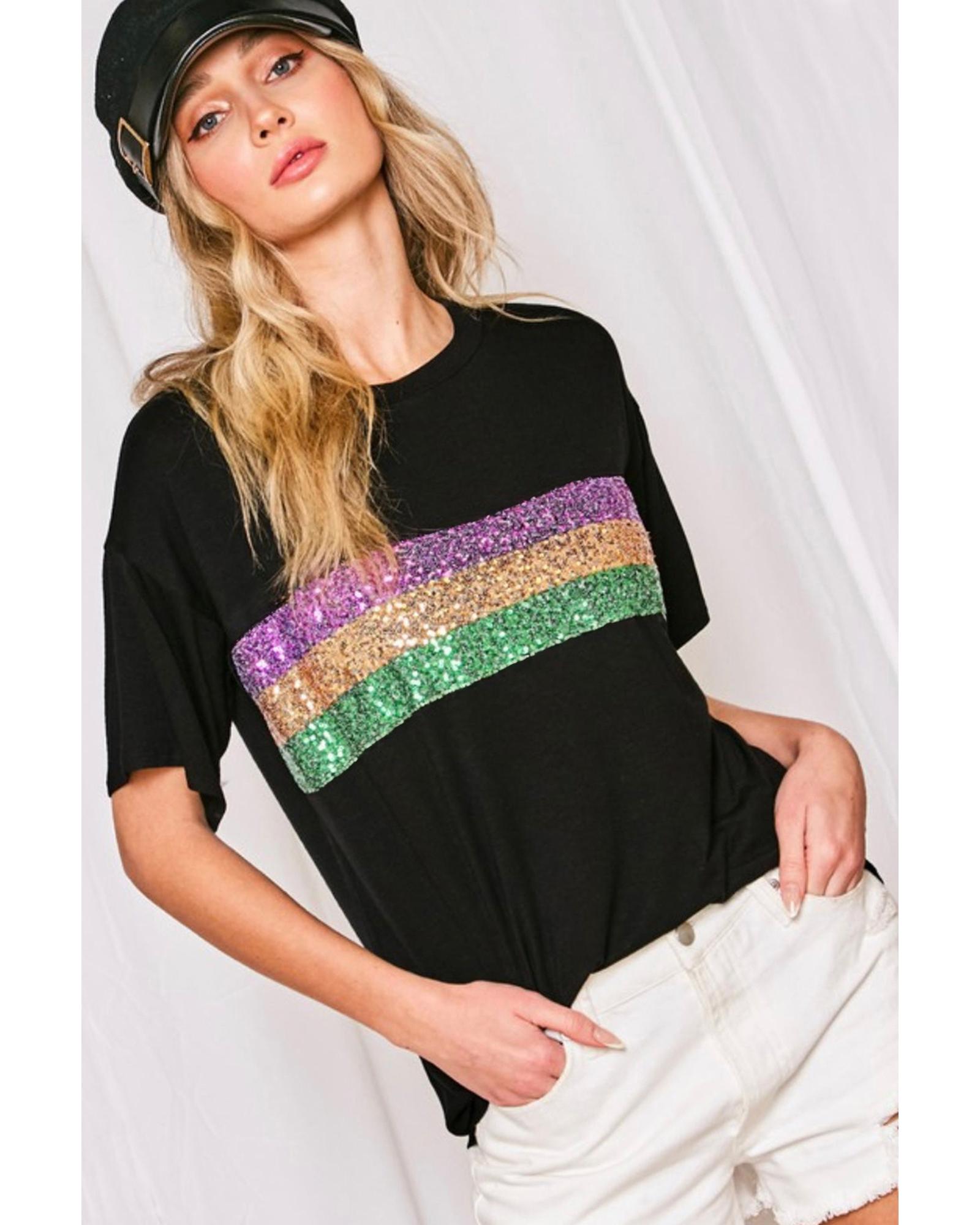 - Black Sequin Stripes Patchwork Mardi Gras Crew Neck T