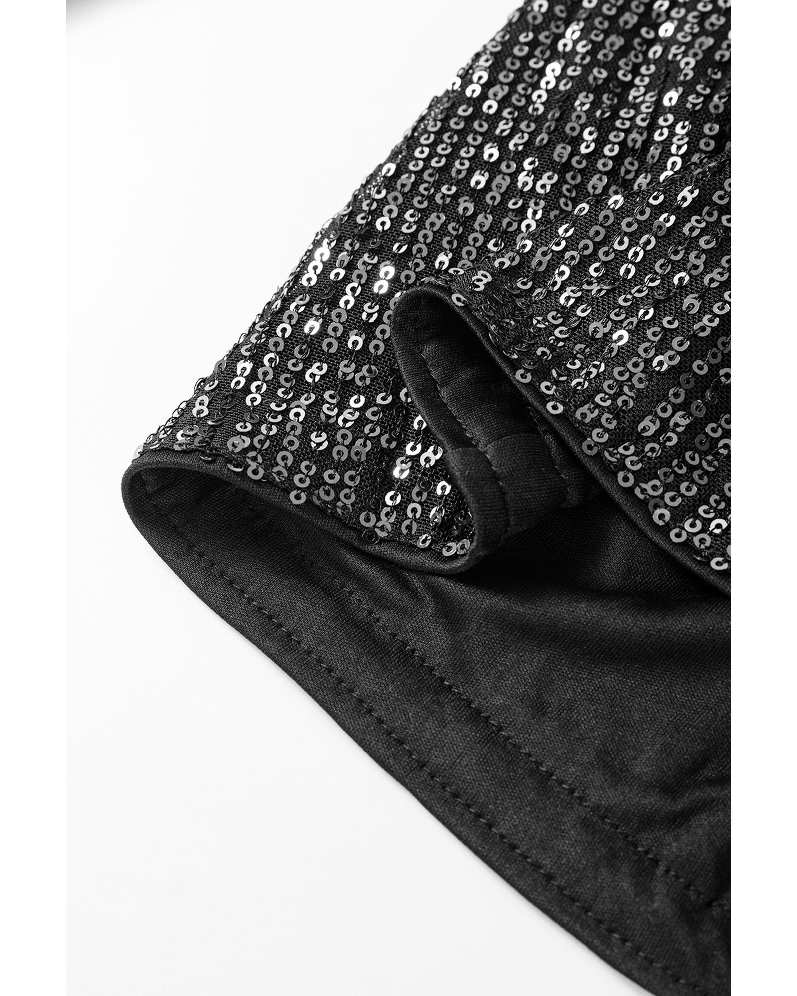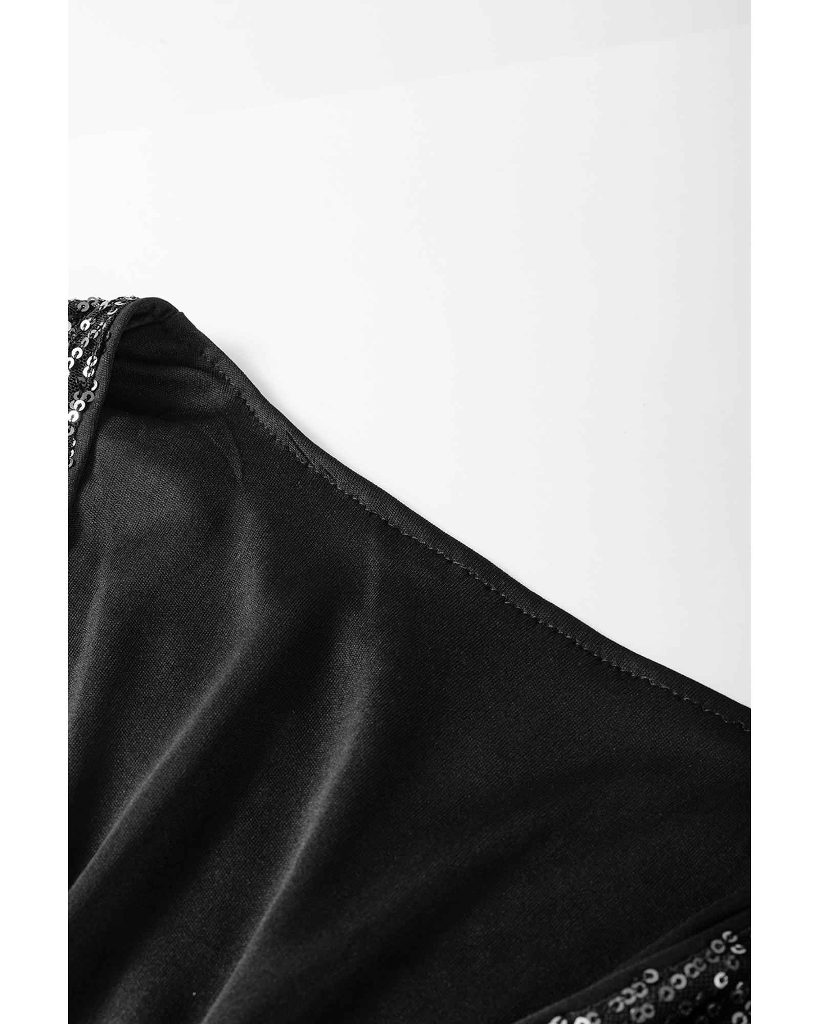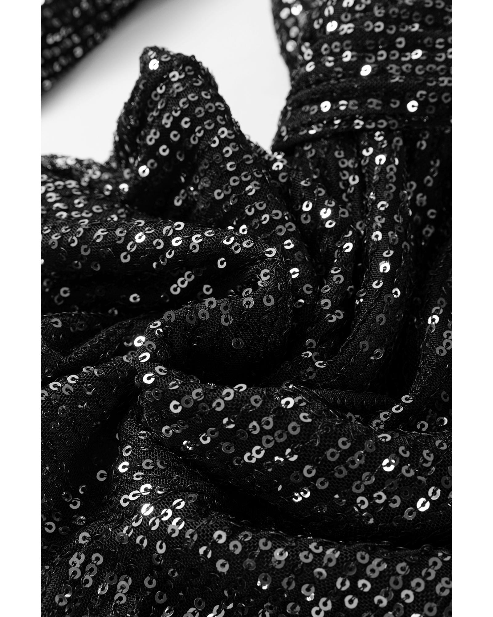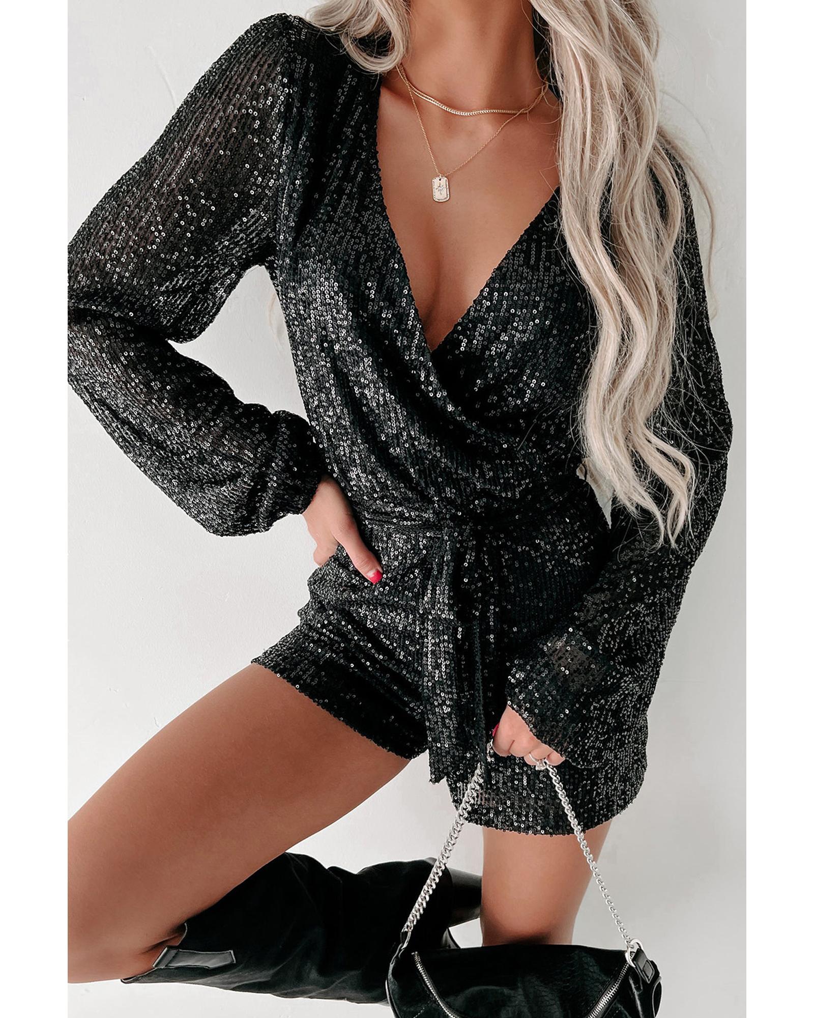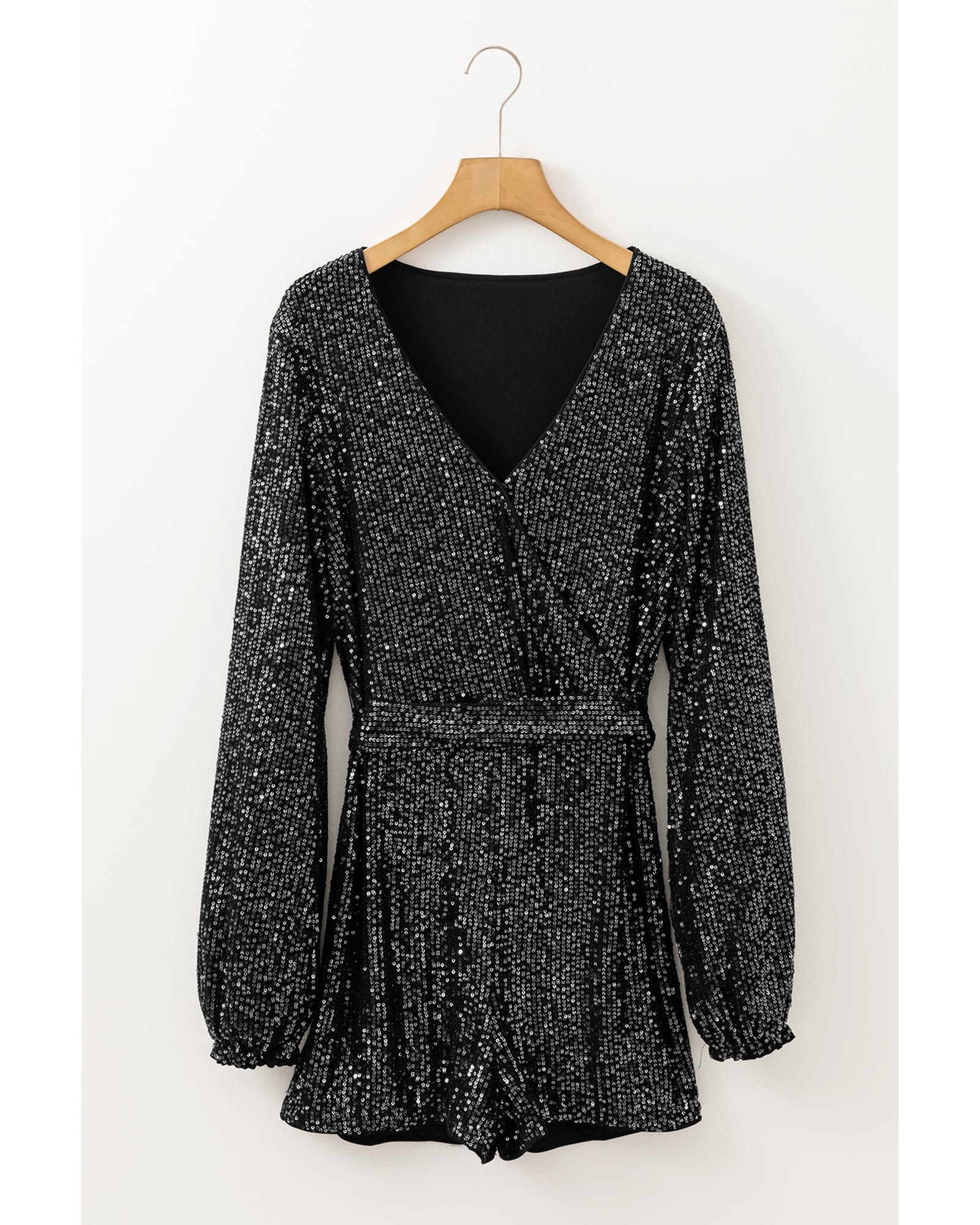 Black Sequined V Neck Wrapped Long Sleeve Romper – XL