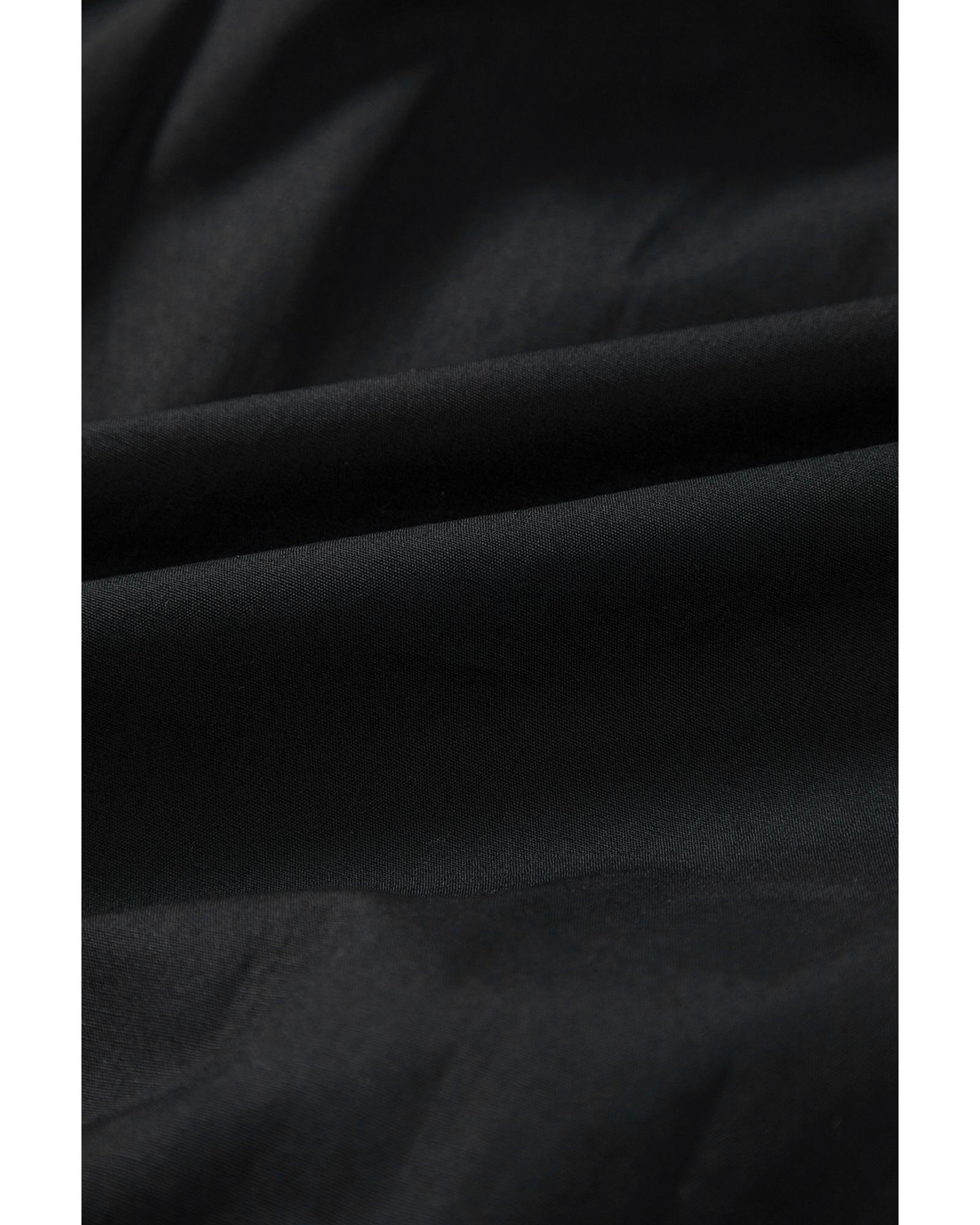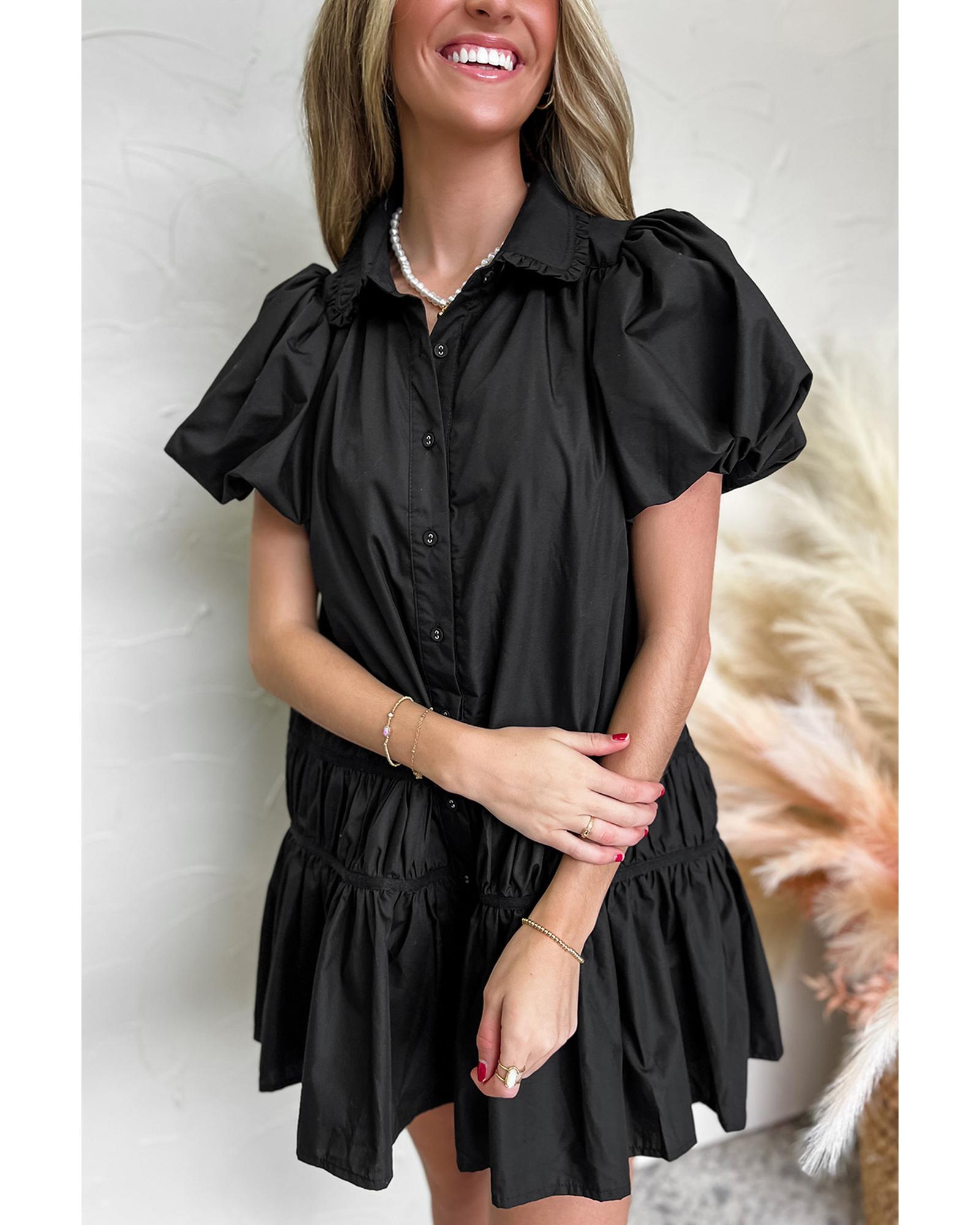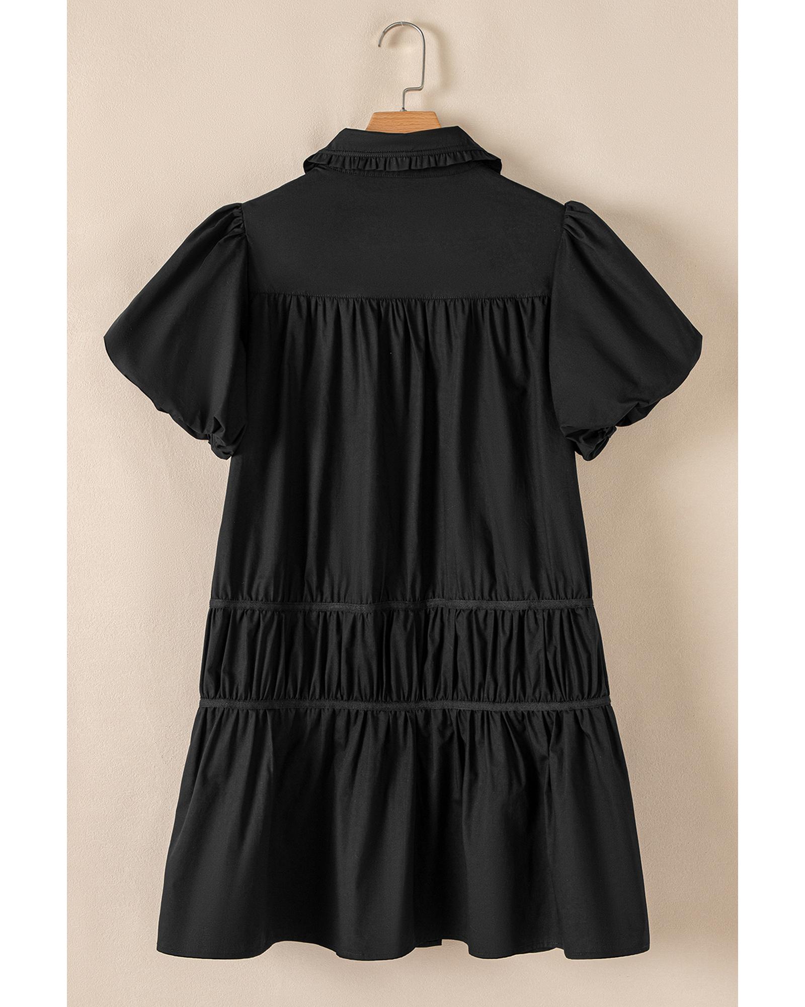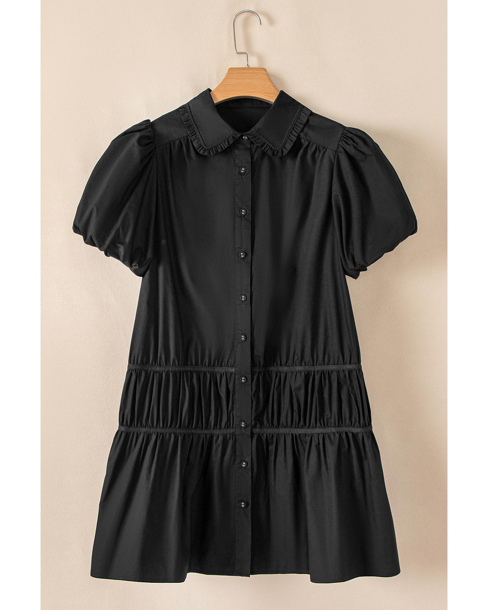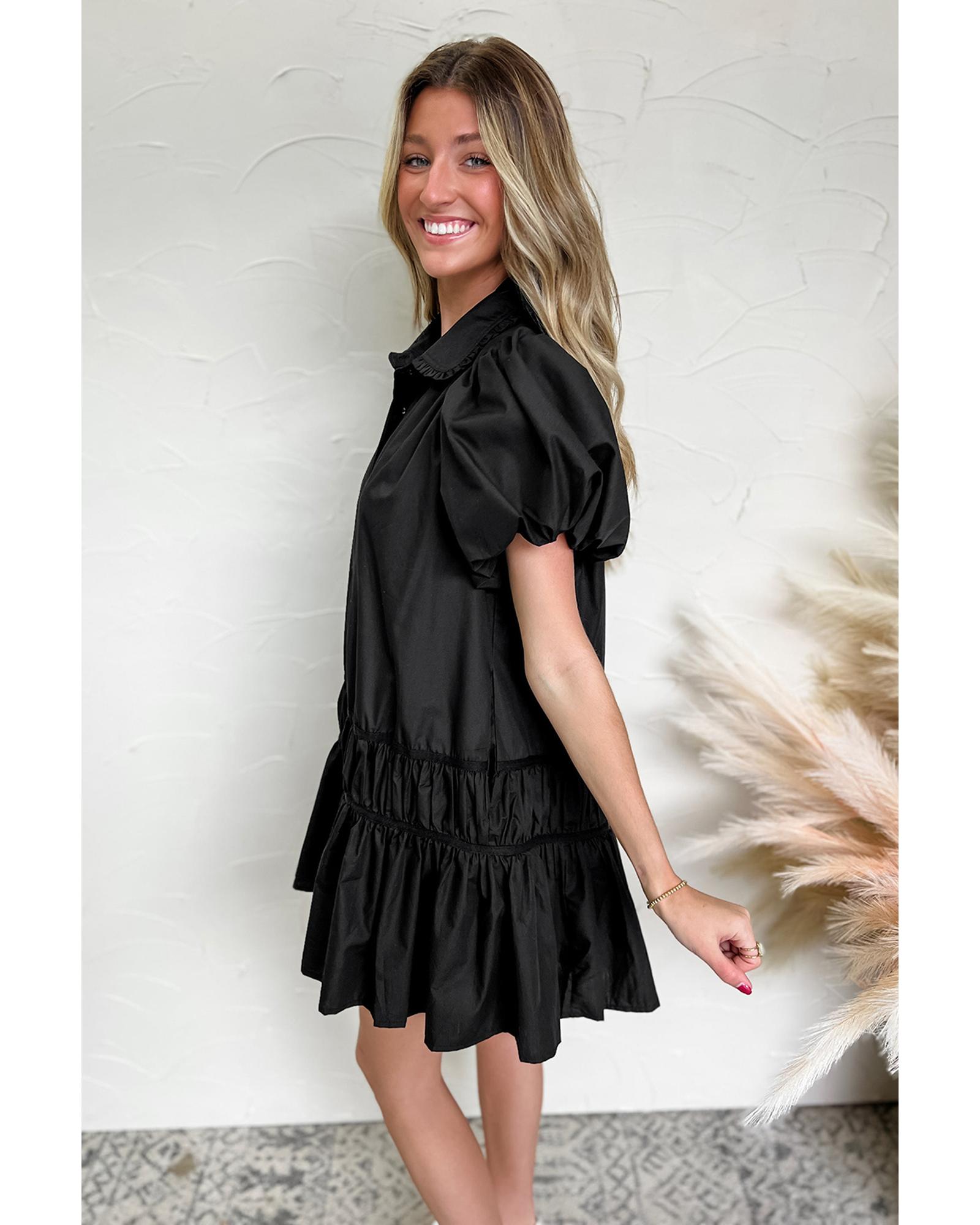 Black Shirt Style Button Down Puff Sleeve Ruffle Hem Dress – L