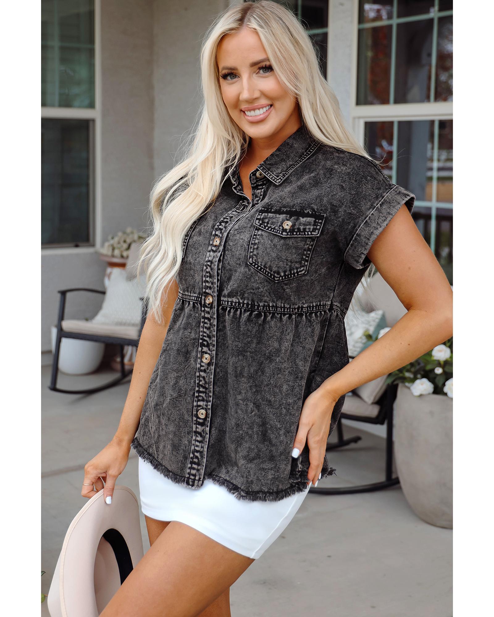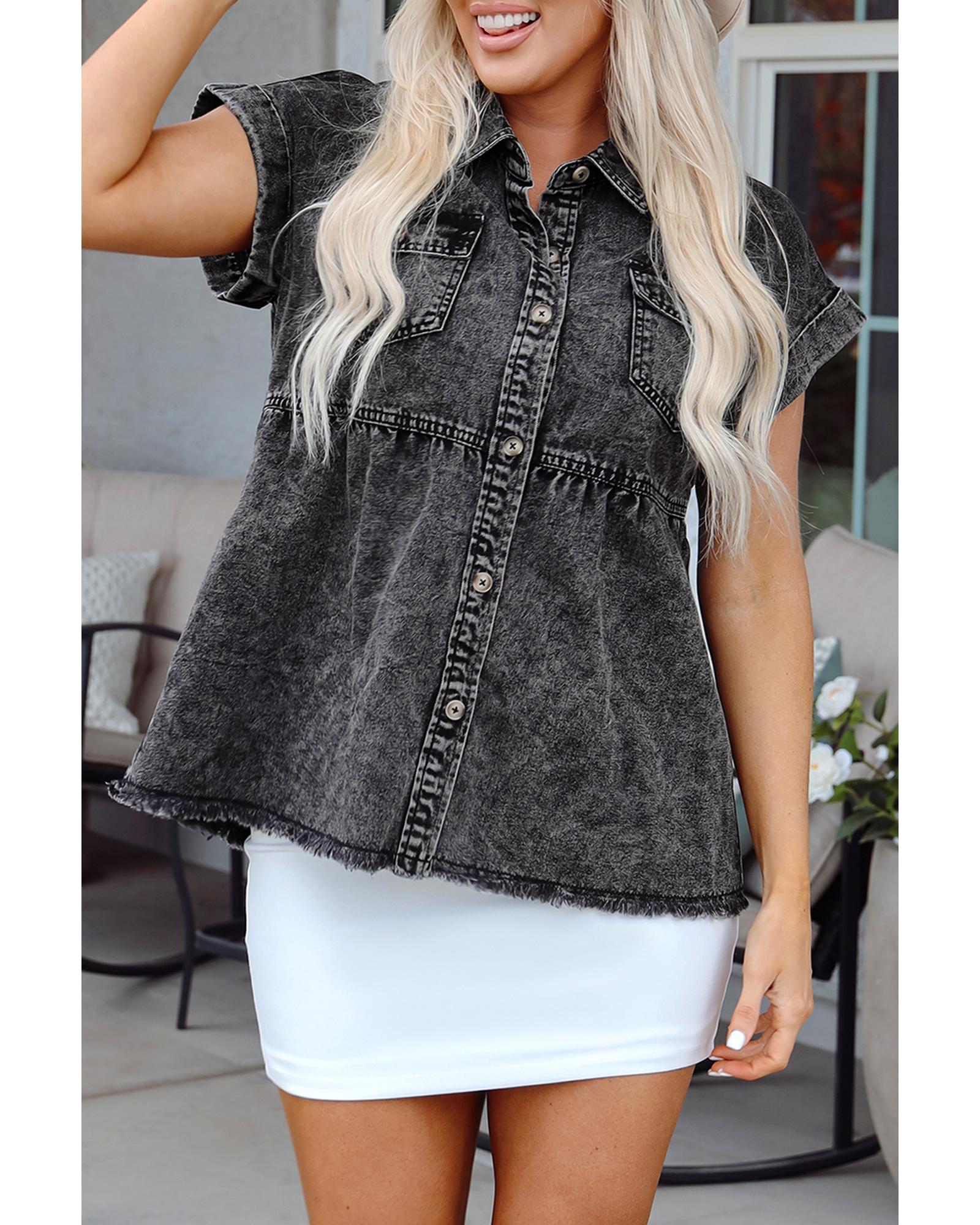 Black Short Sleeve Flap Pocket Button Up Raw Hem Denim Shirt – XL