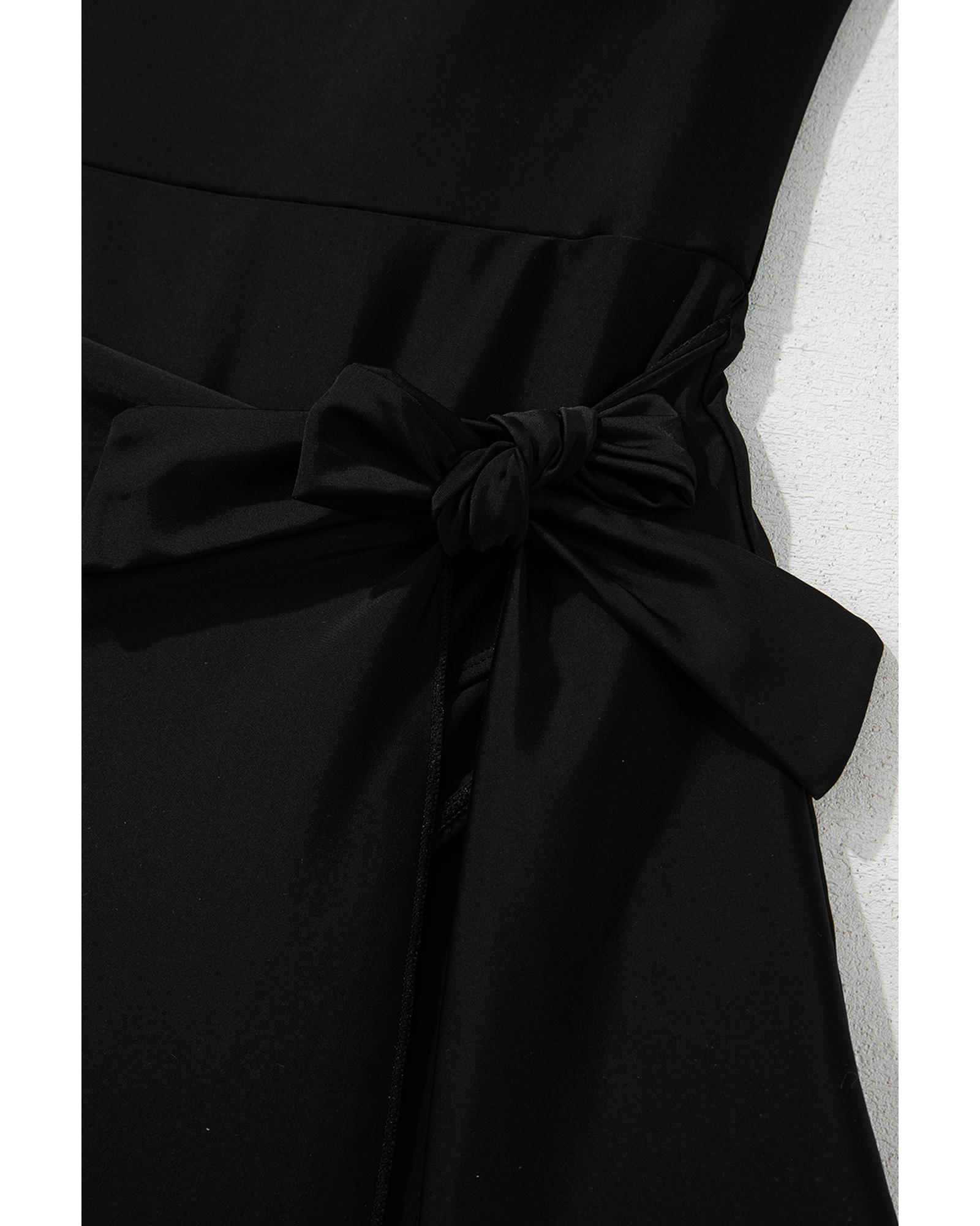 Black Side Tied Waist Square Neck Adjustable Straps A-line One Piece Swim Dress – L