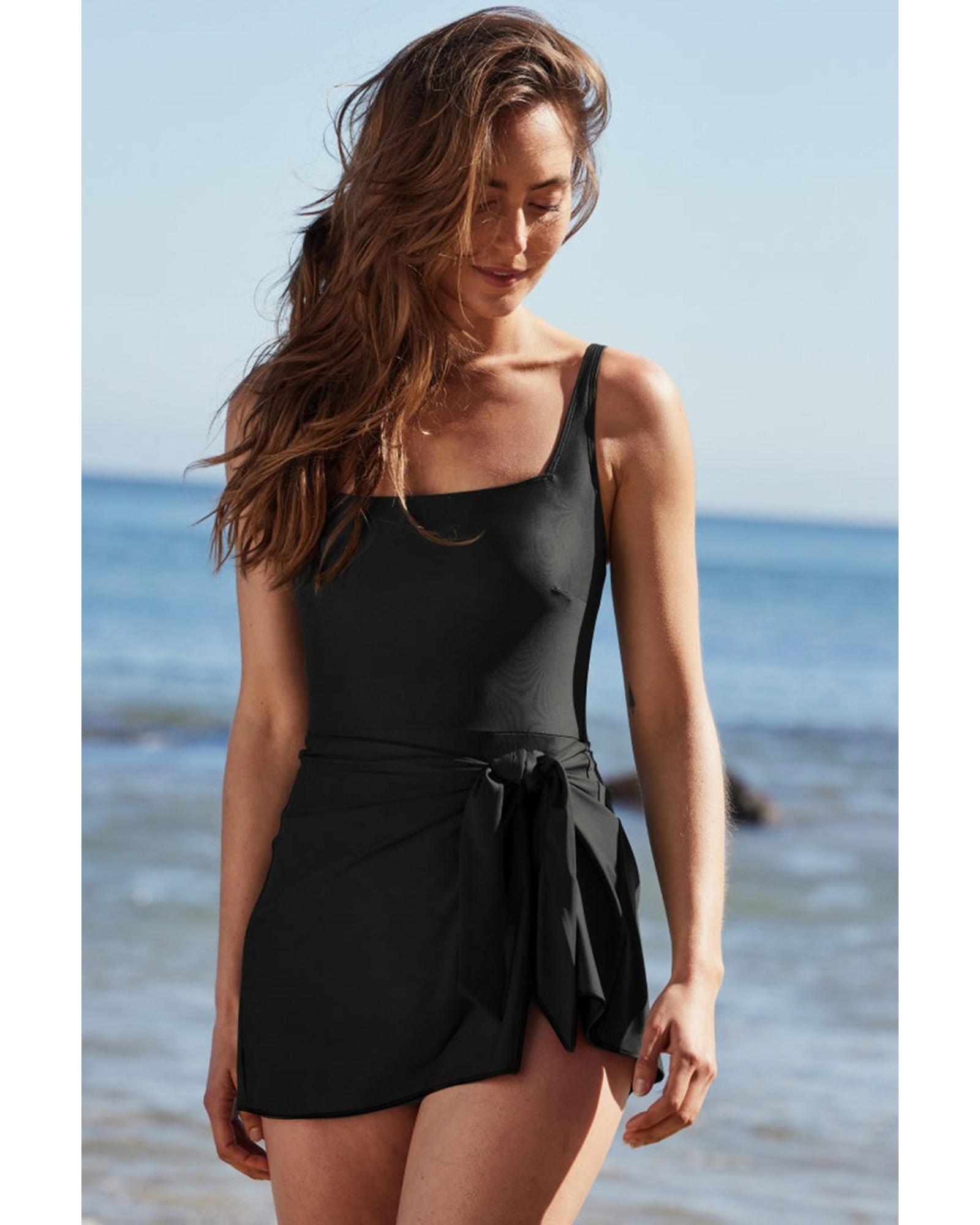 Black Side Tied Waist Square Neck Adjustable Straps A-line One Piece Swim Dress – XL