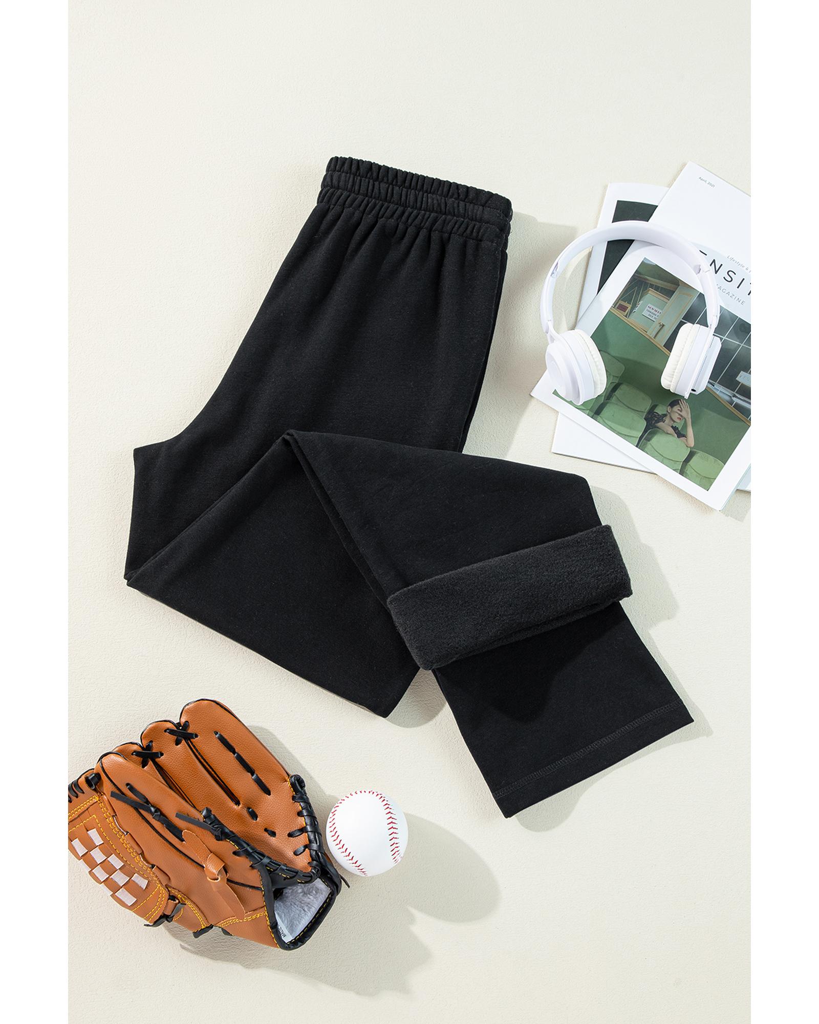 Black Solid Color Fleece Lined Drawstring Waist Casual Pants – S