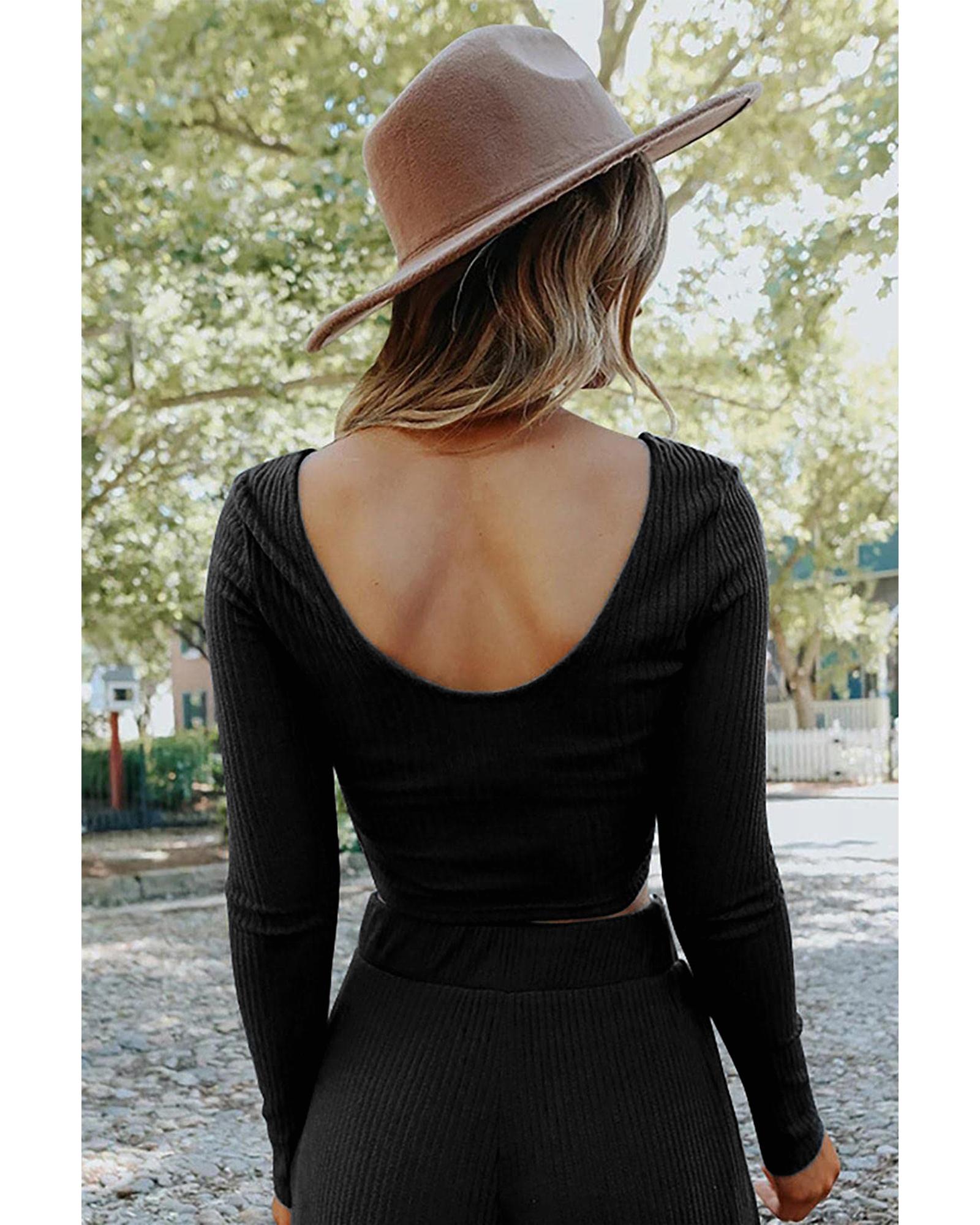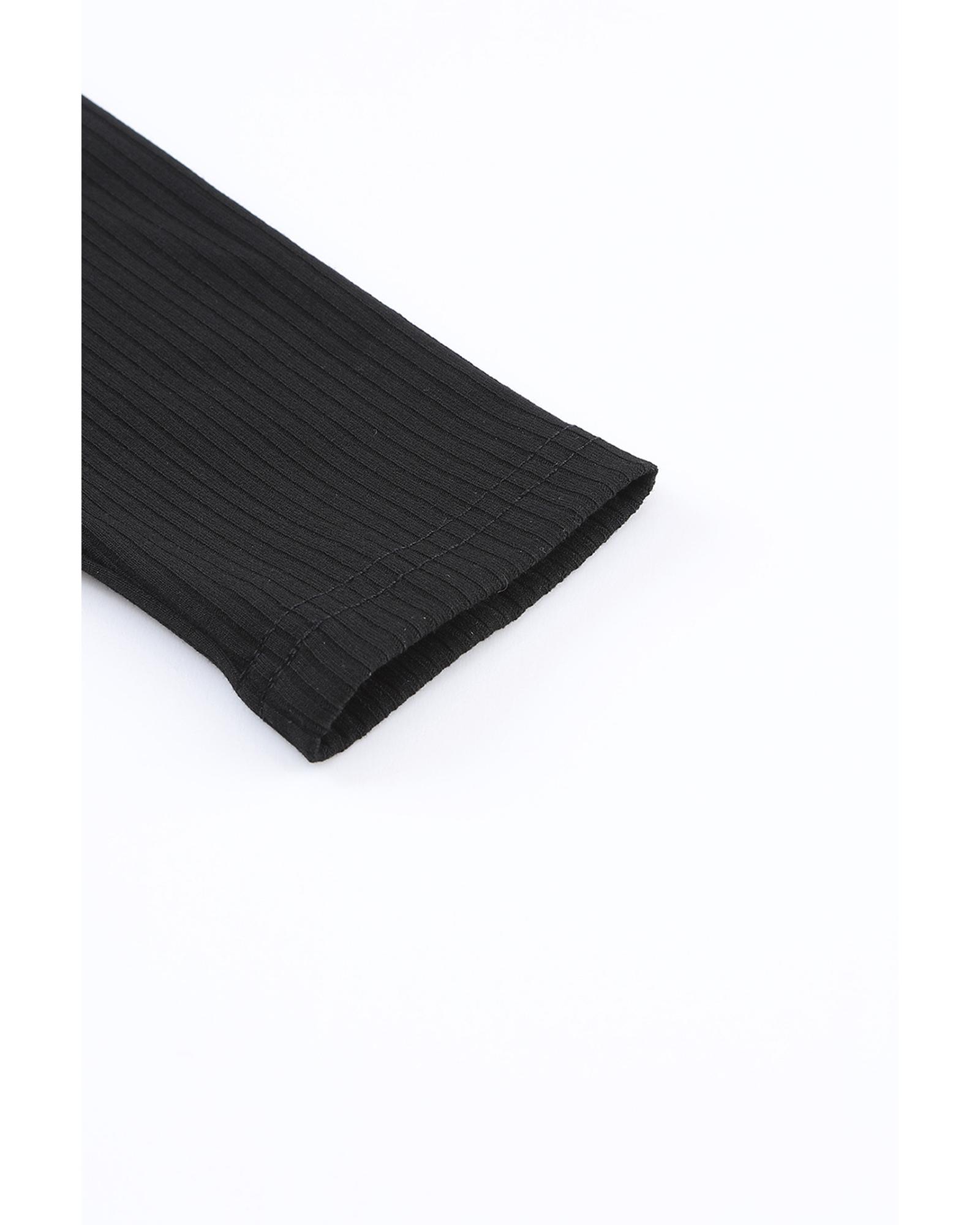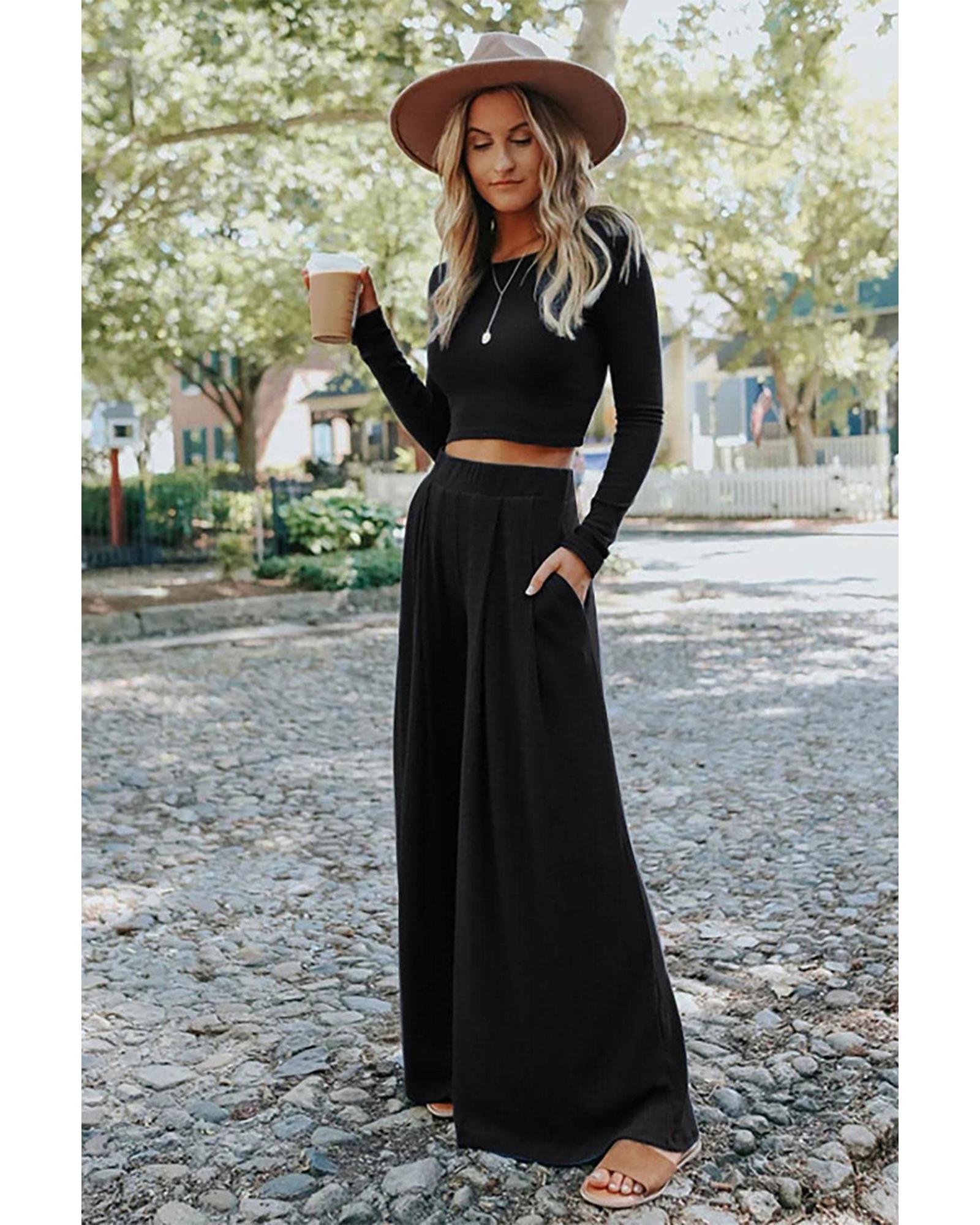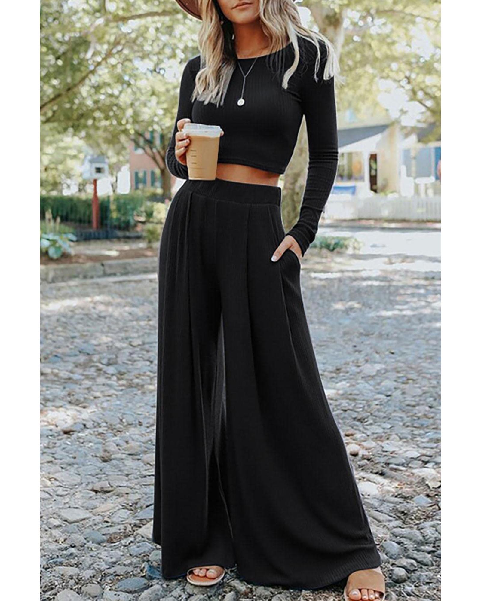 Black Solid Color Ribbed Crop Top Long Pants Set – XL
